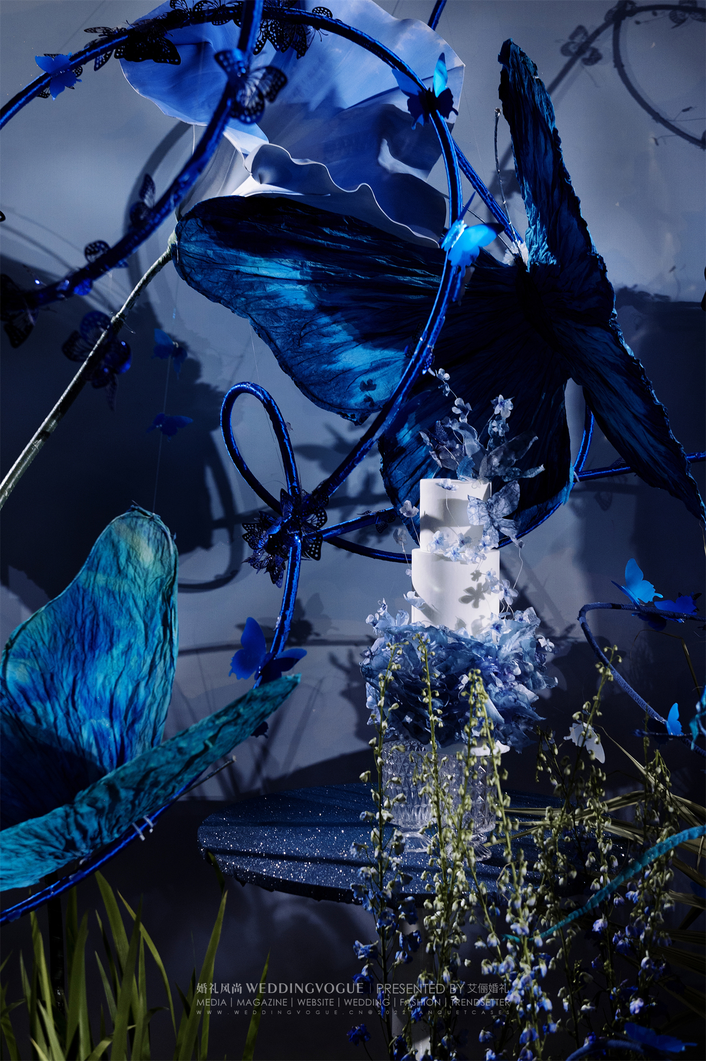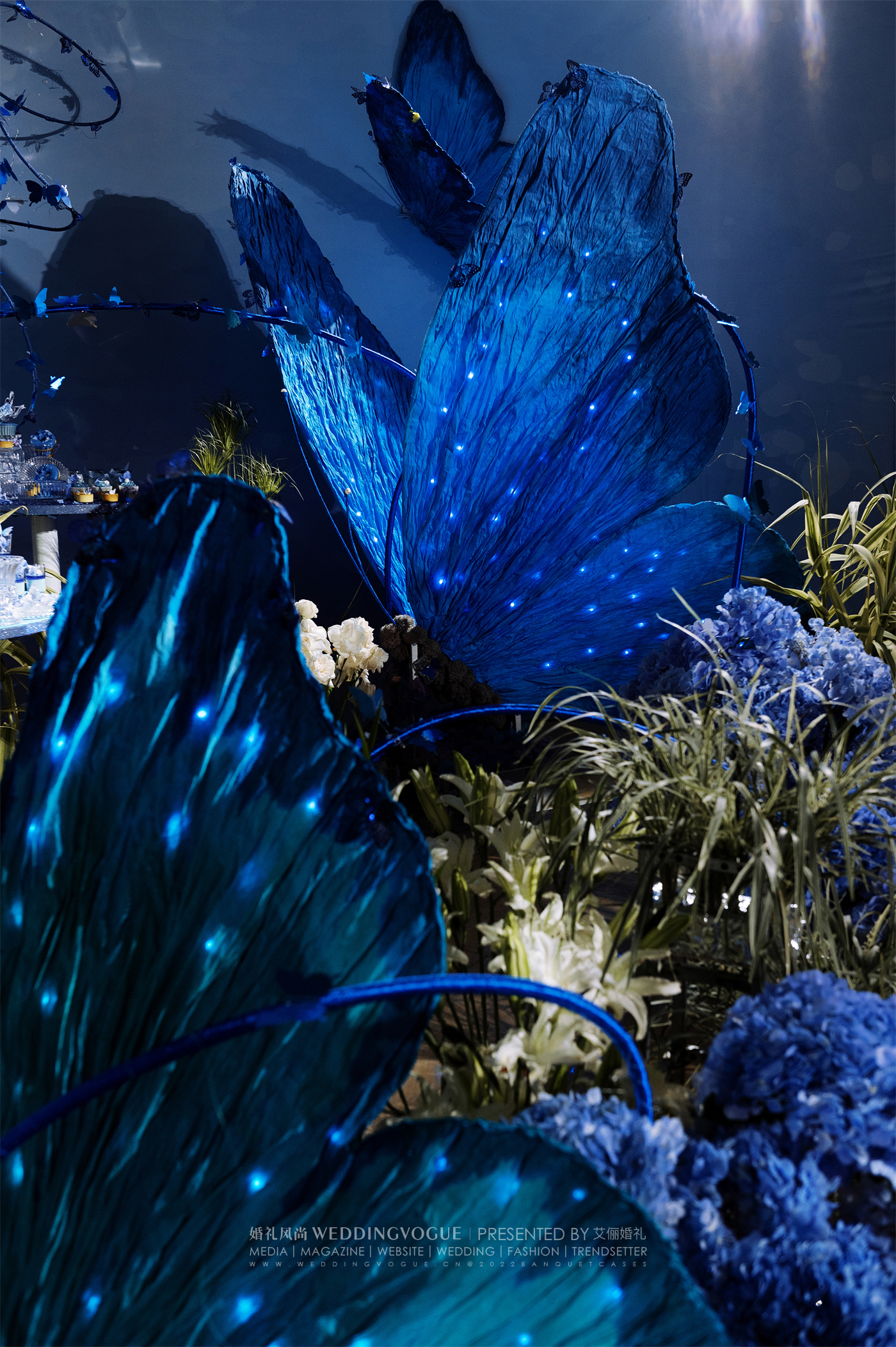 说回大蝴蝶,染成深蓝渐变色的纸张粘附在弯曲造型的铁艺骨架上,构成了一对栩栩如生的蝴蝶翅膀,翅膀上零星铺设的小灯则让翅膀更加灵动,让现场更添奇幻效果,美好而不张扬。