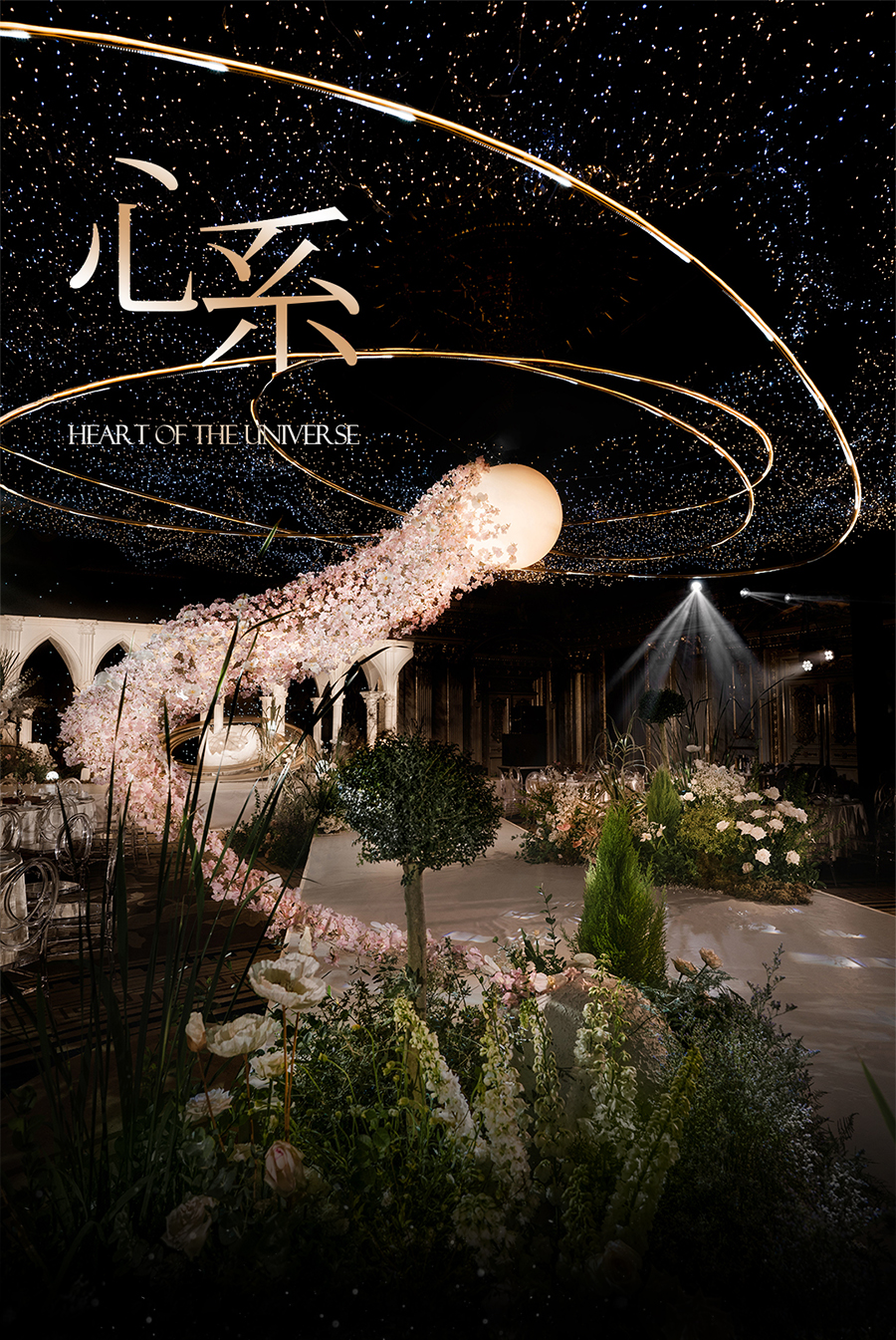 TuZeus最婚礼在宴会空间中打造出星罗棋布的宇宙,并通过线条的萦绕,在空间中营造出星际运行的的动感。由花卉托起的中心星球,更在科幻中增加了一份“迪士尼”的童话美感。