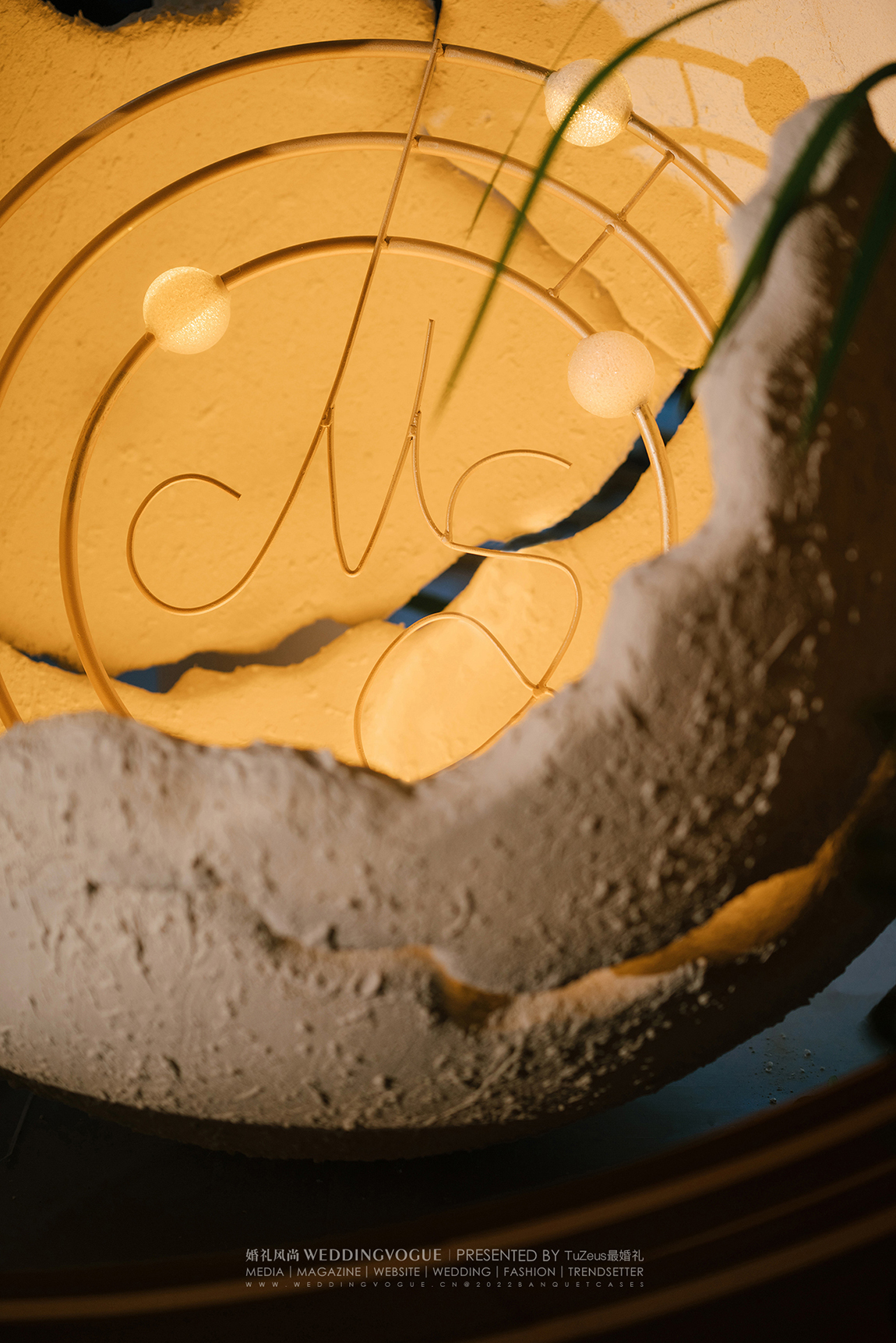 在细节表述上,TuZeus最婚礼从星盘运行中提取灵感,制作成两人的婚礼logo,并选取具有砂砾质感的材质模拟请求表明的质感。