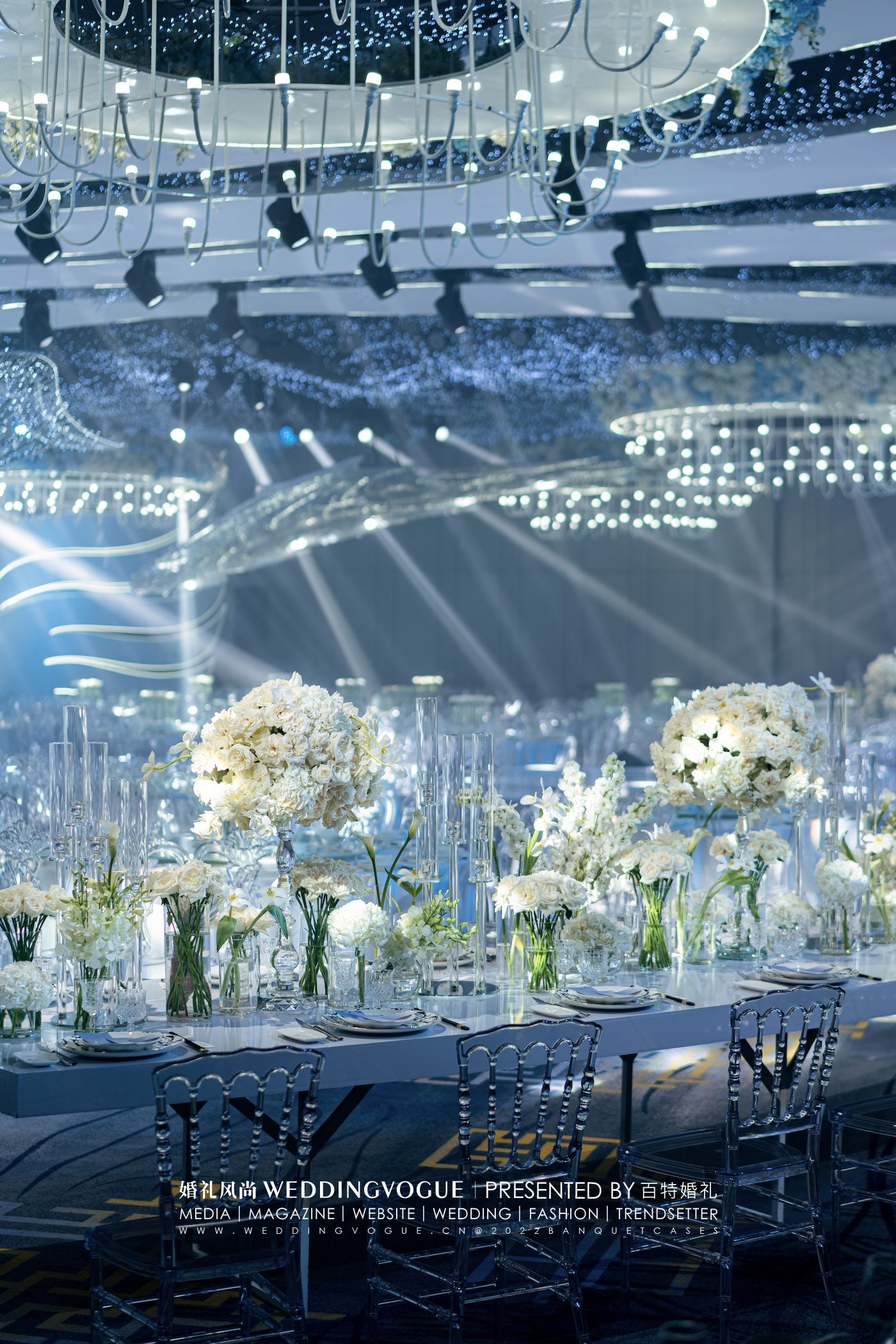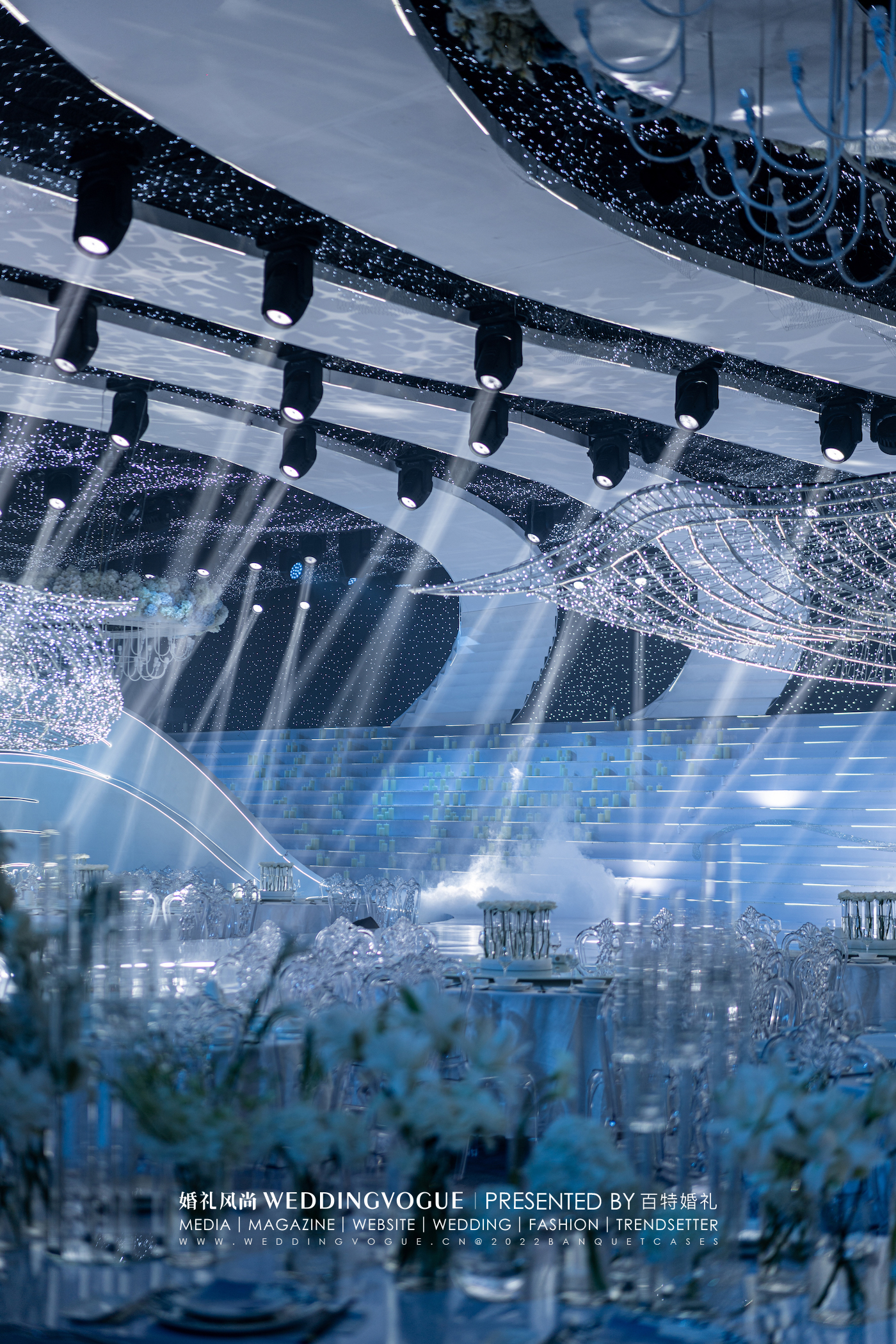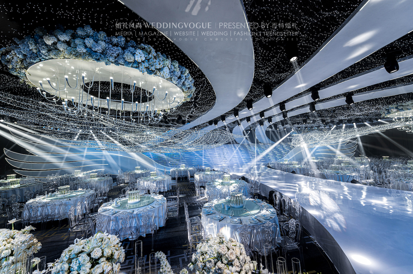 当越来越多的光束灯亮起,整个宴会厅都被点亮,皓月白与琉璃蓝的色彩交织,给人一点发端于视觉的寒意,却也在浪漫大气的婚礼氛围下相形见绌。无论如何,出于原始的情感本能,在婚礼里的人们大都是热情洋溢的,更何况婚礼场景美到失语。