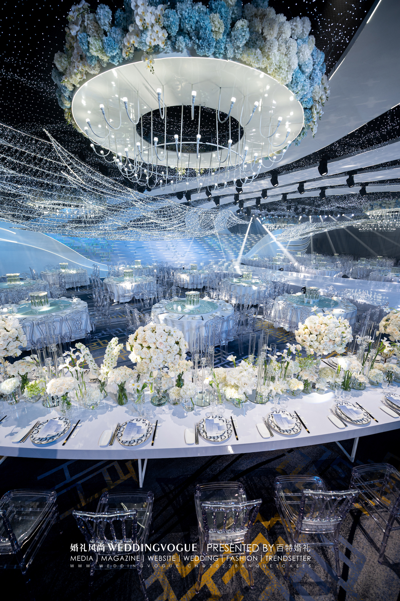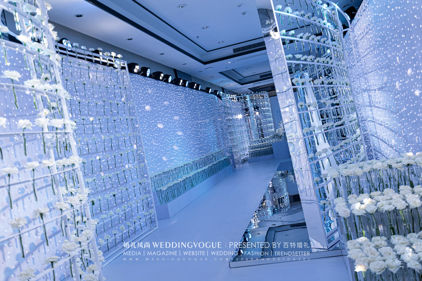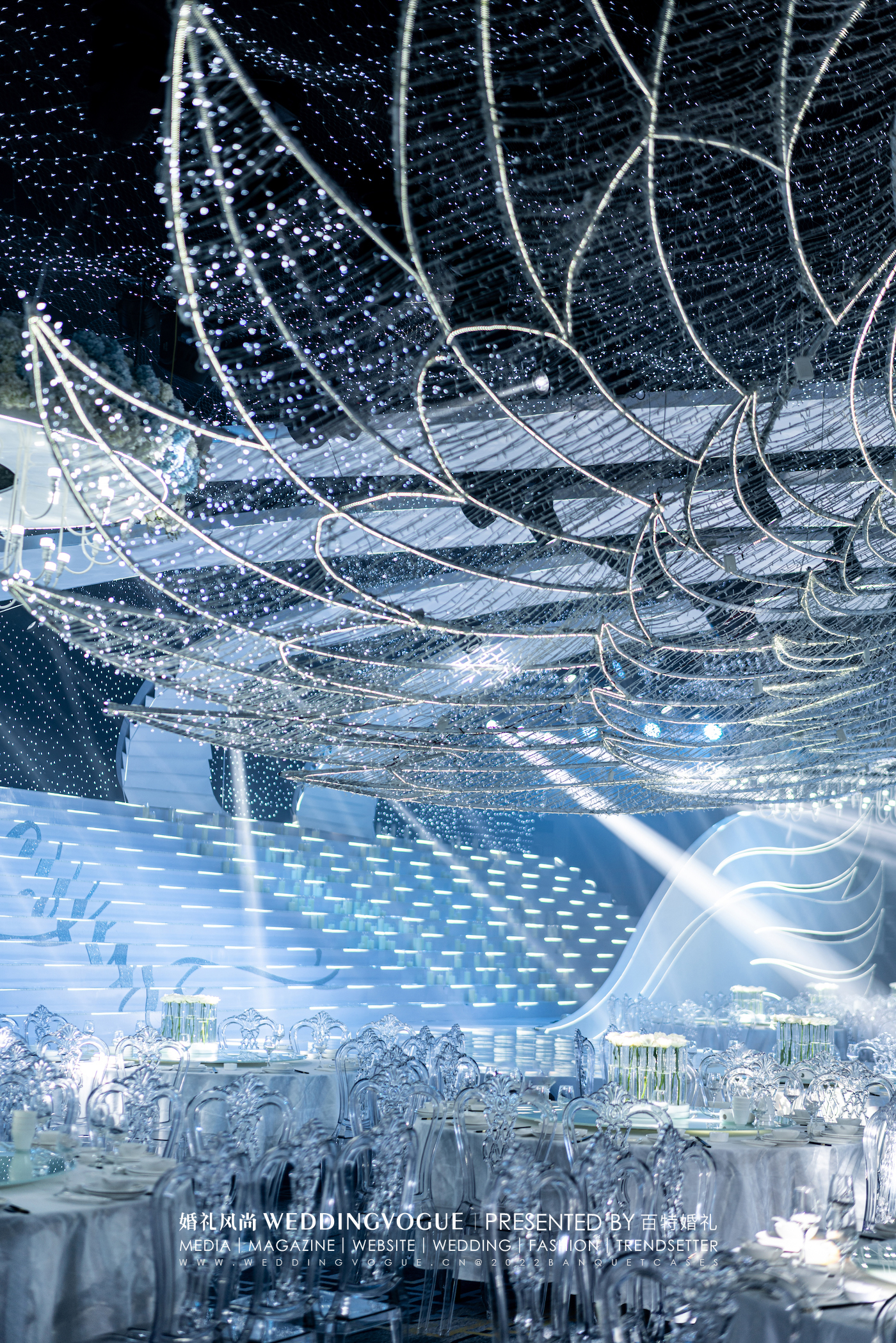 当越来越多的光束灯亮起,整个宴会厅都被点亮,皓月白与琉璃蓝的色彩交织,给人一点发端于视觉的寒意,却也在浪漫大气的婚礼氛围下相形见绌。无论如何,出于原始的情感本能,在婚礼里的人们大都是热情洋溢的,更何况婚礼场景美到失语。