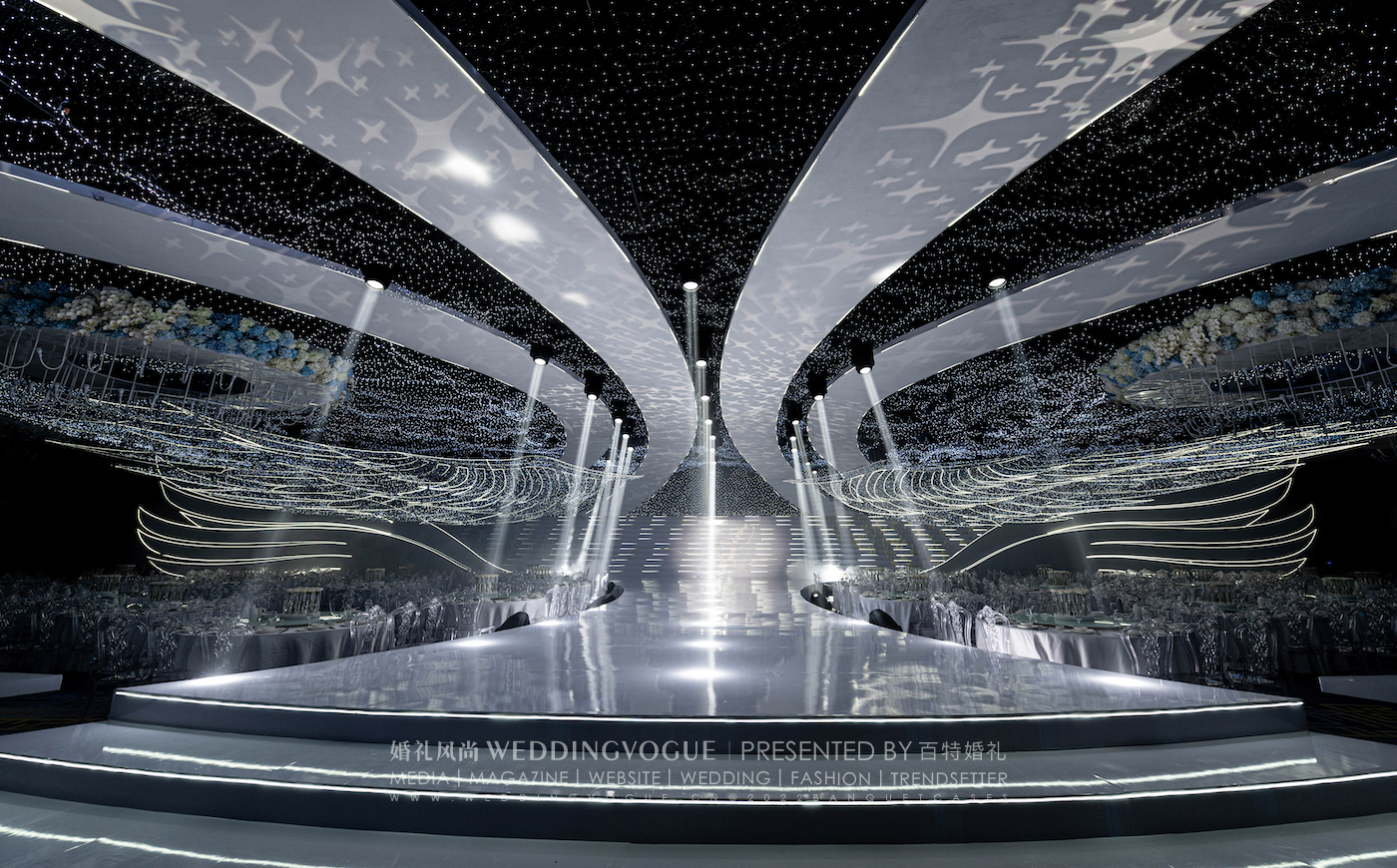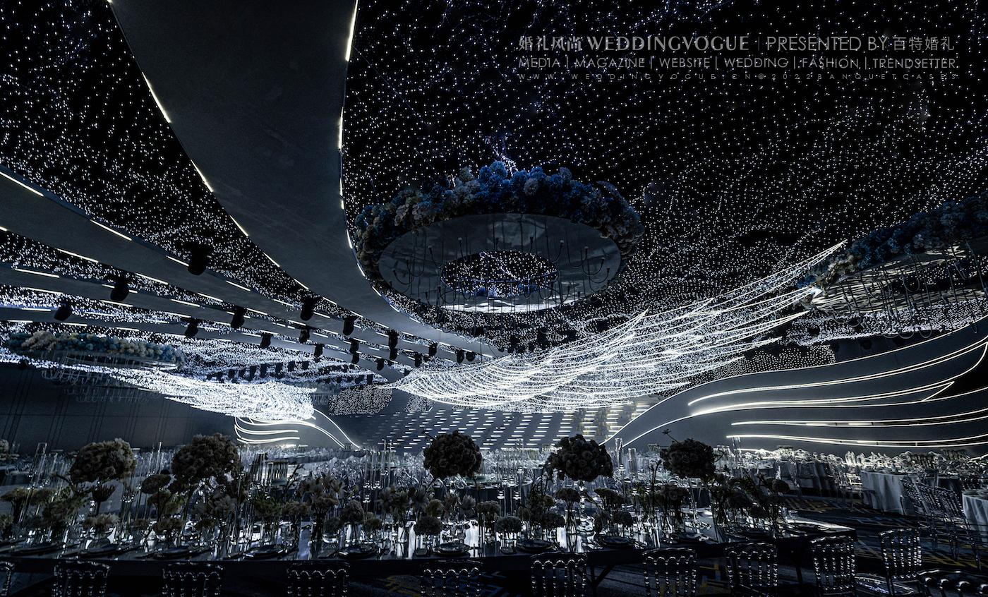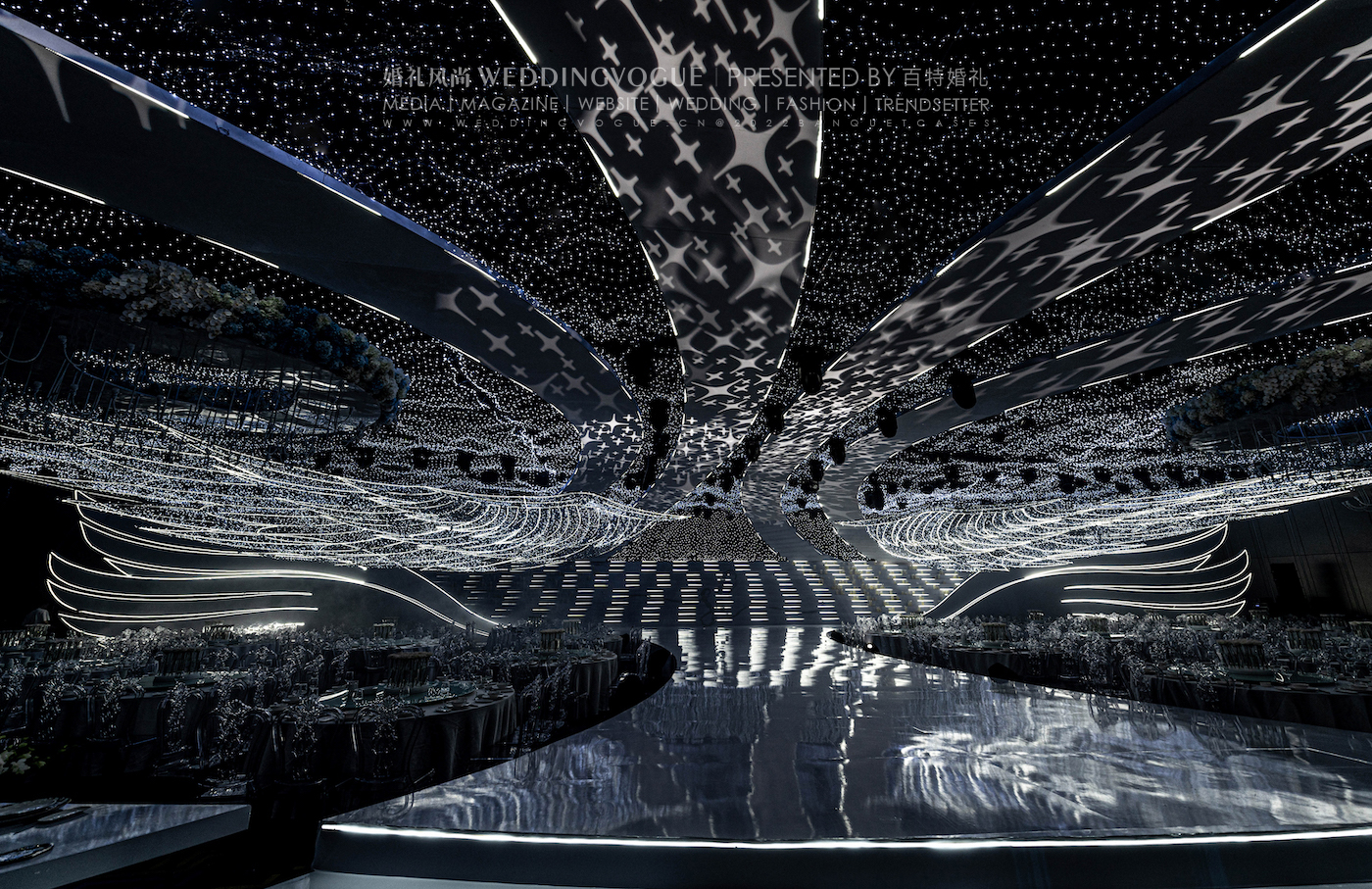 结合新人的喜好想法和想象,「百特婚礼」用星空和羽翼元素,在宴会厅里呈现了最最直观的宇宙星空。深邃与幽暗不可触碰,光芒与星辰触手可及。