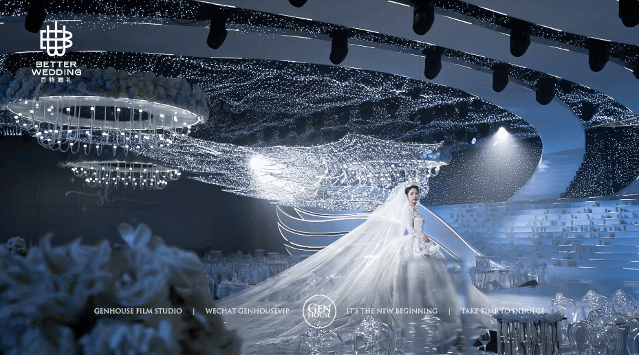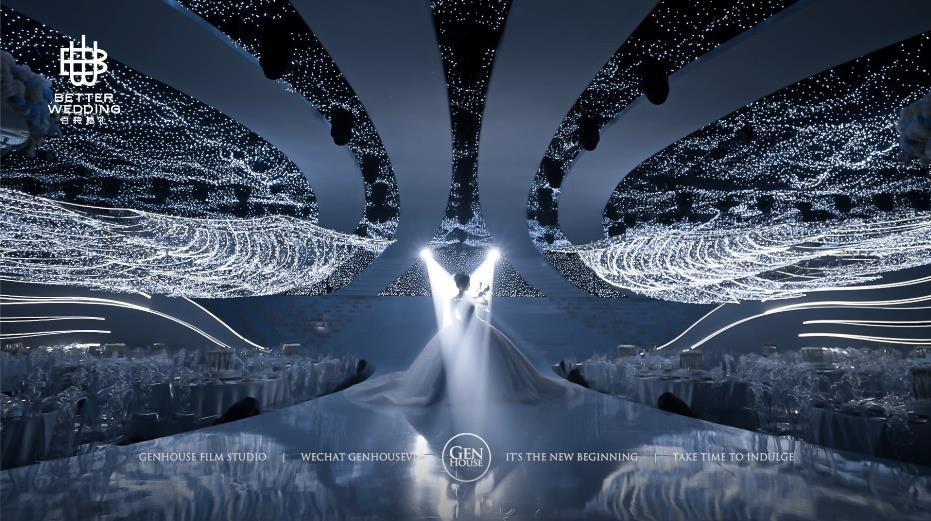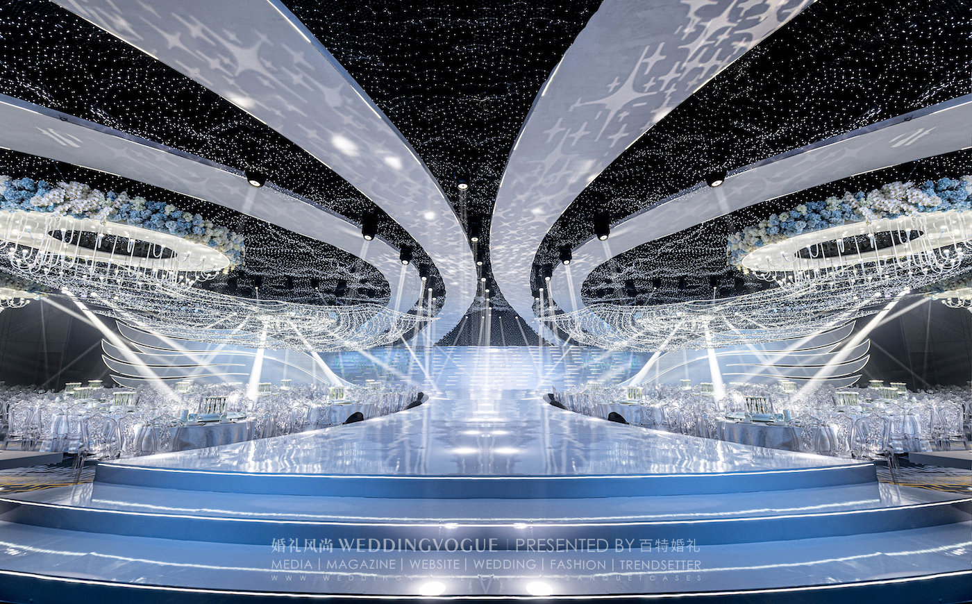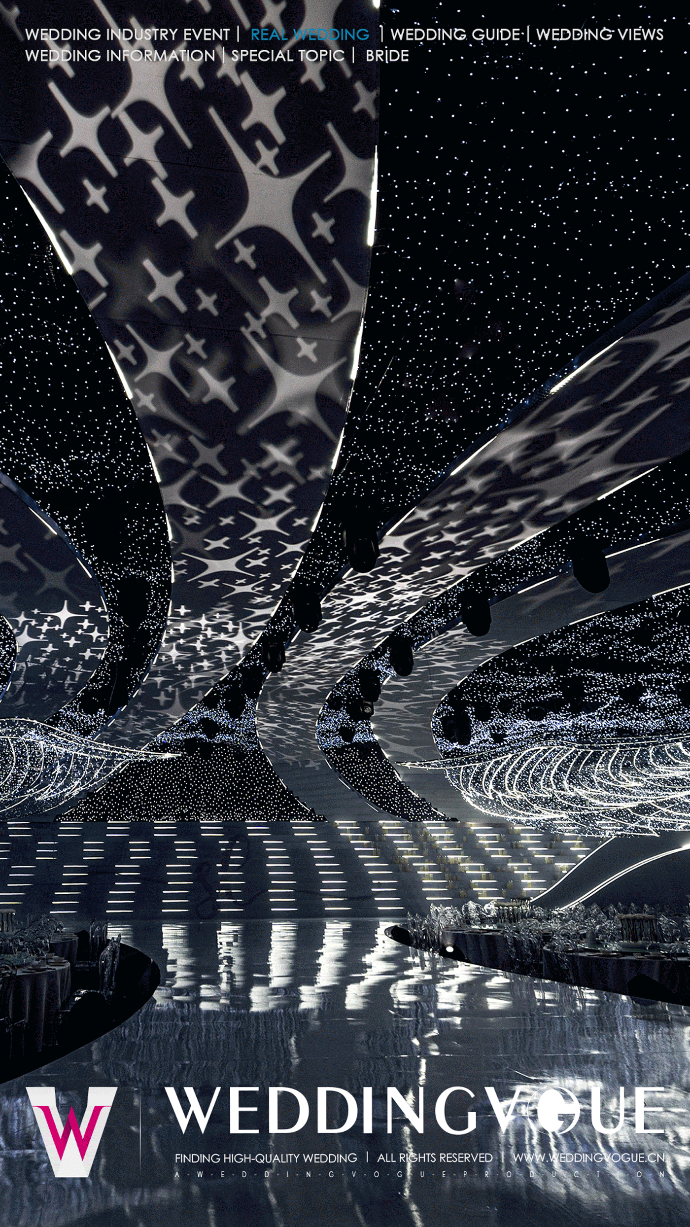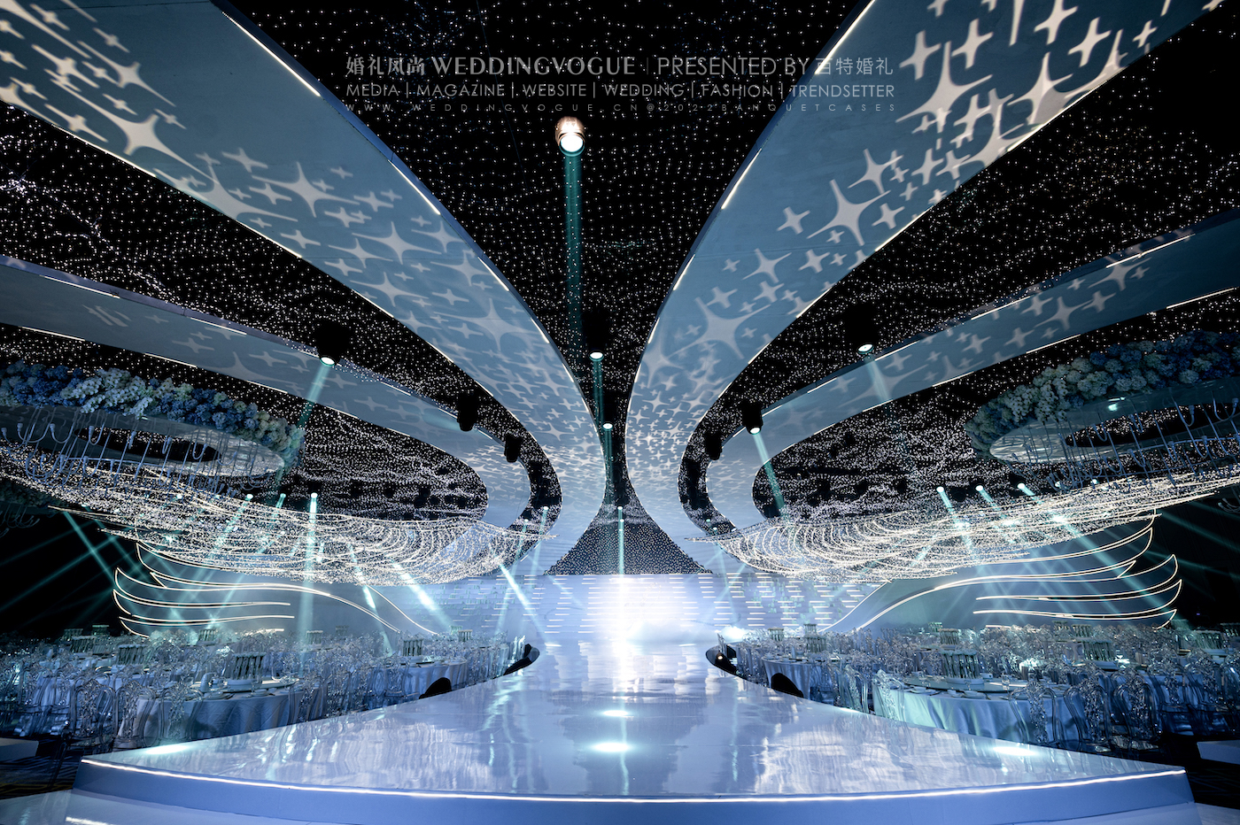 结合新人的喜好想法和想象,「百特婚礼」用星空和羽翼元素,在宴会厅里呈现了最最直观的宇宙星空。深邃与幽暗不可触碰,光芒与星辰触手可及。