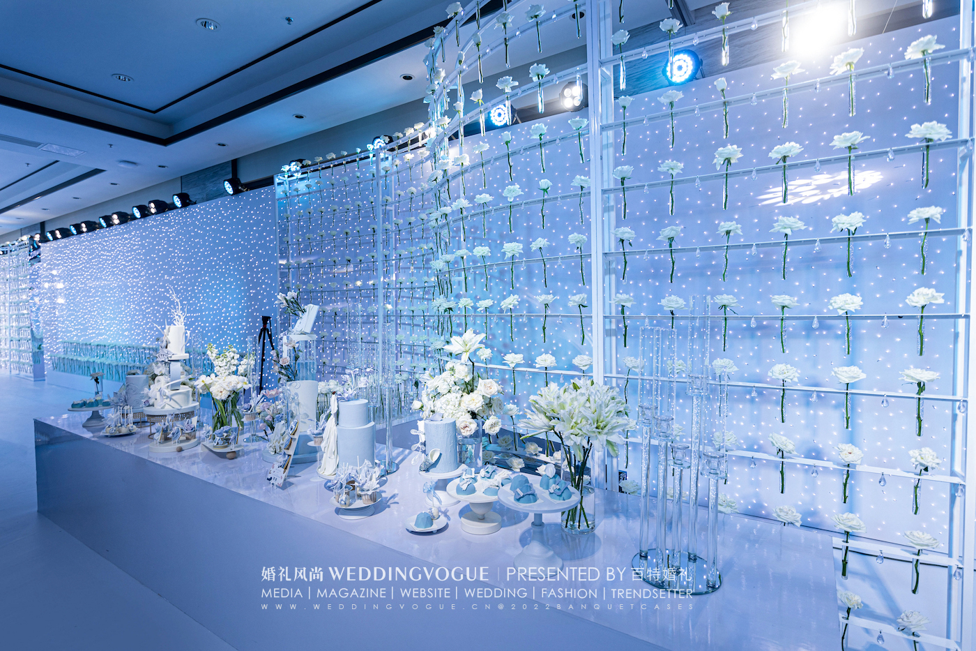 在众多的圆桌外围,以具有一定弧度的长条桌由内而外将整个宴饮区贯穿成整体,呈现别具一格的布局之美。花艺则选用了与主色调一致的白蓝色,鲜花在水的滋养下生机盎然,使宽阔的宴会厅不至于显得沉闷辽远。