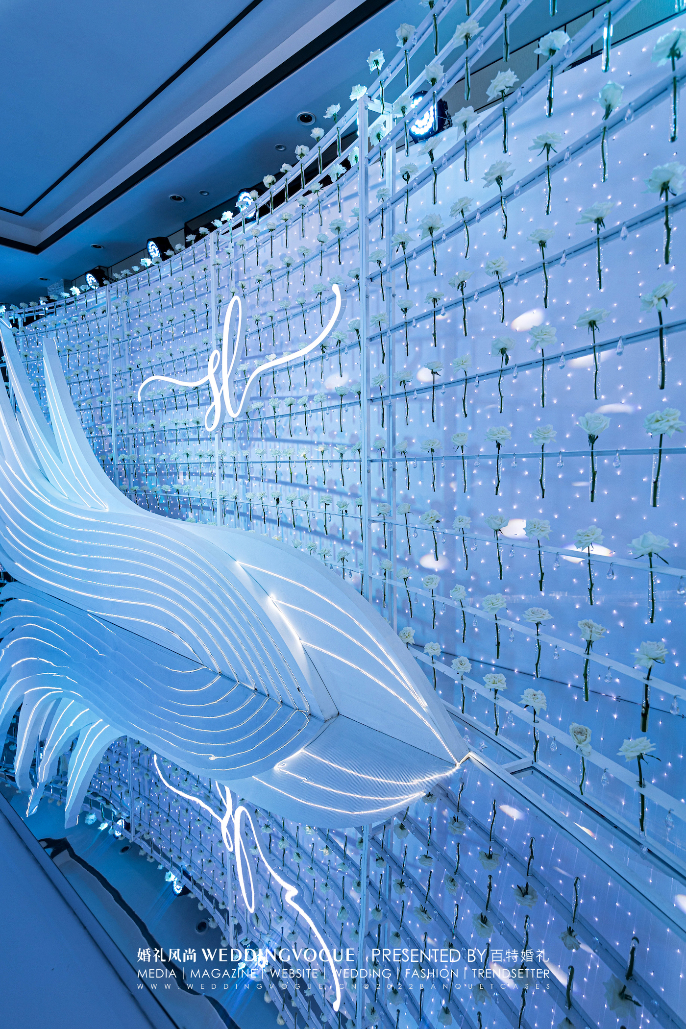 在进入宴会厅的通道里,也有线条勾勒而成的实体的羽翼装置陈列在那里,通过镜面形成“实中有虚、虚中有实”的一对羽翼。更有成百上千支玫瑰有序陈列成特别的展架,表达着整场婚礼的奢华气质。