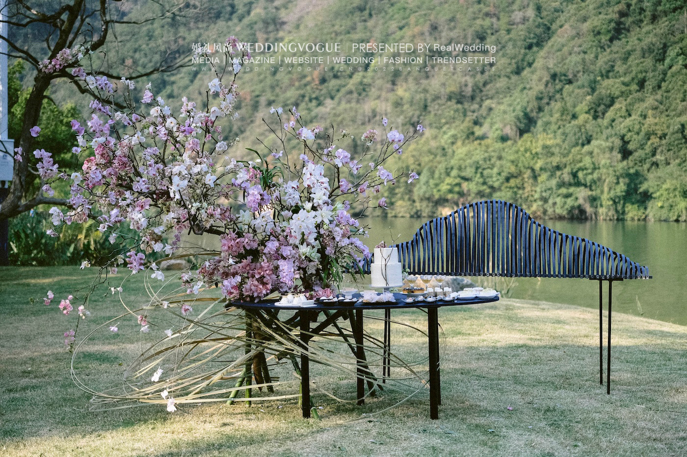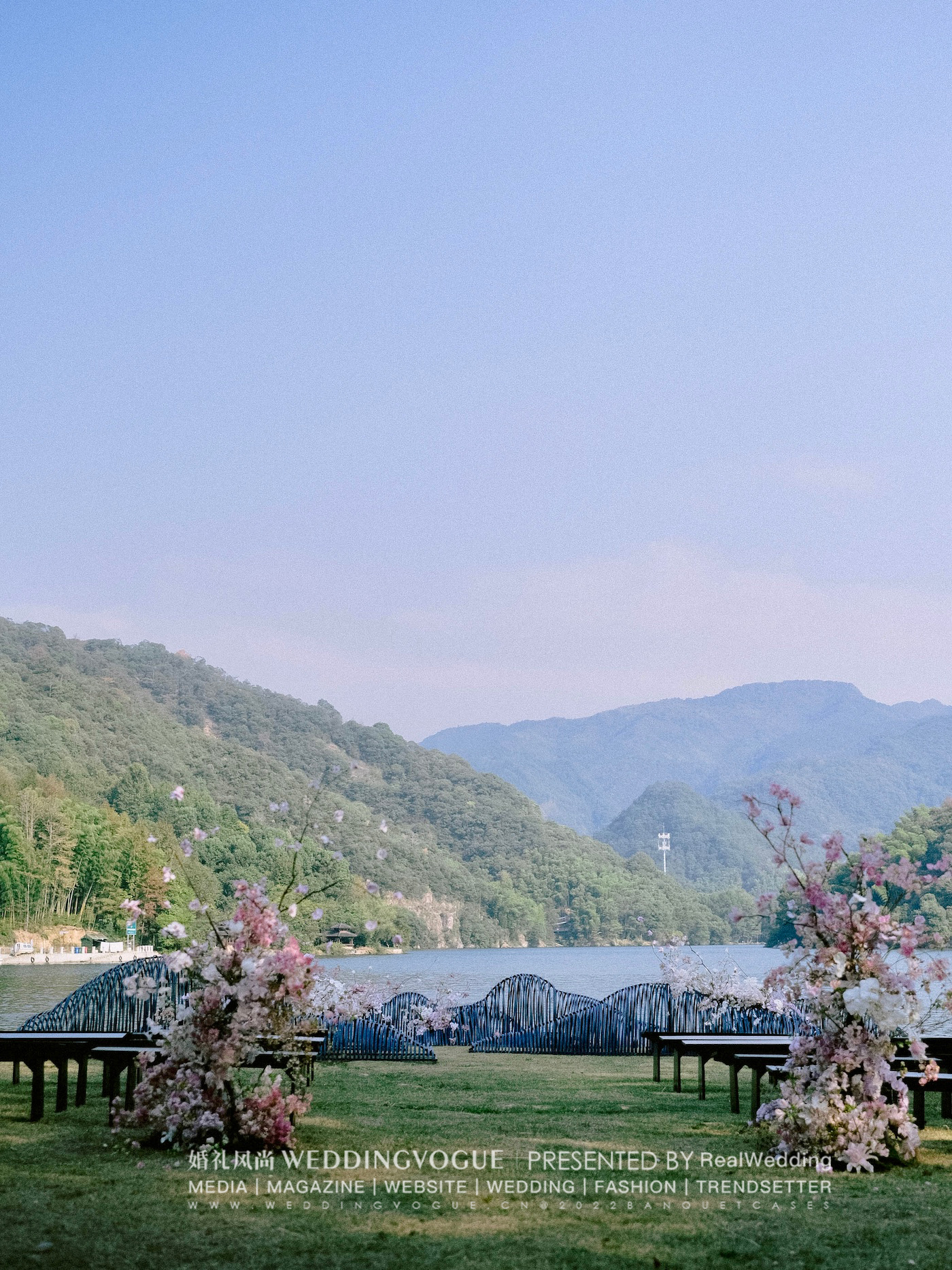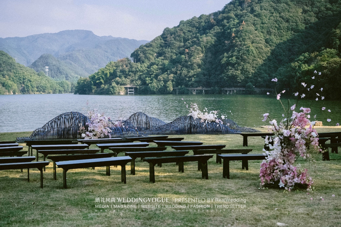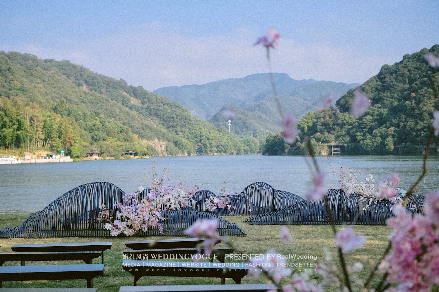 方寸之间,世俗之外,乘船方能抵达。婚礼团队REALWEDDING发挥他们营造意境之美的长项,以山为伴,以水为邻,新人提子和宇豪的婚礼如花朵般在这桃源方外绽放,亦如流水般在这安静的青山之间,缓缓流淌。