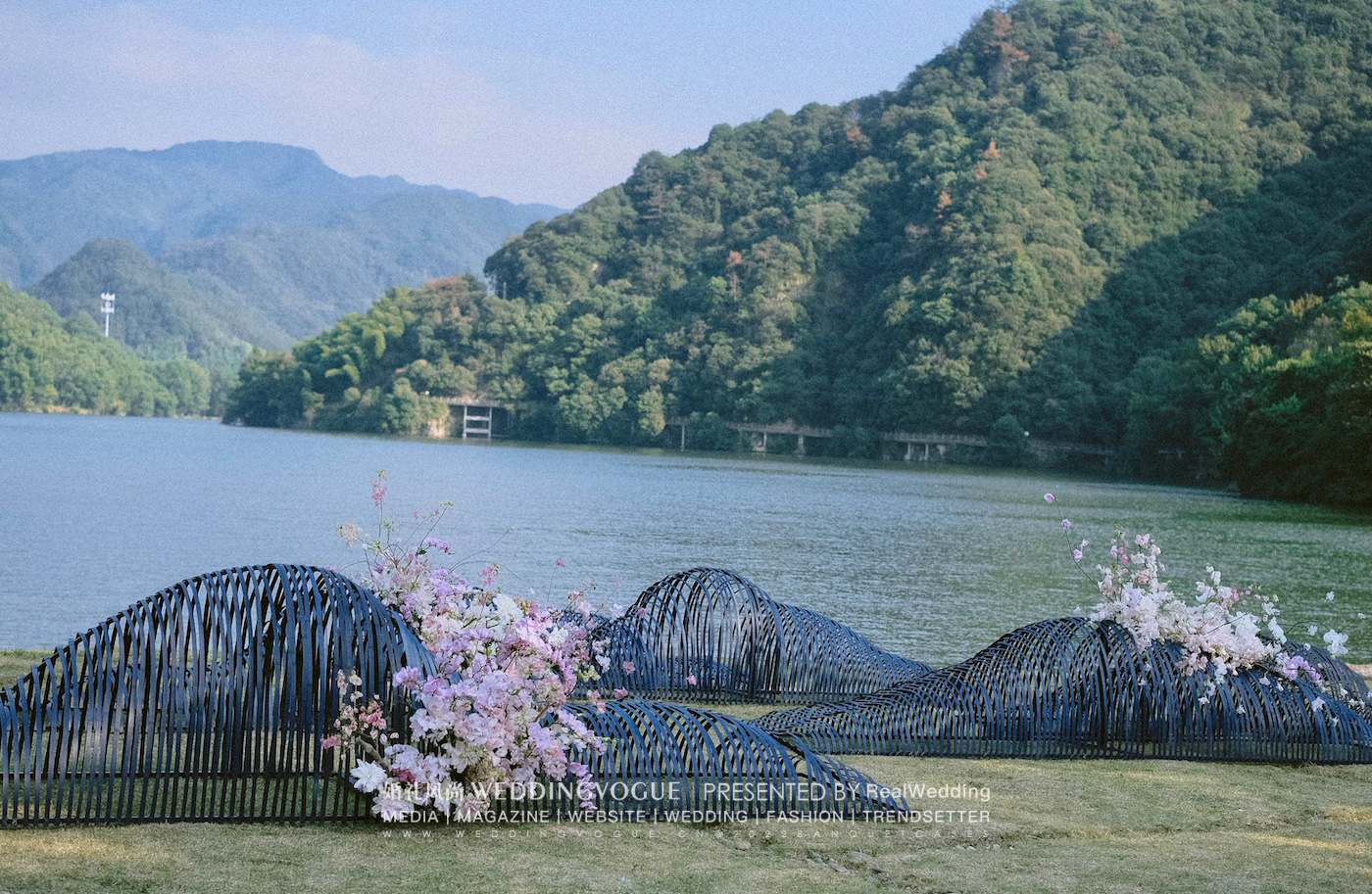 婚礼仪式区设置在江畔的草坪上,黑色的条凳四平八稳地铺排开,虽然简单却极具中式意味。如果只有凳子,那未免就显得单调了些,在REALWEDDIGN的作品中,造型别致、创意新颖的艺术装置当然是不可或缺的存在。