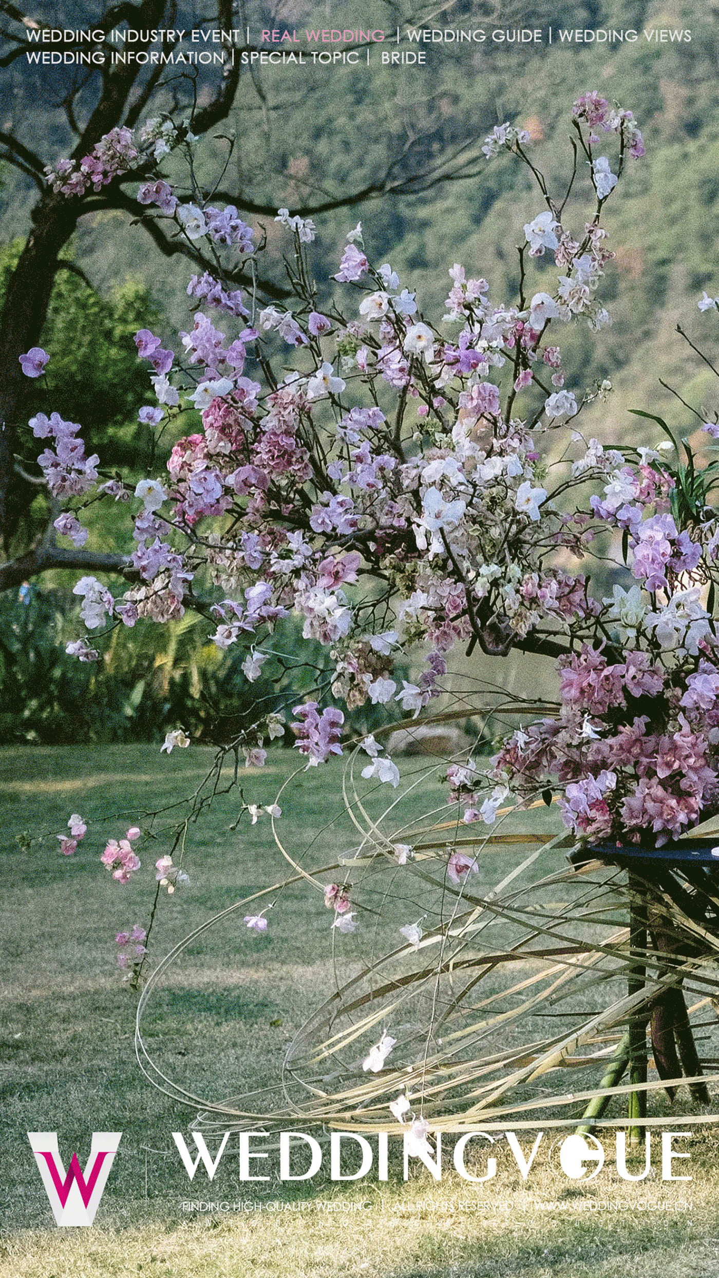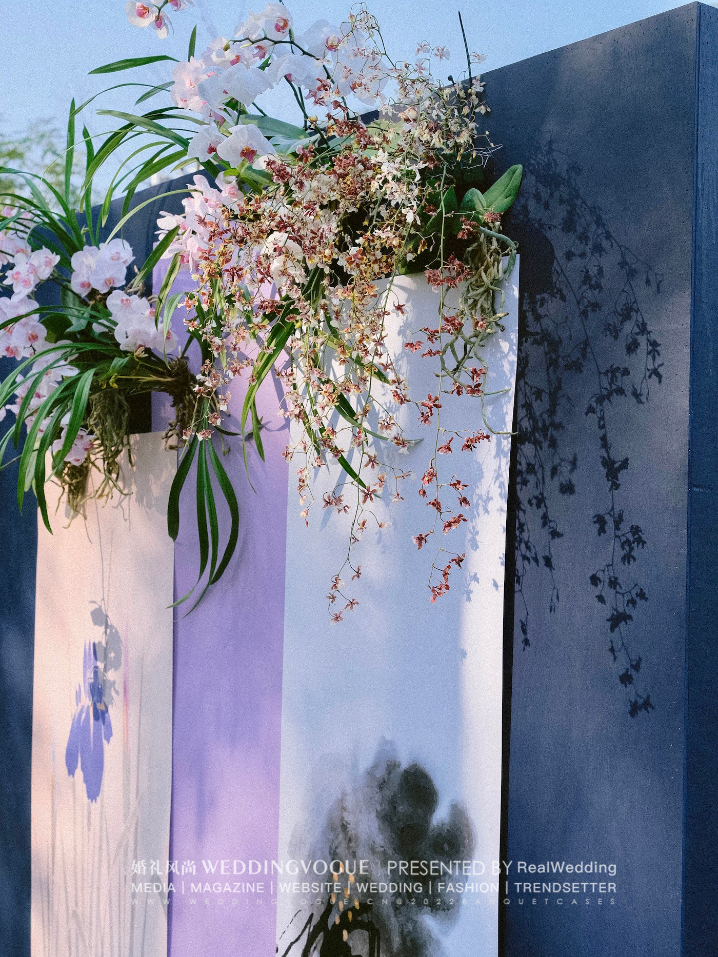婚礼仪式区一侧,一面由三色布幔、多彩花艺装点的立面背景板同样惹眼。紫色的、粉色的、白色的三块布幔从背景板高处垂悬而下,如飞瀑般坠入深潭,不过这潭里的不是湍流,而是青黄的秋草,于无声中,生命正在悄然更替。