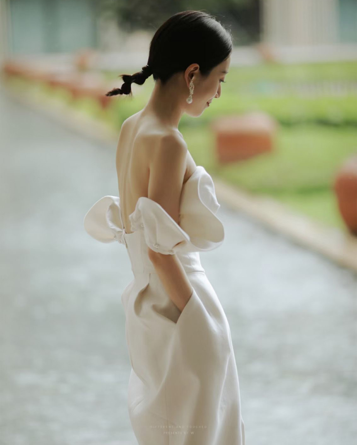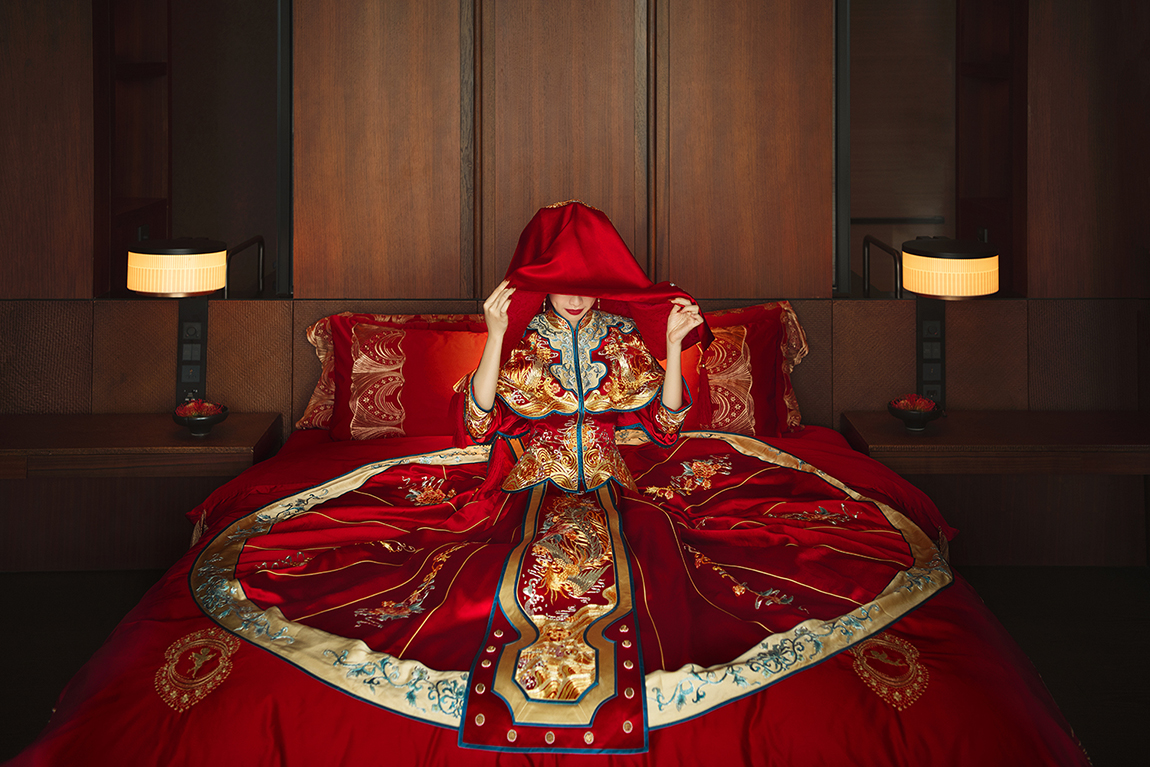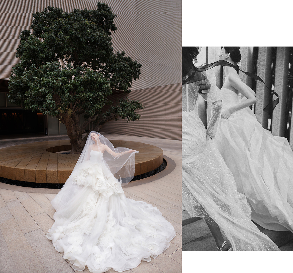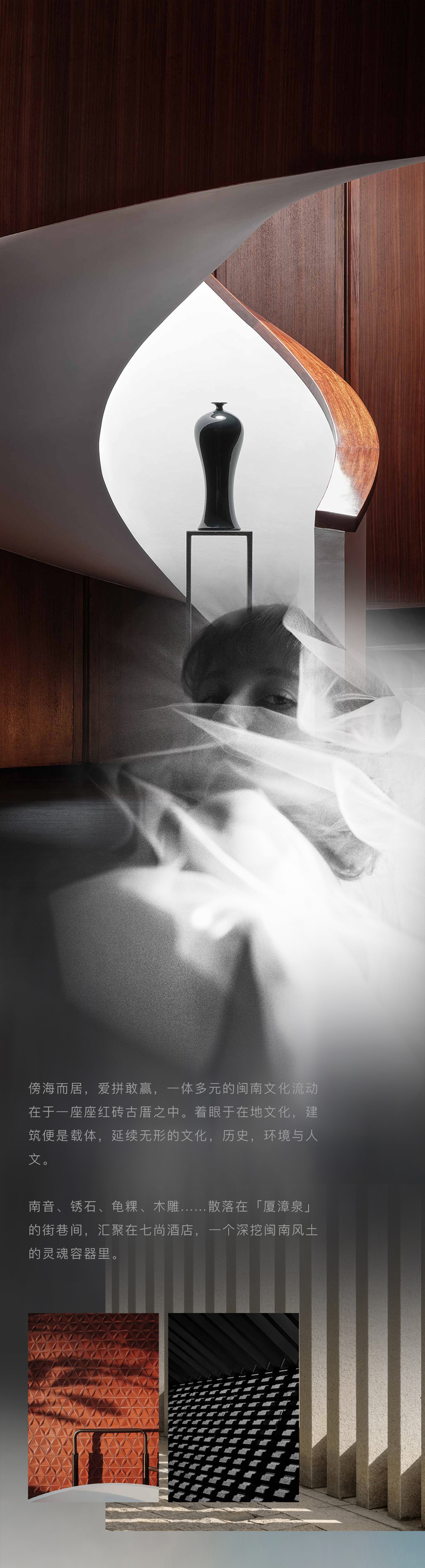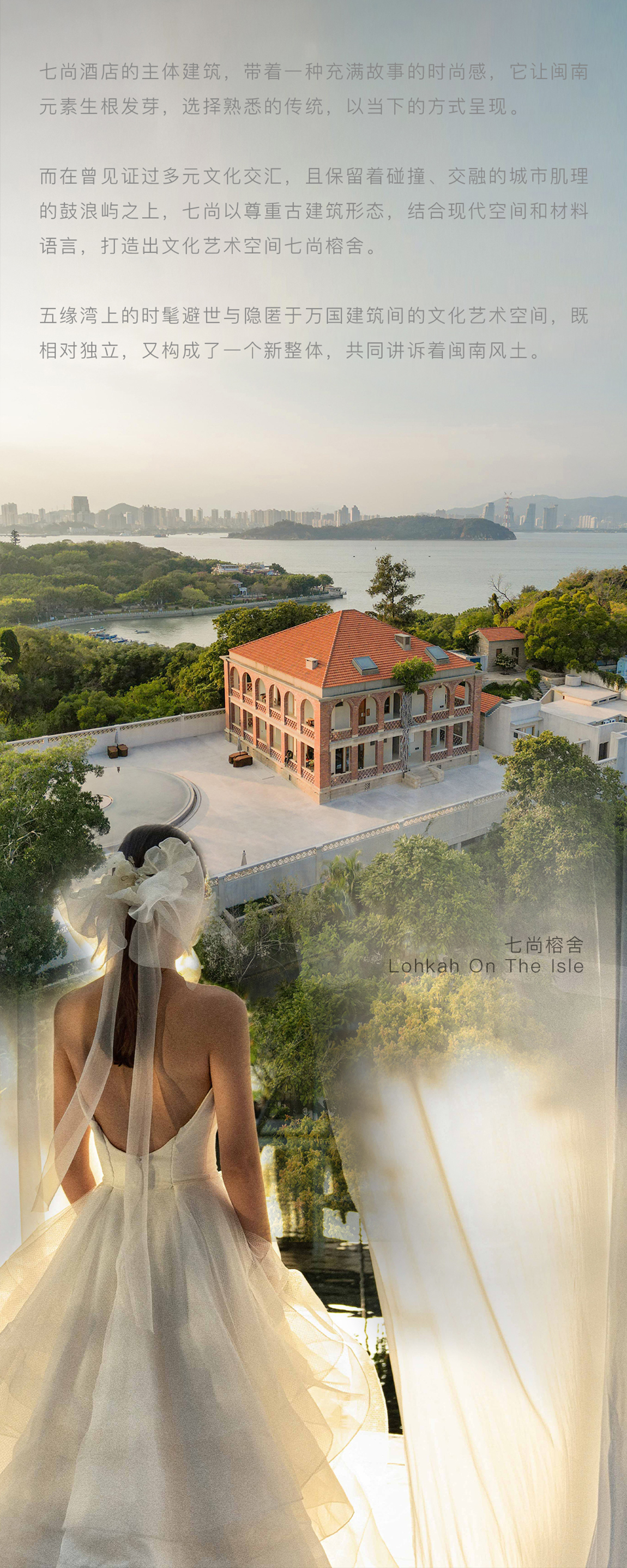 以现代美学诠释闽南文化的七尚酒店,让净素之色,衬托出中式礼服的华美,也能让晚礼服的时尚优雅,与酒店环境搭配得恰到好处。