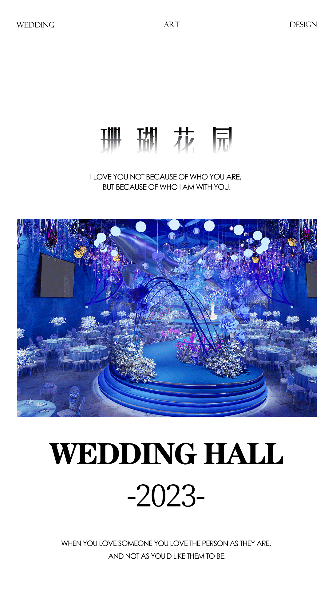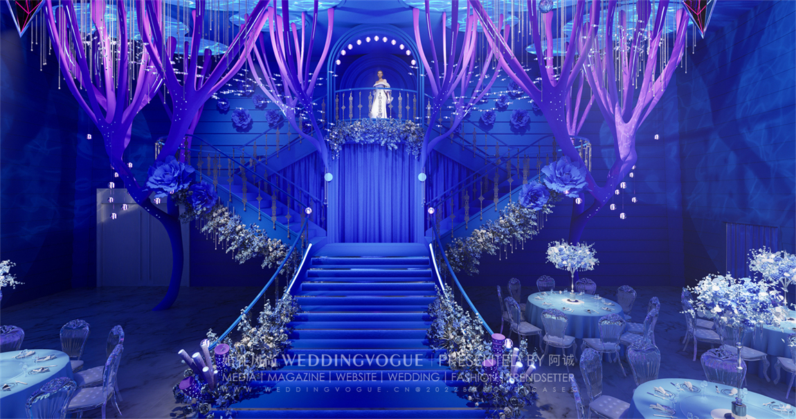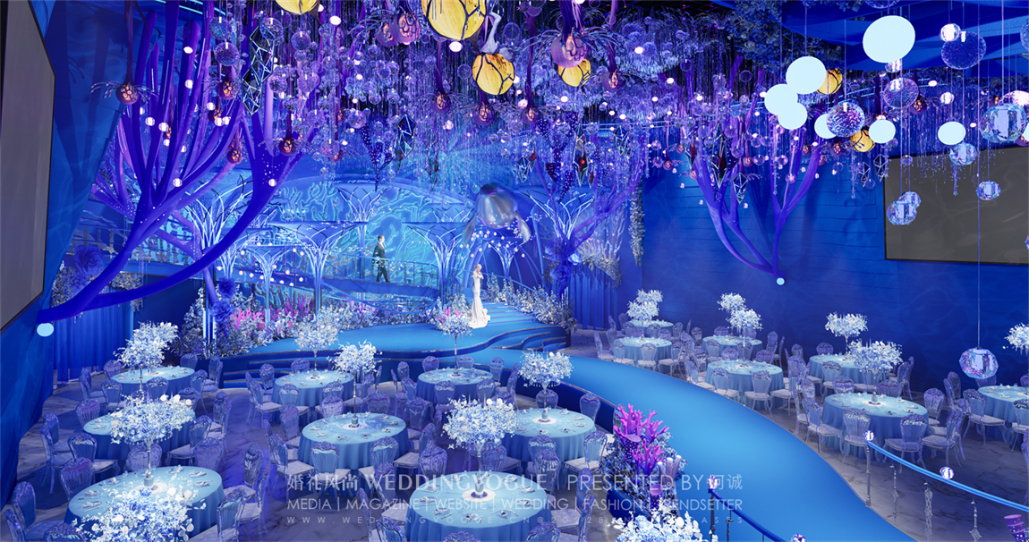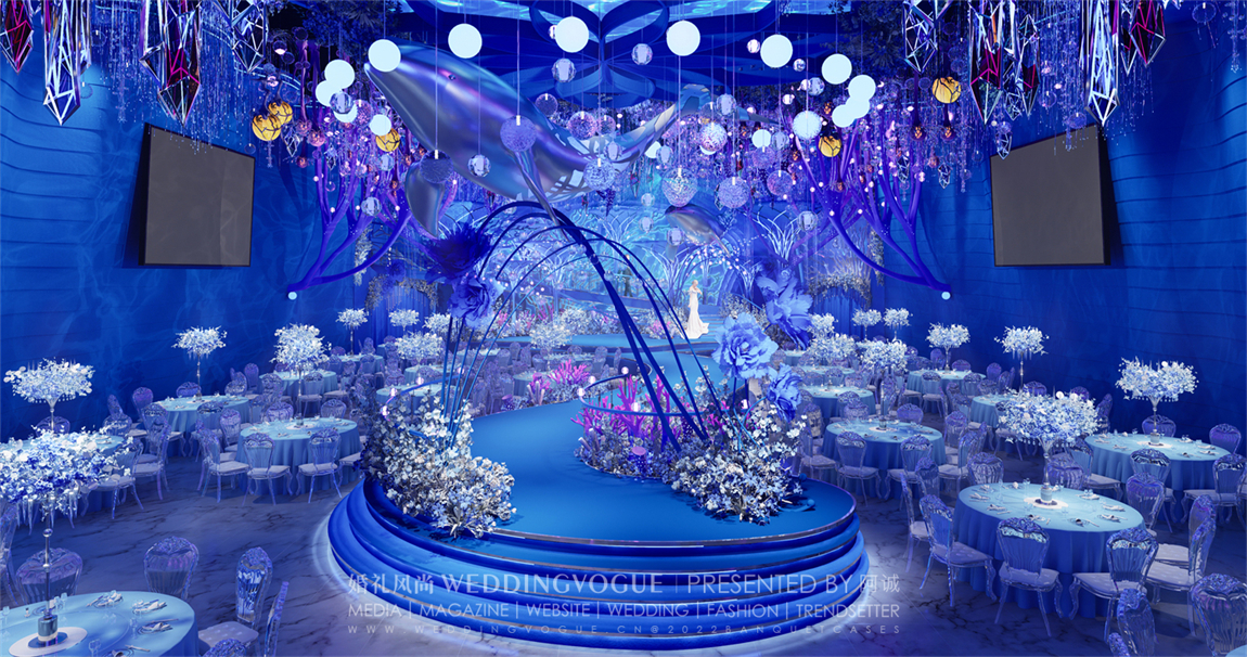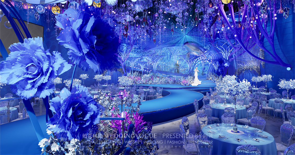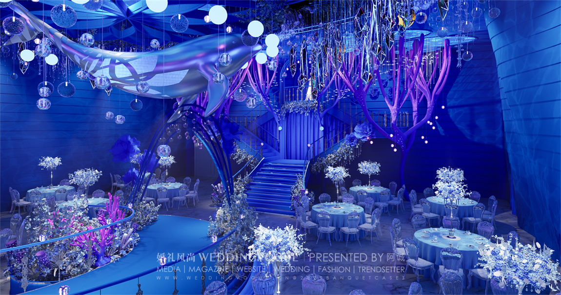 花艺的色彩运用白蓝色组合映衬海洋的主题,搭配灯光渲染美轮美奂。