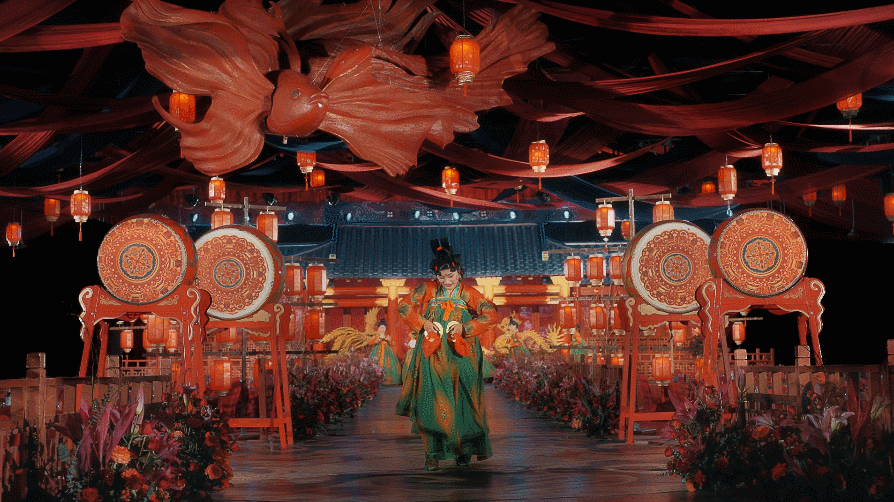 舞蹈演员们跳着「唐宫夜宴舞」登场
