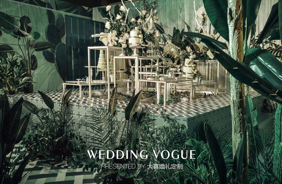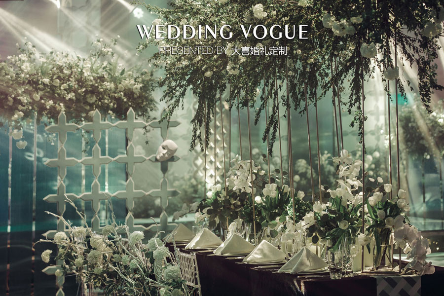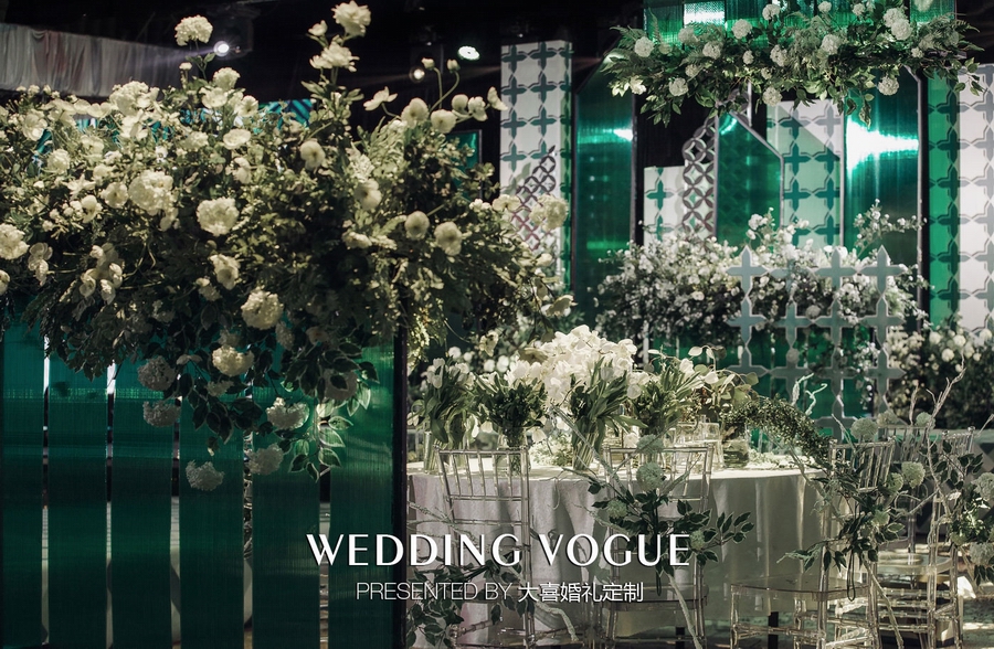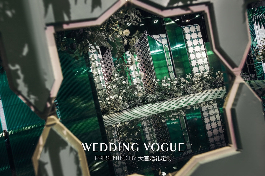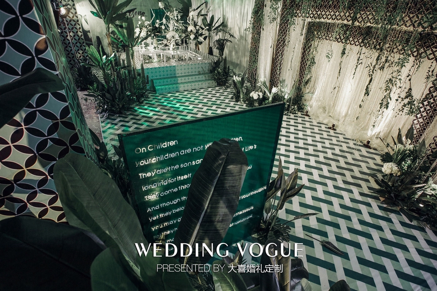 同样以白绿为主要配色的外场,设计师则放大了摩洛哥酒店的花砖元素的使用比例,在将其大面积代入至白绿与些许黑色的搭配之外,还利用水晶吊串的通透,白色的柔纱布幔,以及垂掉悬挂的绿叶和大棵的热带植物,以摩洛哥的度假风情,将常见的白绿搭配重新诠释。