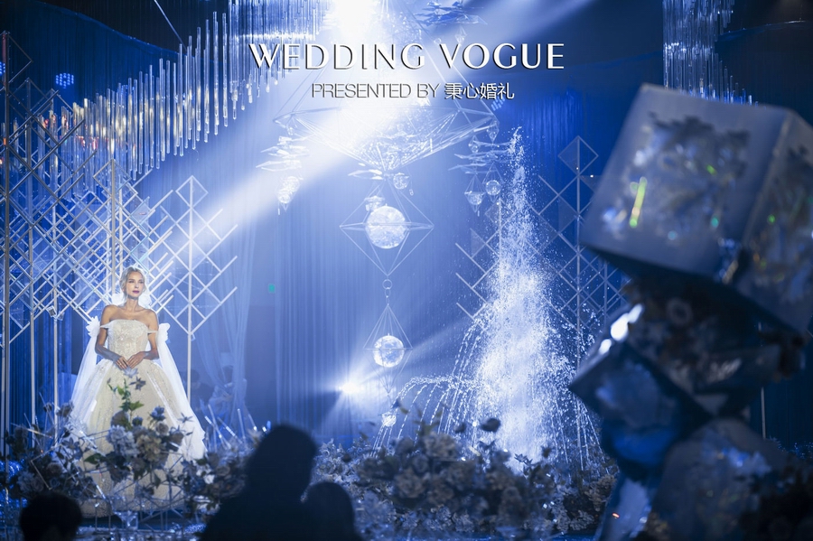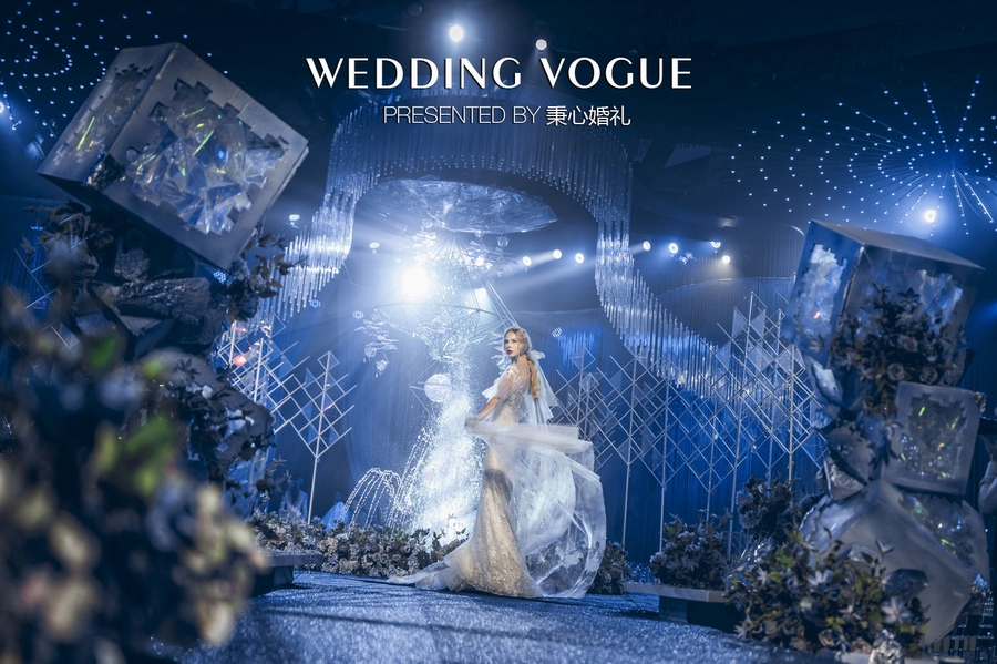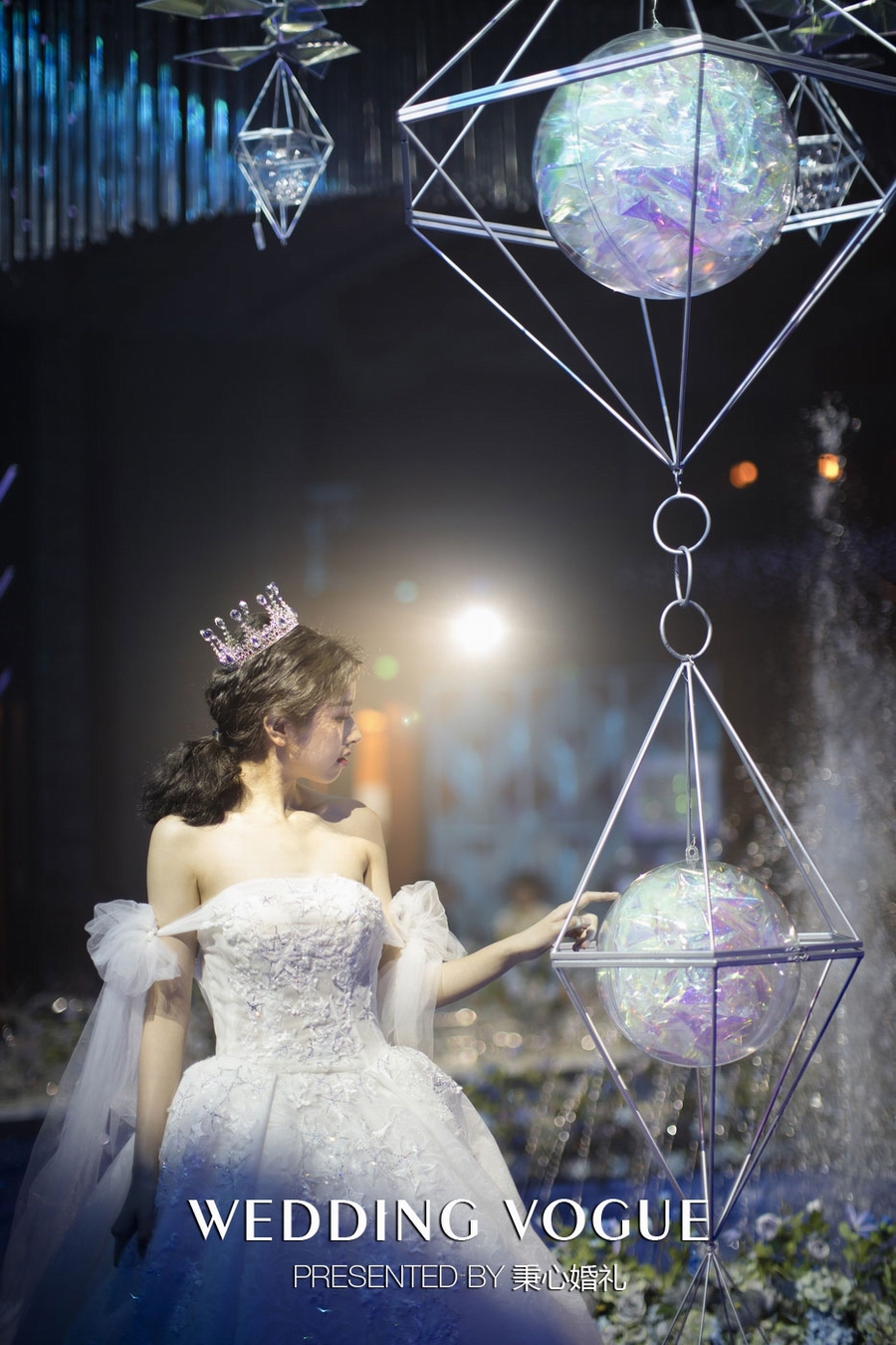 在此次婚礼秀中,设计师从大自然中提取出几个简单的几何元素,抽象重构组成大自然中5个极其纯净的意象:原始的矿石,北欧的森林,耀眼的极光,清澈的泉水,焰火般的星空。