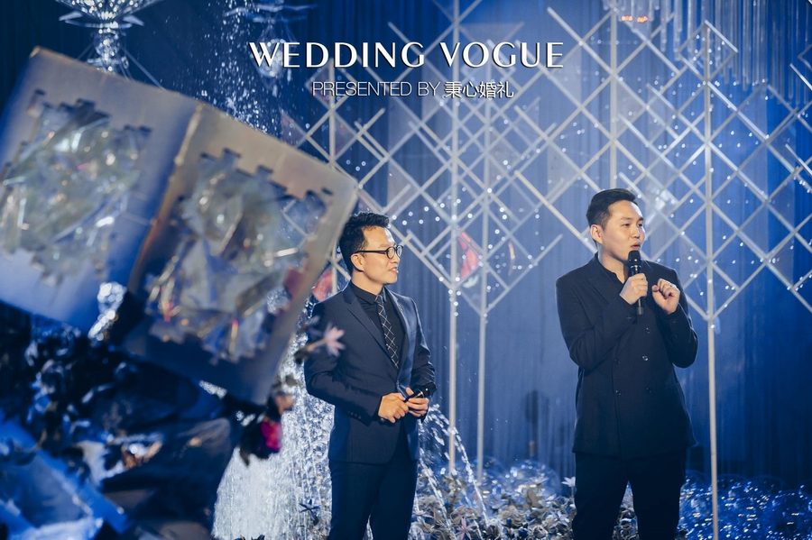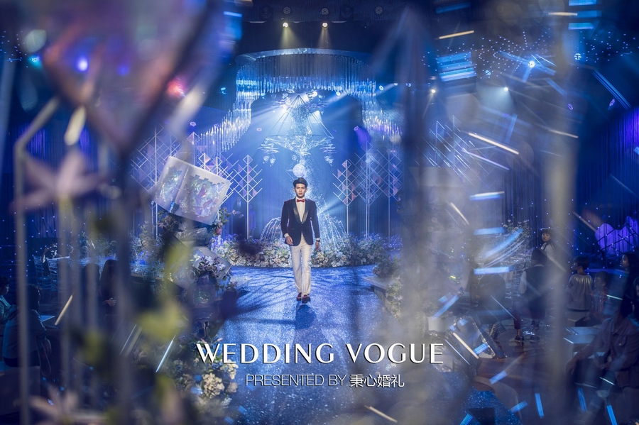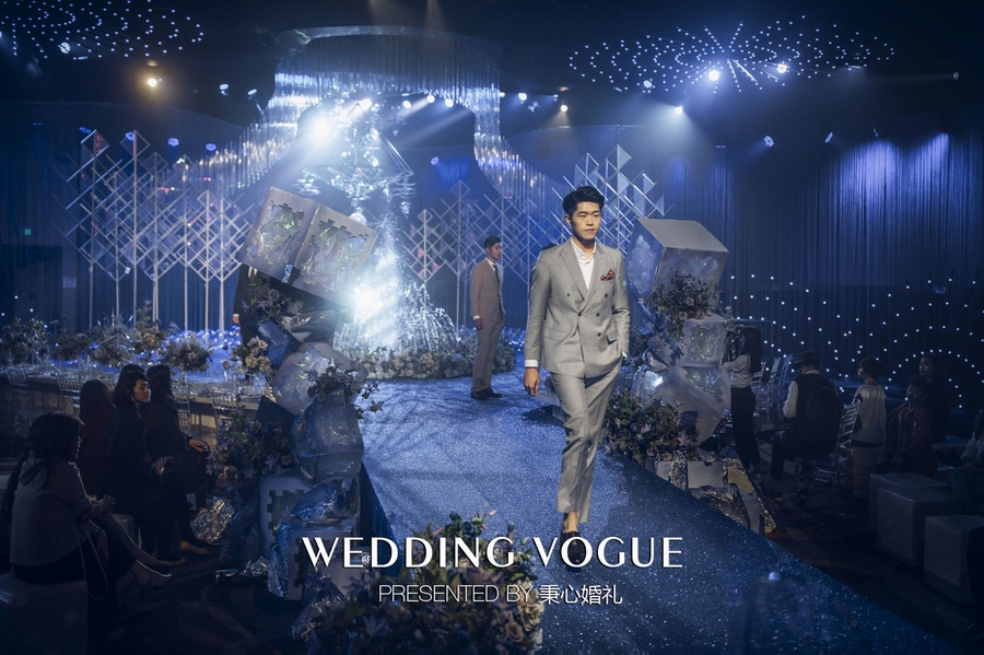 婚礼秀的整体设计也与这5个意象息息相关。全场主色调是纯净夜幕的蓝,现场利用大量发散型灯片营造出星空,星星点点的光源将寥落的、高不可攀的、不带温度的星空幻化在触手可及的宴会厅内。