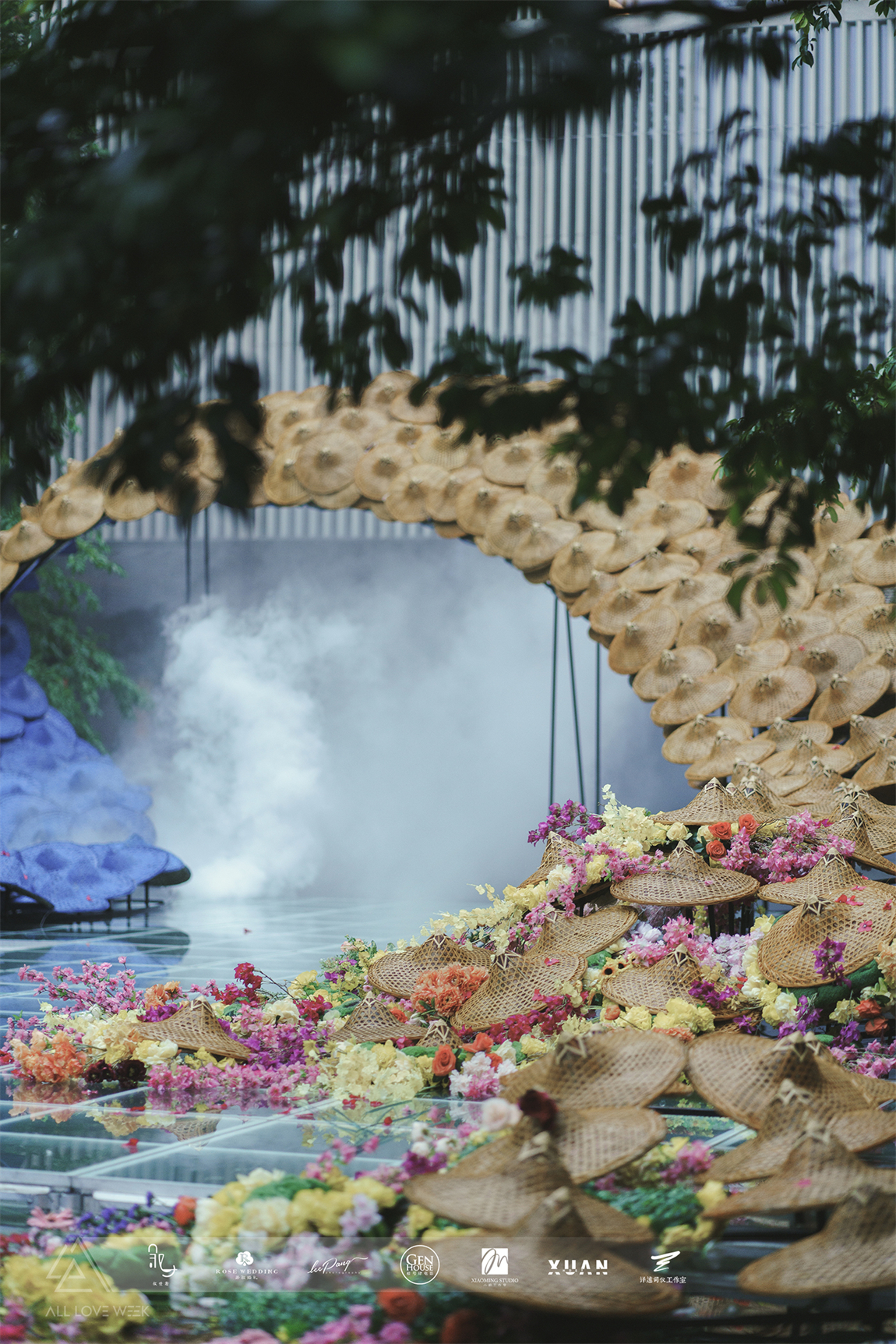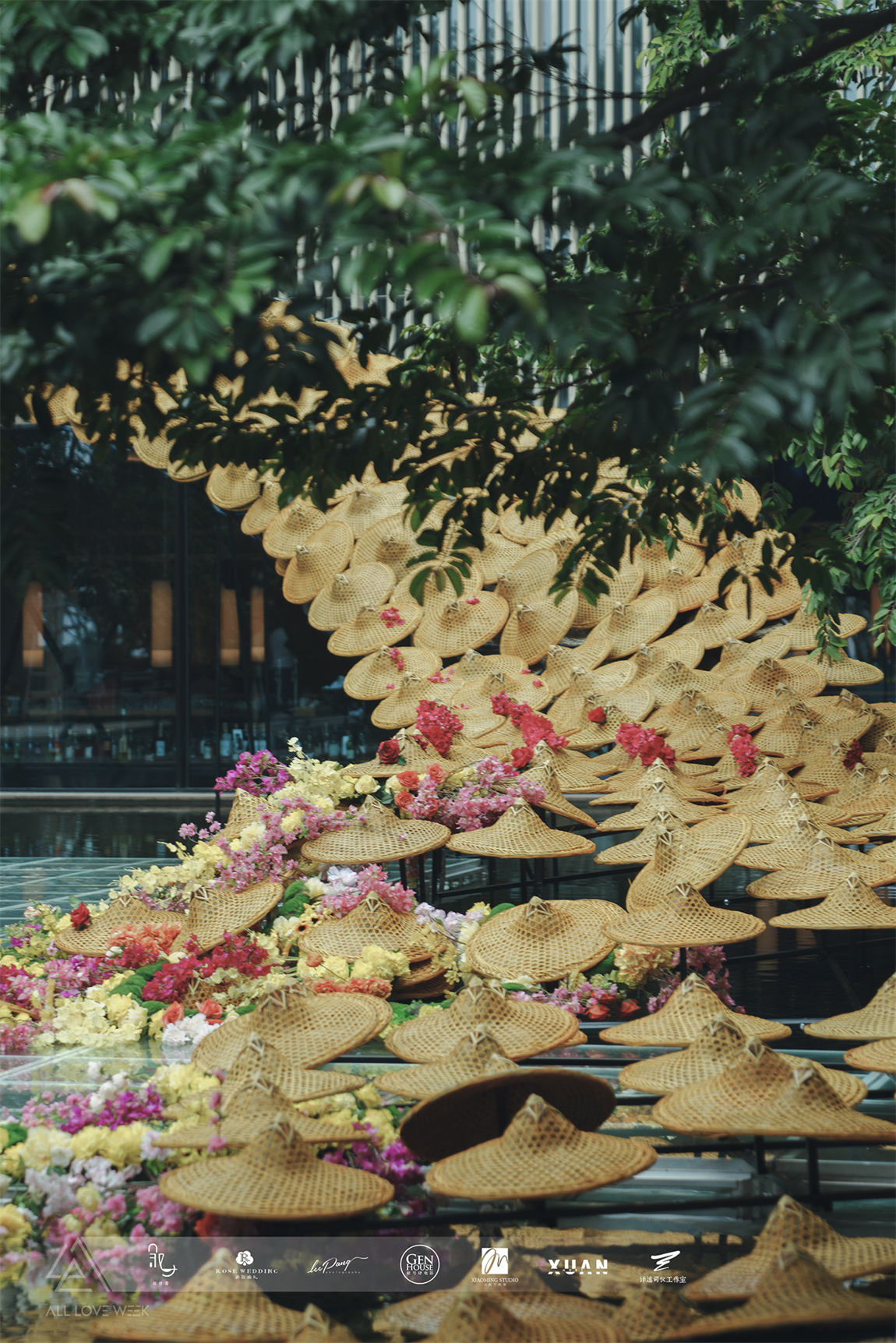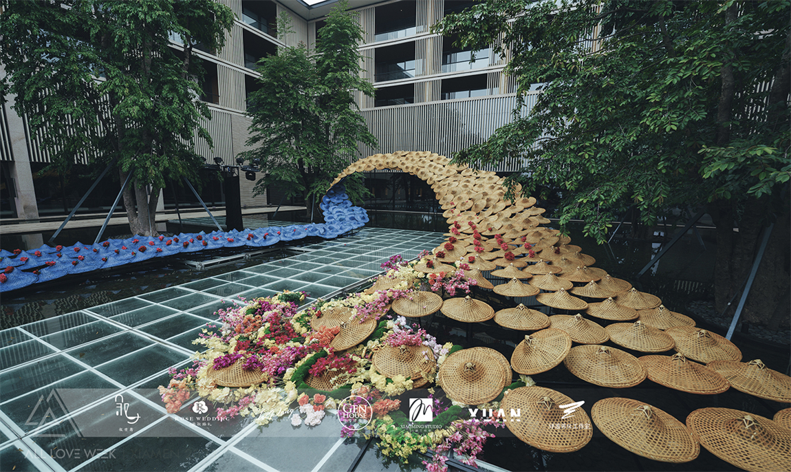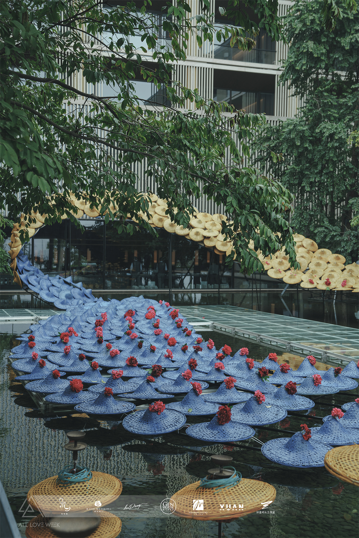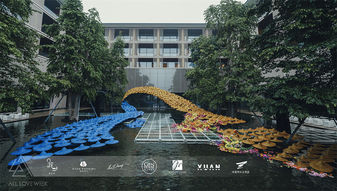 以黄色和蓝色的斗笠作为凤羽填充,坐落在中央水台,特别的场地也赋予了整个设计无比的灵性。