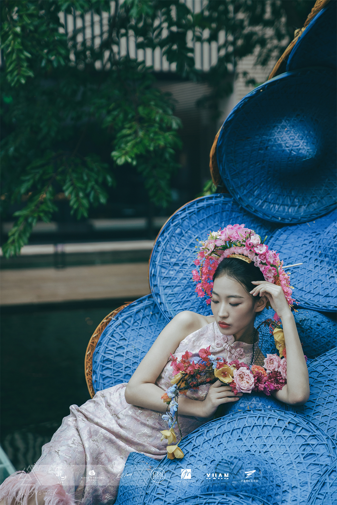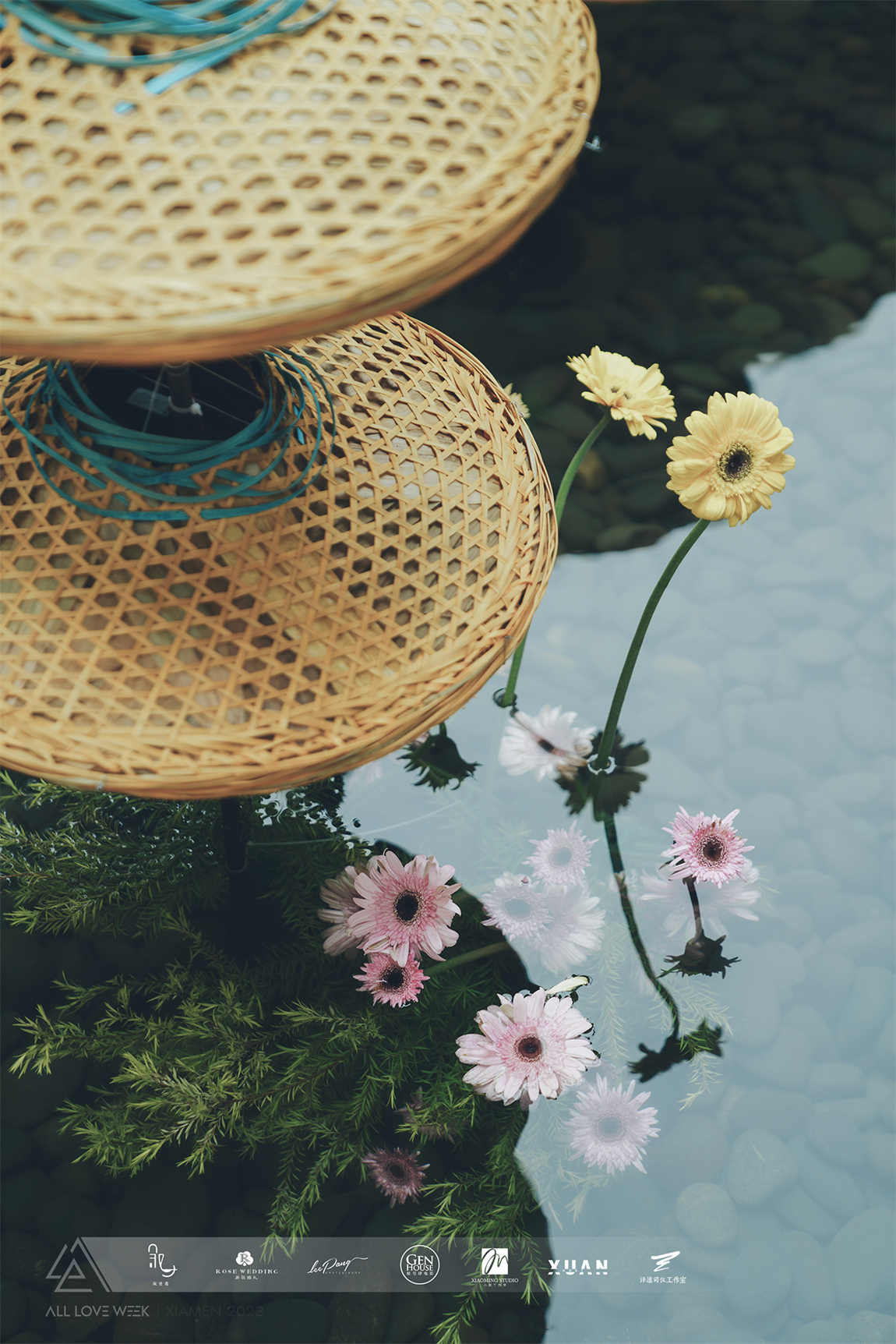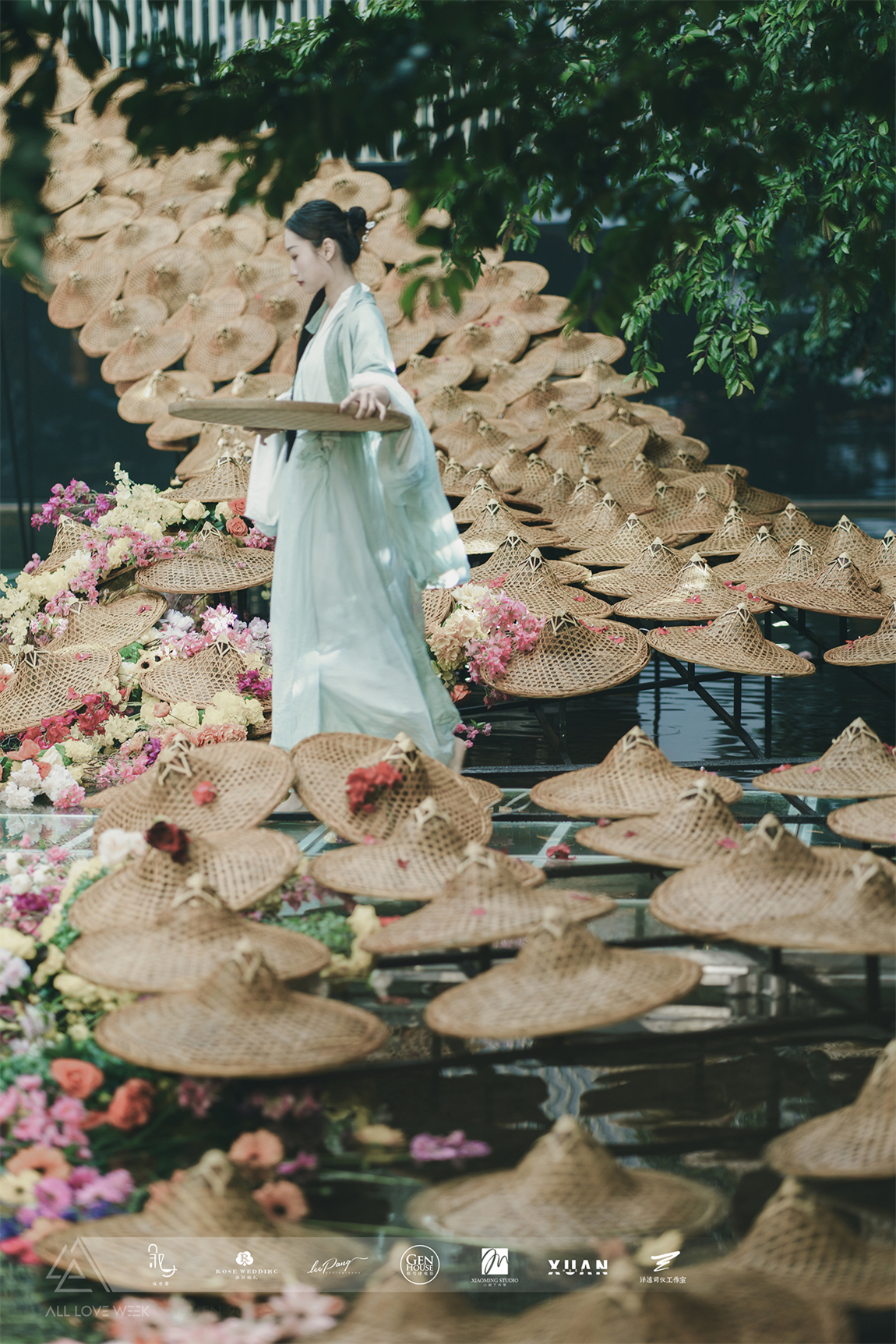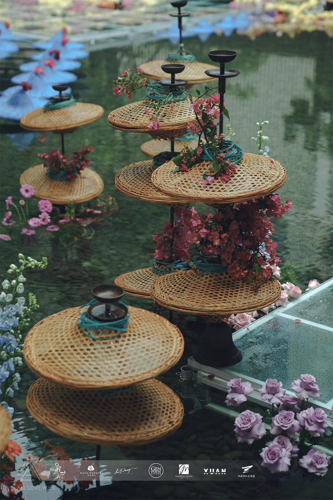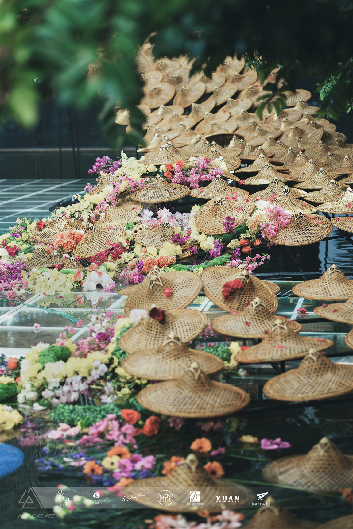 以黄色和蓝色的斗笠作为凤羽填充,坐落在中央水台,特别的场地也赋予了整个设计无比的灵性。
