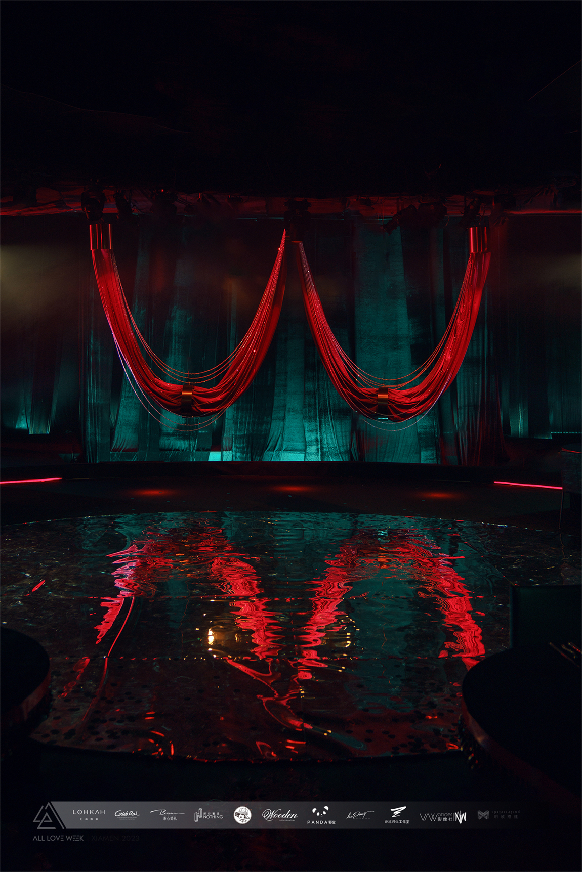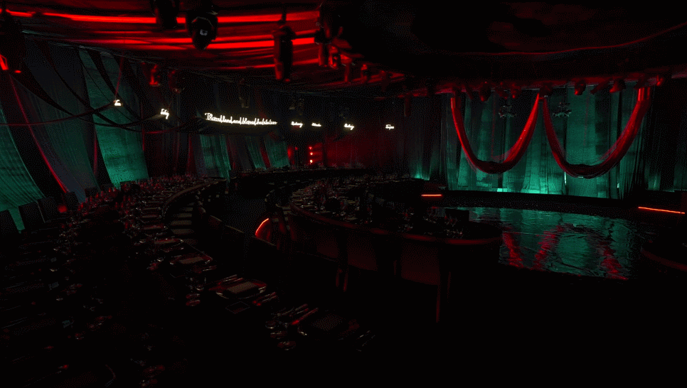 视觉上的水元素表现是舞台中间用镜面的方式呈现出水的倒影。同时在桌位设计上,我们可以看到整个布局是一圈连着一圈的环形设计,呼应水滴落下,荡漾开来的样子。