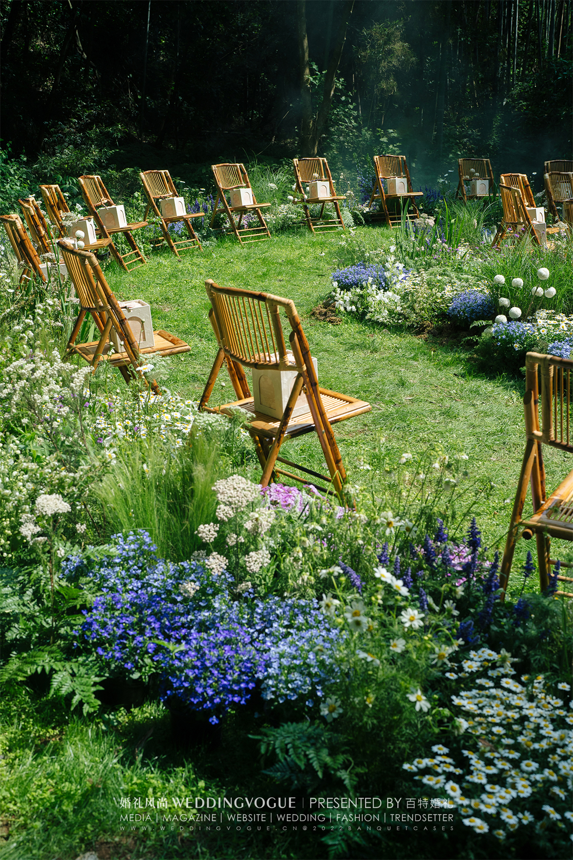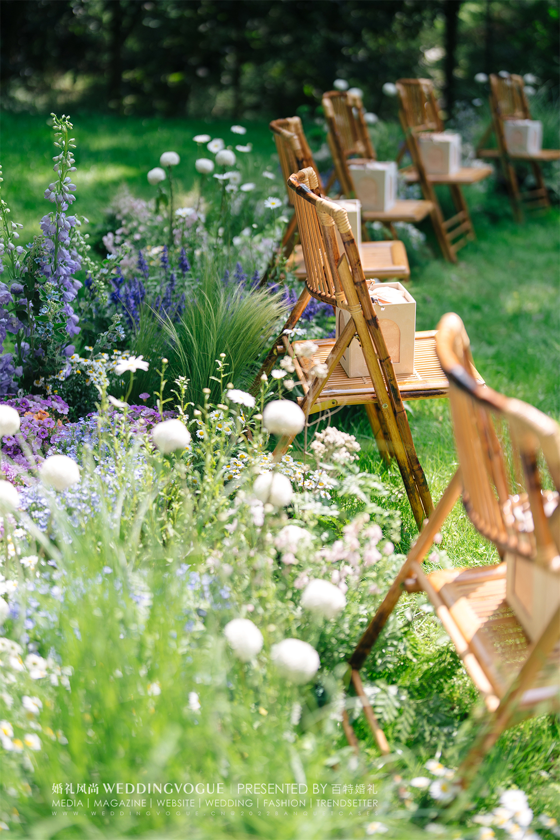 三面被林荫环绕的草坪被百特婚礼做成了一个花园。按照一路进入,虫鸣鸟啼,阳光正好。