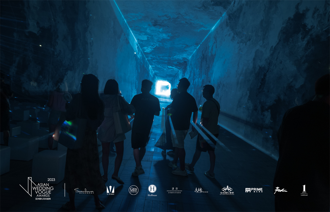 同时这场宴会设计发布现场还承载着一个很重要的任务,即2023婚礼风尚影像节十大影片的展映现场,影像其实也是通过机器记录下物体和人物散发的光,从而形成的,所以最后设计师徐丹决定用“光”来穿针引线,完成这场设计。