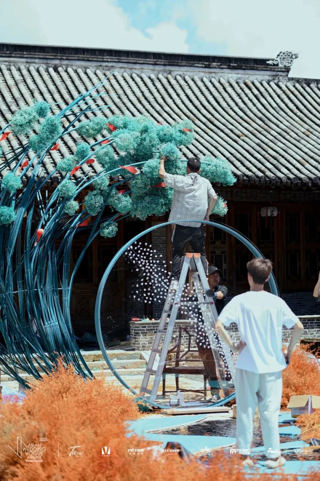 搭建过程中,主创及施工的小伙伴顶着烈日,小心地制作热缩片的造型,只为营造出发布现场轻盈如水的质感。