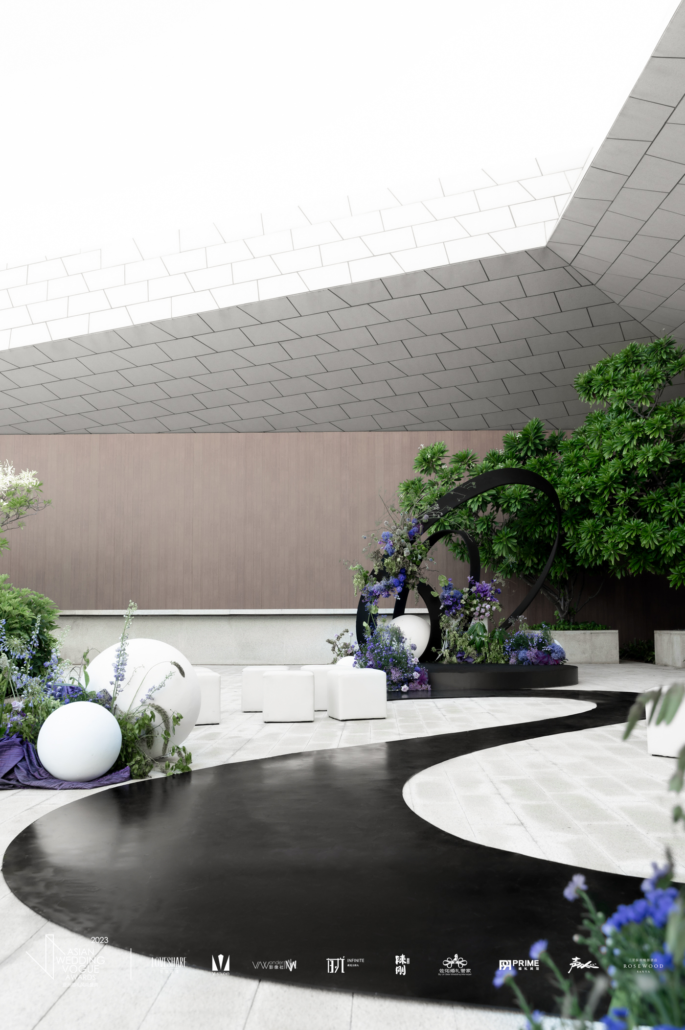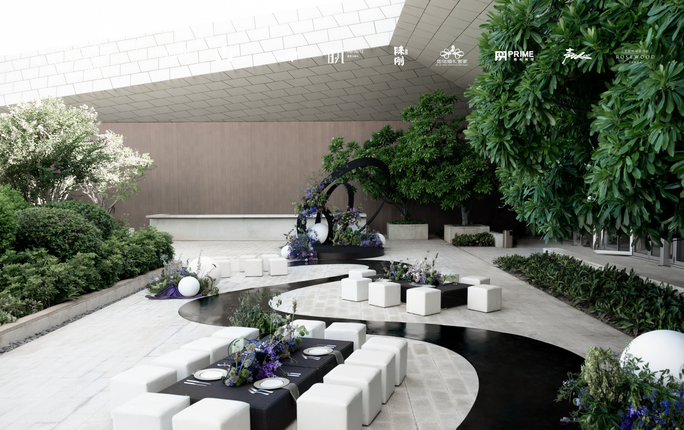 通过采用不同图案与材质对比,最终确立以错落的流线造型布景与简约配色装饰搭配,打造具有高级质感和现代美学气息的宴会场景。