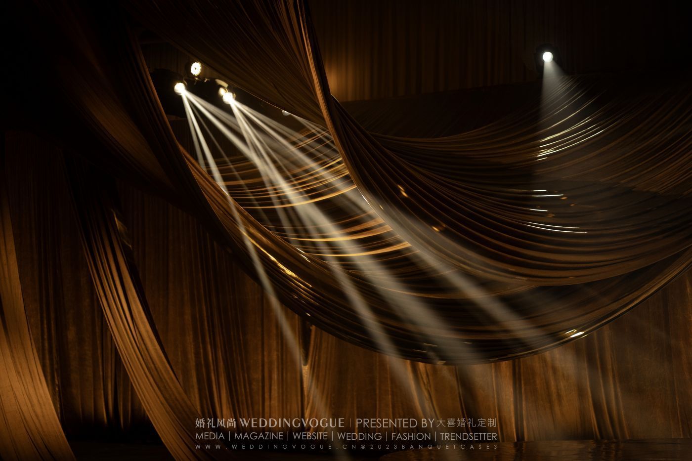 两侧的光线在中心圆盘粗糙的表面形成漫反射,为场地降下一片温柔的光景,明暗相间的光影刻画着布幔的纹理褶皱,将现场的浪漫推演至高潮。