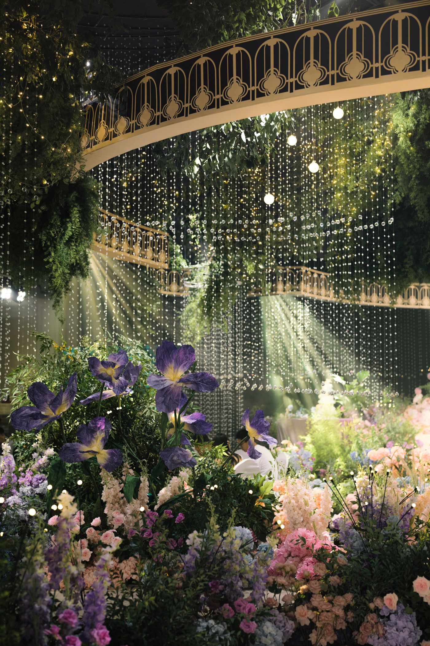 HANA突破酒店宴会厅层高的局限,以多彩缤纷的花艺和欧式花园风建筑元素和装饰结合,将这片充满生机与绚丽色彩的“多巴胺森林”打造出别样欢乐的氛围。
