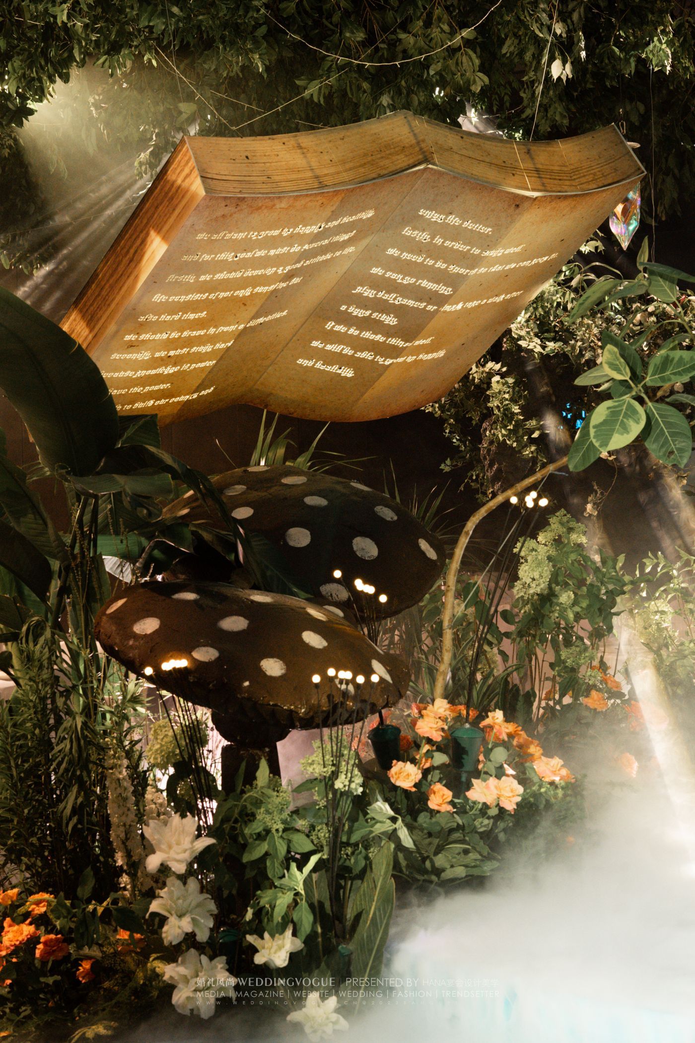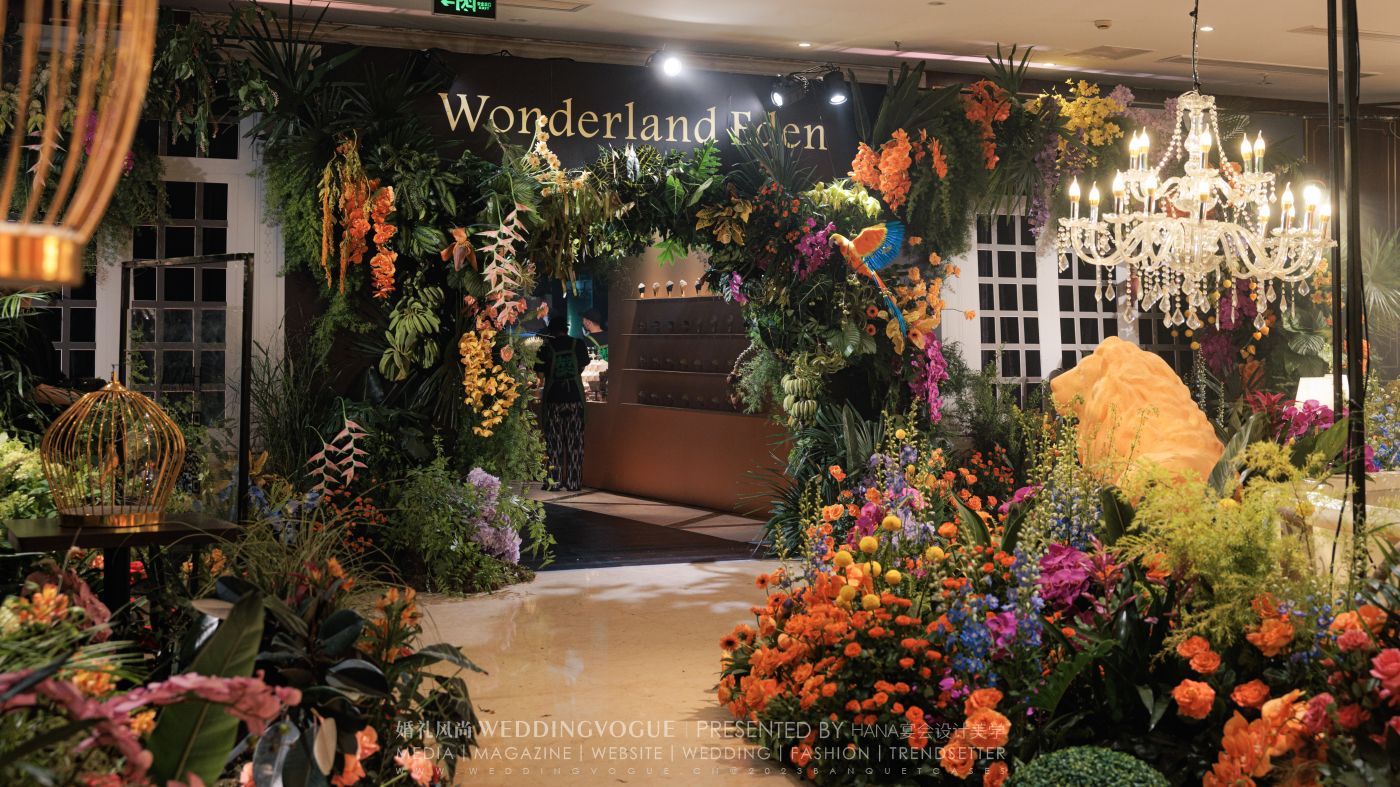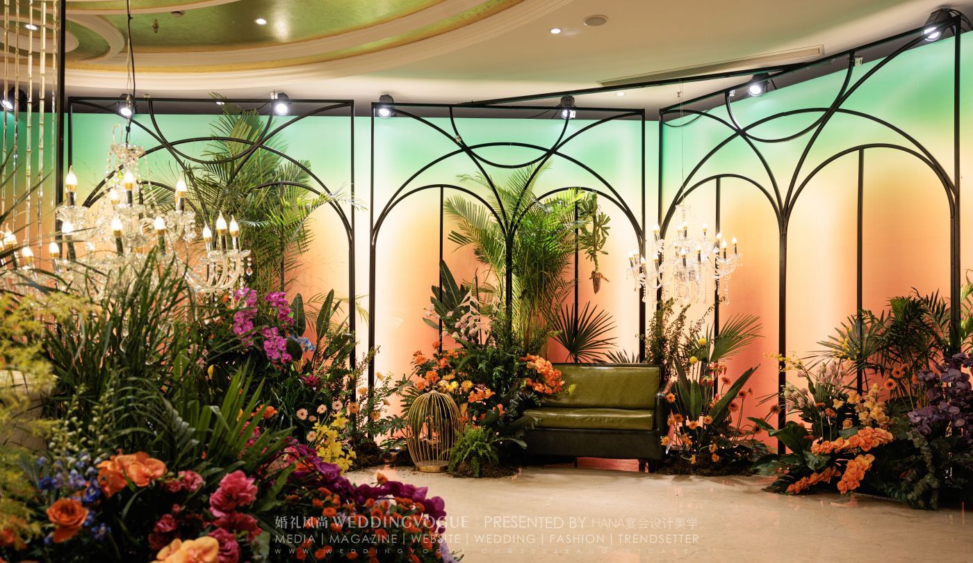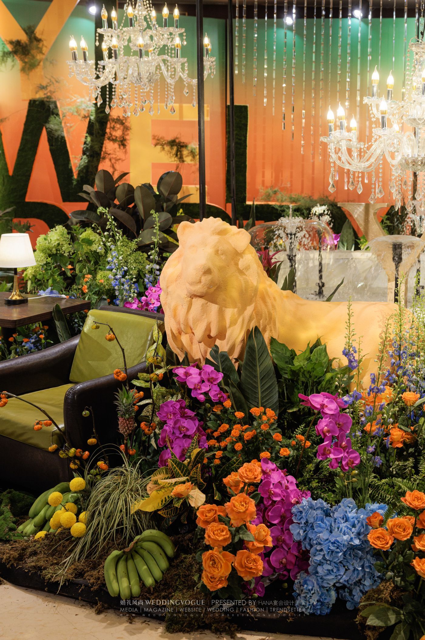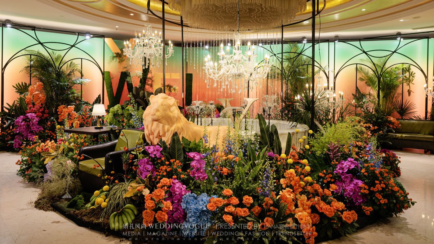 头顶飞过的金刚鹦鹉,刚好降落在入口处的枝头,花池中心威武而立的金狮,象征智慧和力量,为仪式增添出生机与高级的质感。