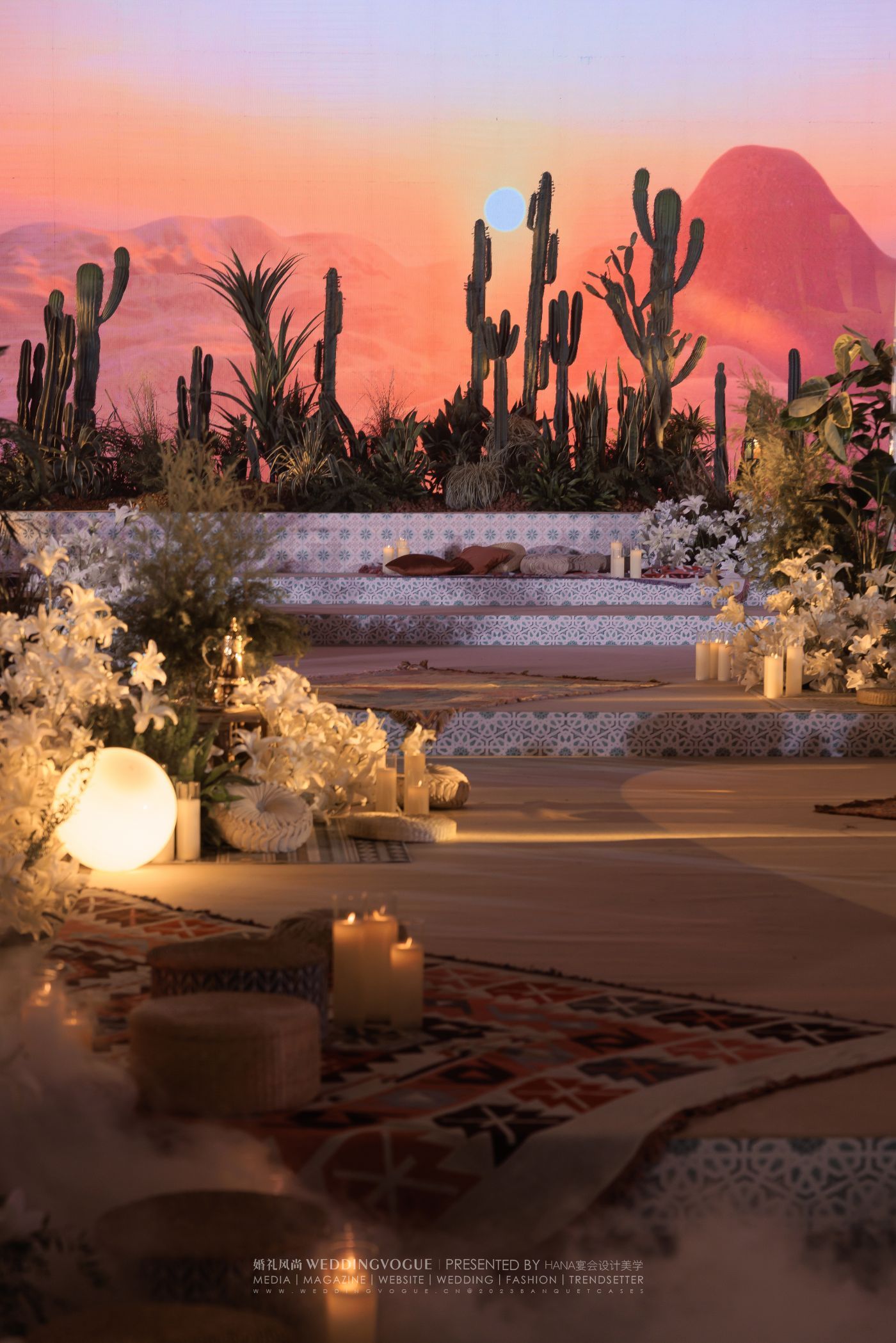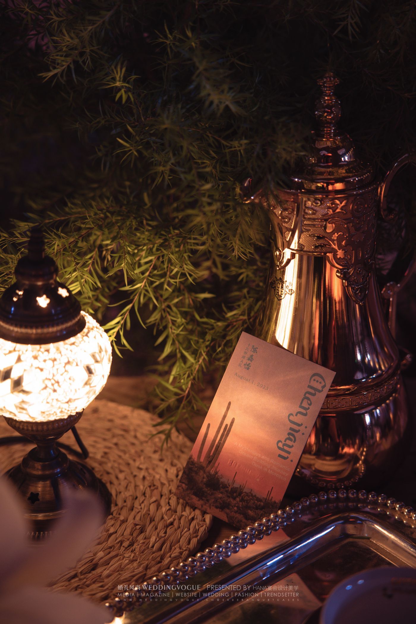 花纹精致繁复的琉璃灯与地毯坐席,带着强烈伊斯兰艺术强烈色彩与奢华的风格特点,将现场打造为摩洛哥王国的宫城后院。