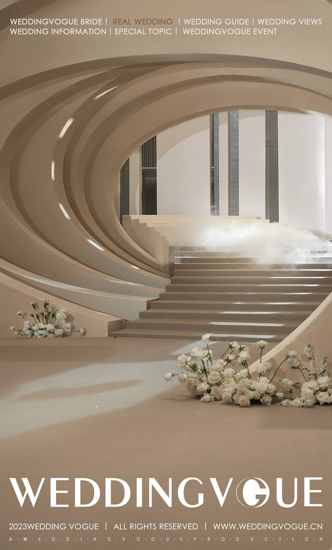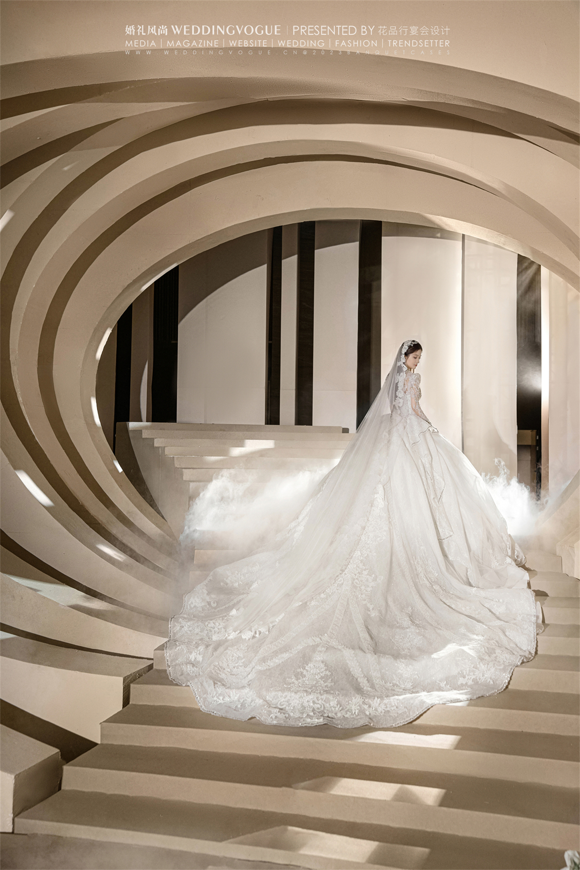 阶梯引导视觉走向“风暴”的中心处,新人挽手挺立,光透过外壁的“风口”形成斑驳的印记,造就仪式感丰盈的瞬间。