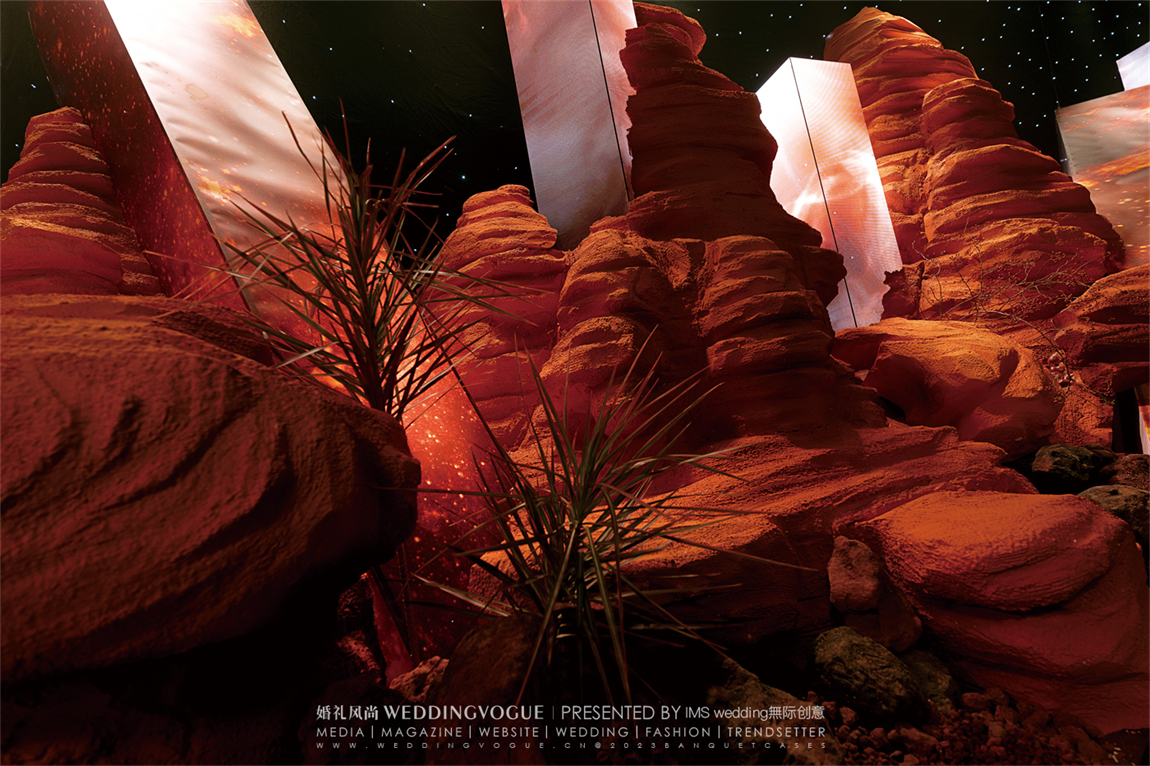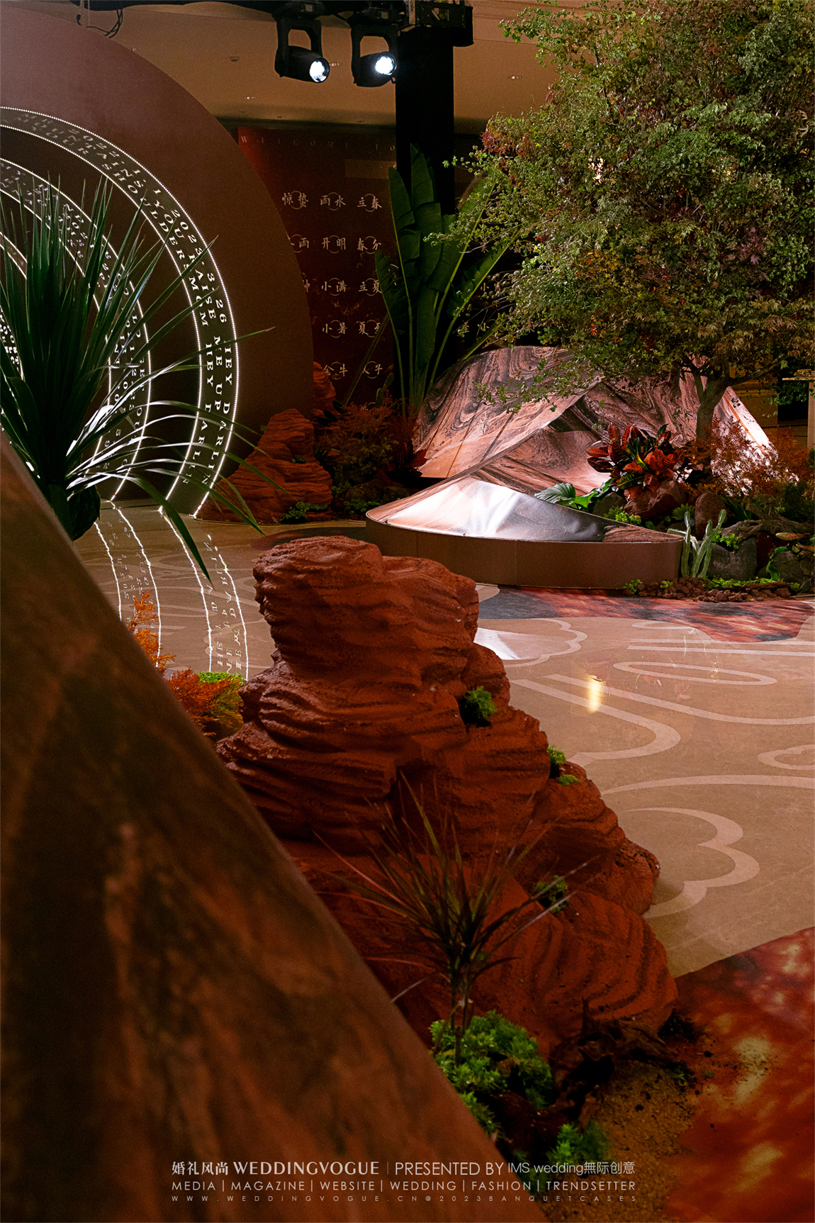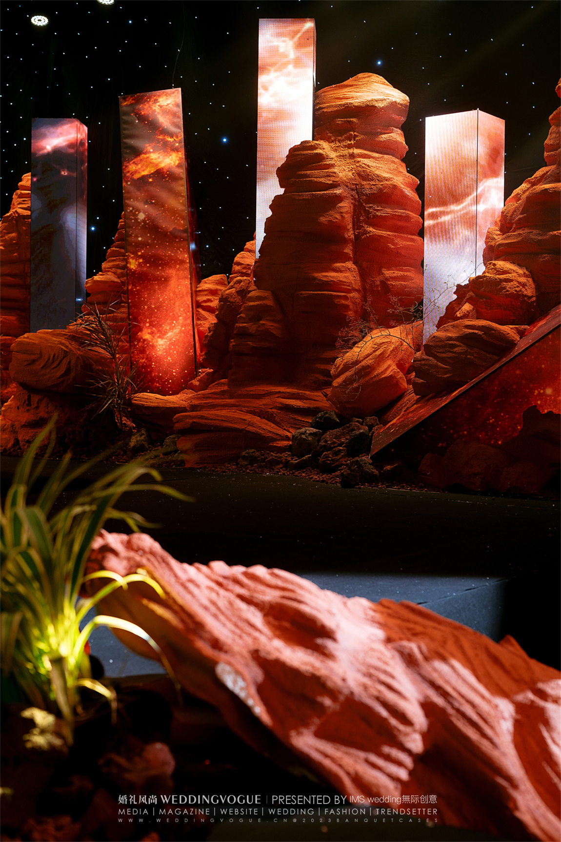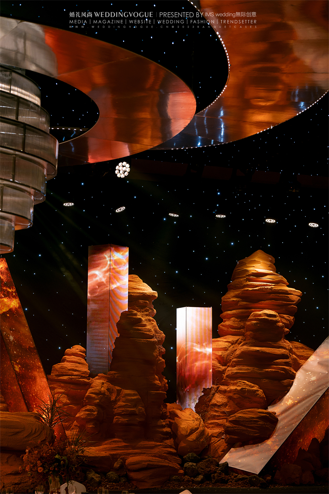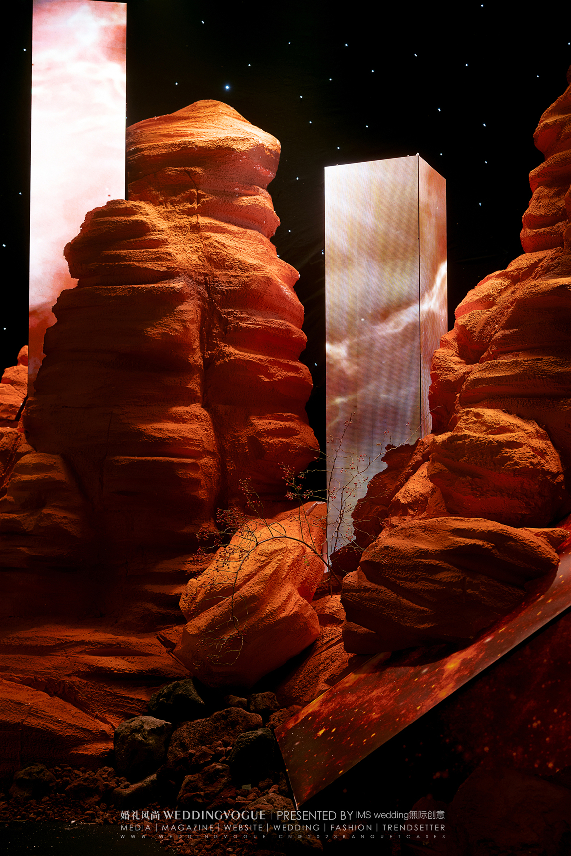 抛开常规婚礼的设计,整个婚礼的主背景是一些巨大的刻画着时间痕迹的岩石。时间跨度,让岩石成为有故事的载体。
