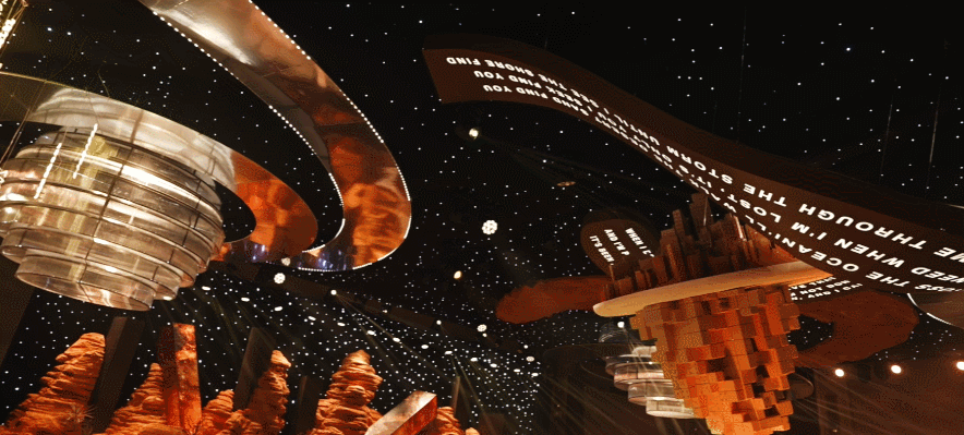 吊顶的主视觉以三个“太阳”为核心点,做视觉延伸,一秒穿越三体世界。