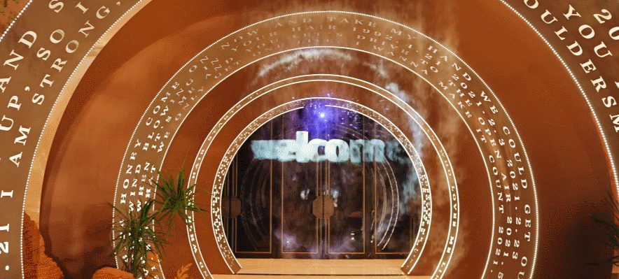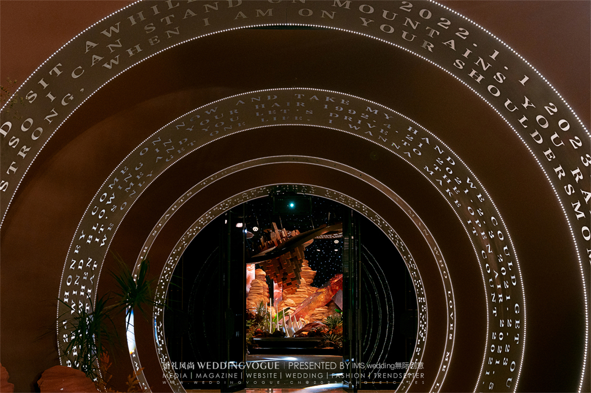 从宴会前厅走向宴会厅,要经过一个环形的通道,带着自然清香的水雾上,全息投影出Welcome字样,穿过时空隧道,就走进了三体的世界,仪式体验感满满。
