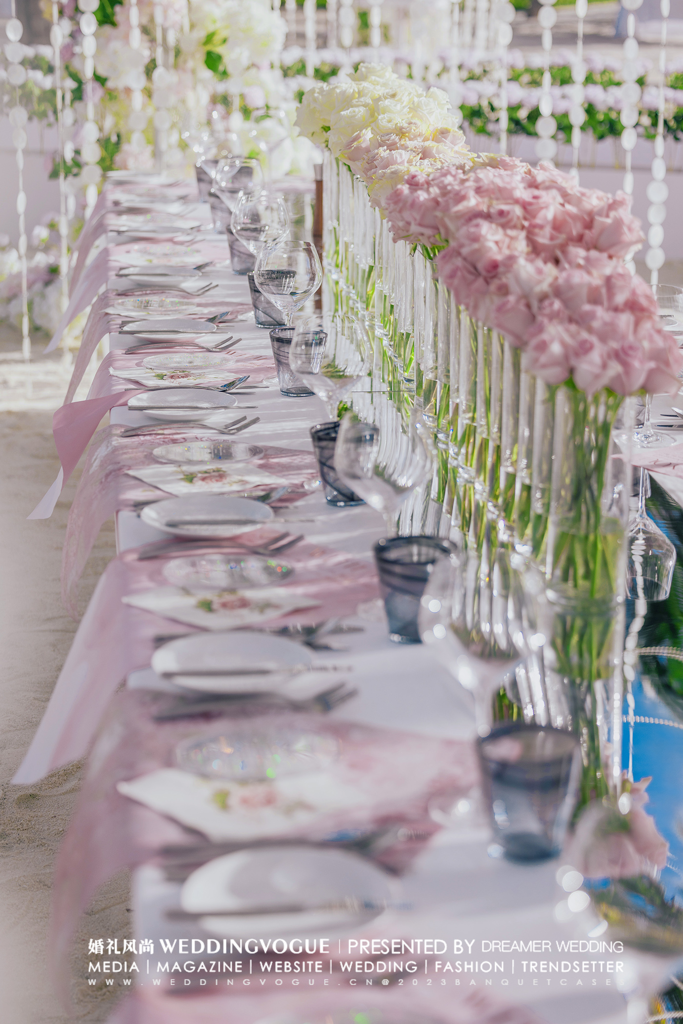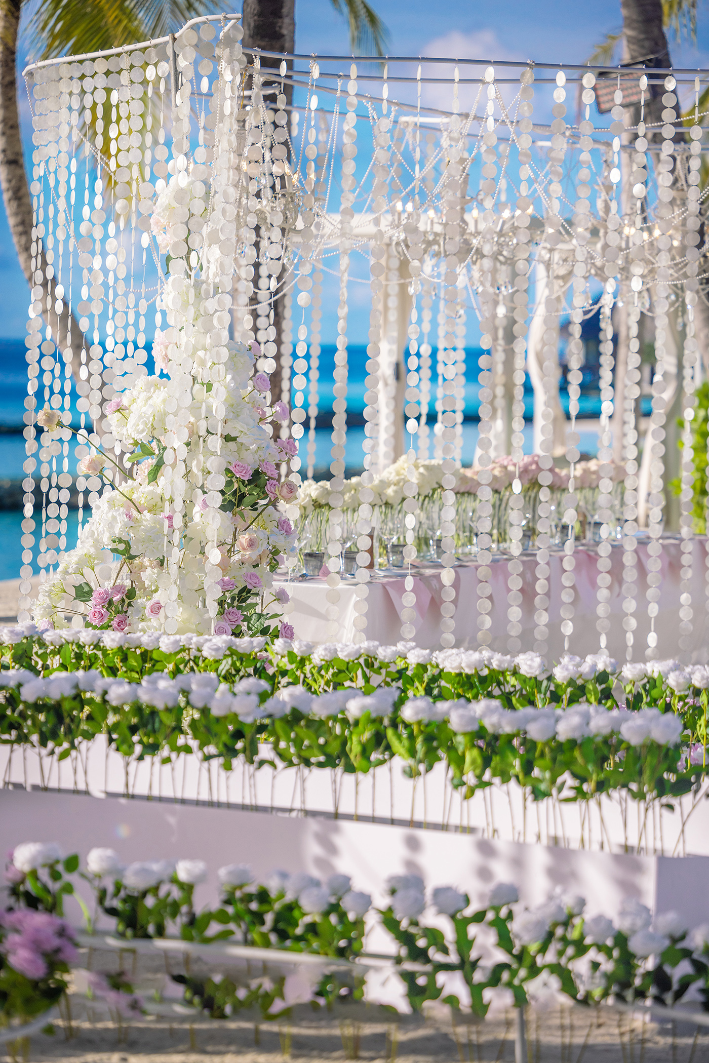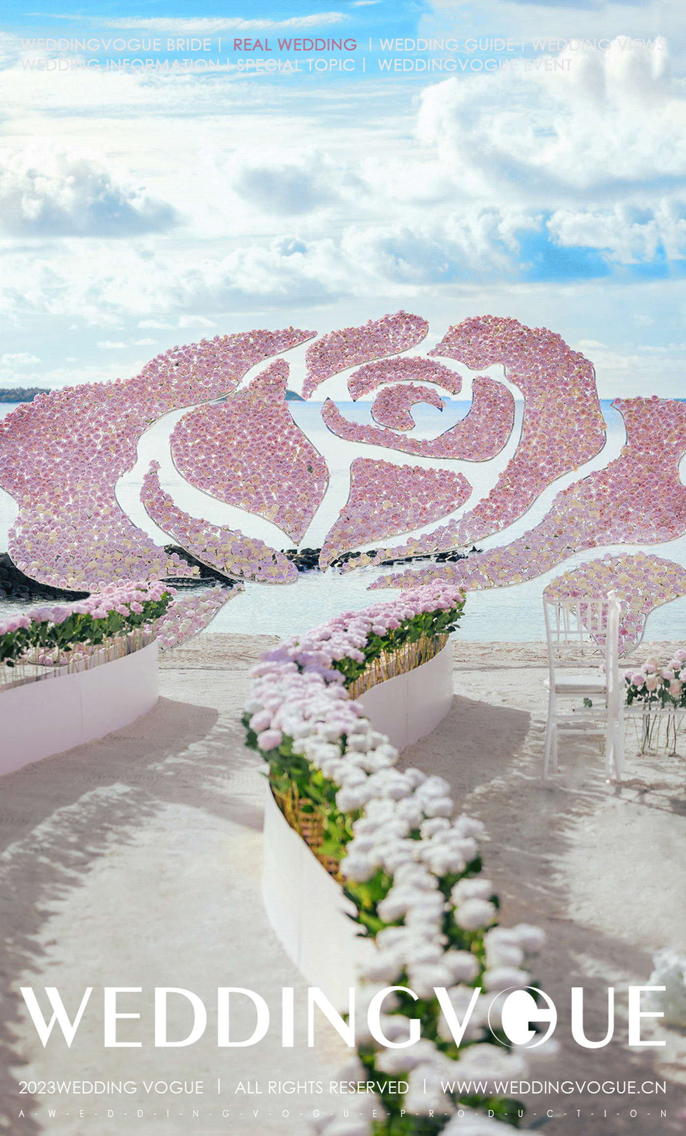 使用过万枝玫瑰,在海岸边为新人搭建出高级精致的婚礼布景