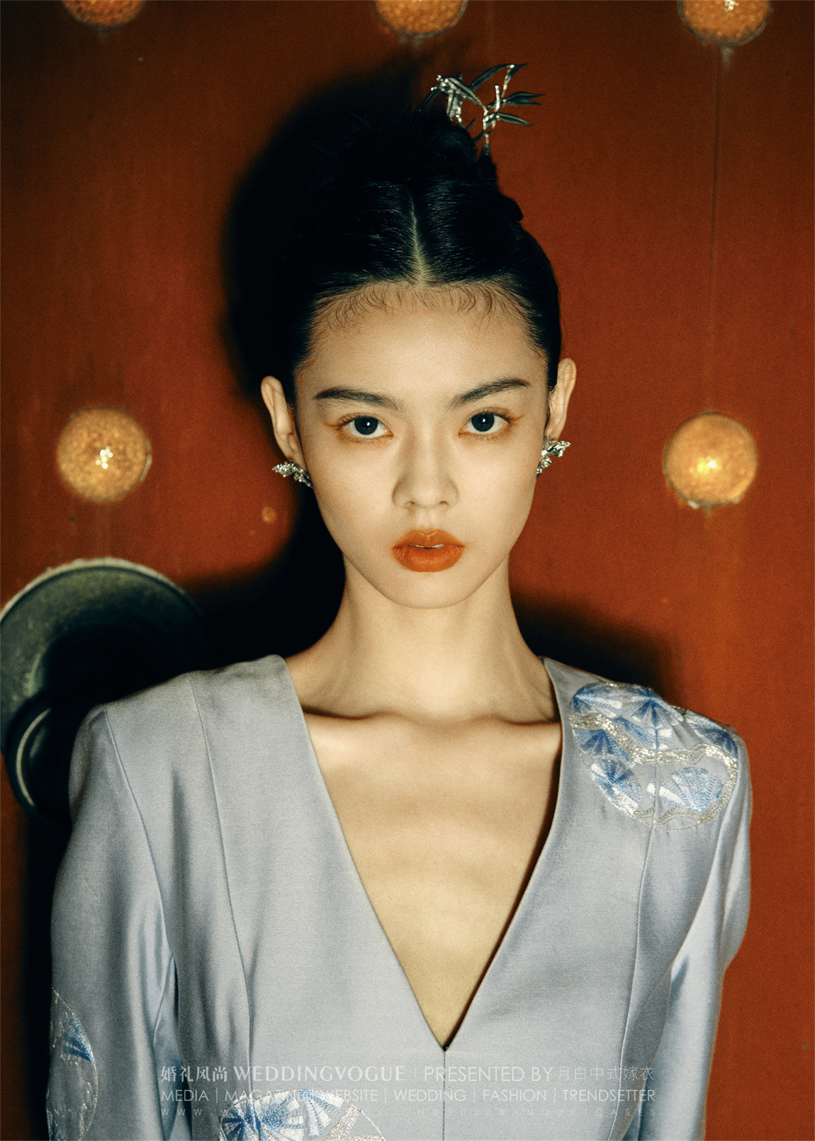 VIGI以及团队的化妆老师,保留了模特的眼睛韵味,以弱化眼妆的形式丢弃了粗黑的眼线妆效,将重点体现在立体的唇部及眉毛妆容之上。同时再结合多套不同风格的中式礼服,利用极简的概念与轻配饰的造型,来表达简约之美。