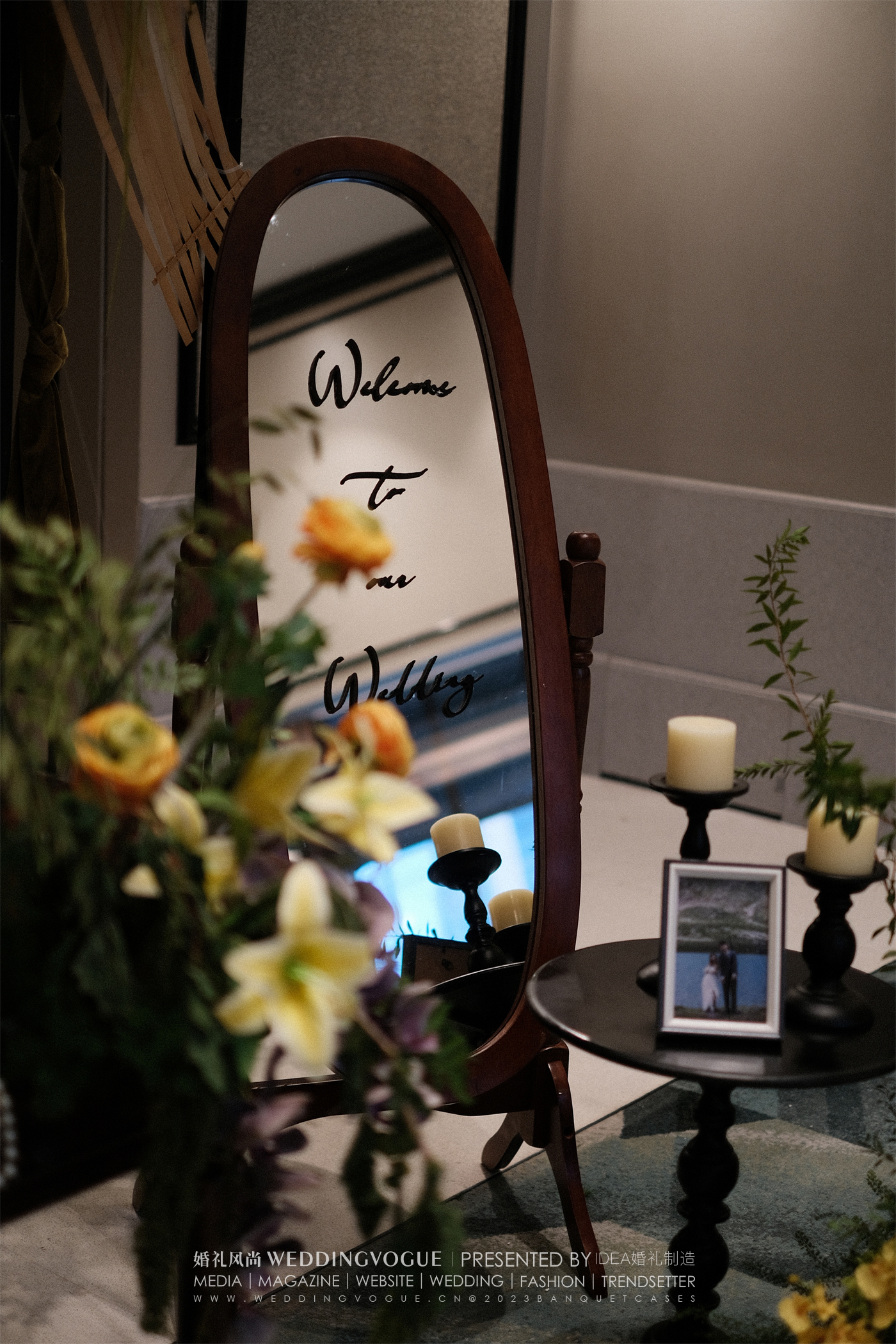 IDEA将新人的合影UV打印在镜子上做成精致的迎宾牌,宾客走进后都被吸引纷纷打卡留念;
