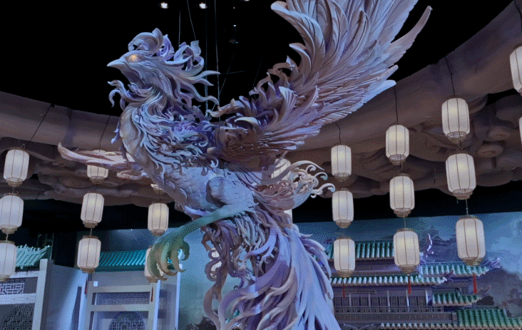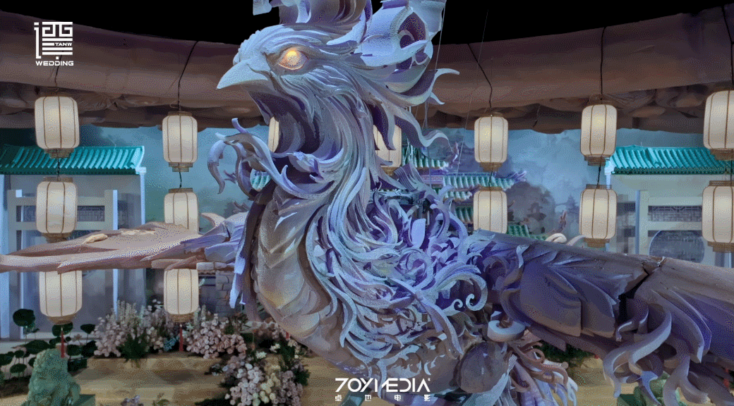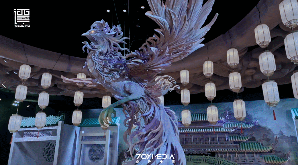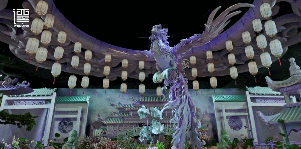 设计师老谭精心设计了动态机械臂装置,与5米5的泡雕凤凰相结合,使整个婚礼现场更加生动和有趣。