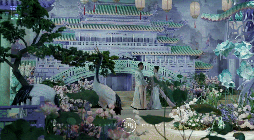 这种设计在国内婚礼上也是首例,设计师用独居匠心的巧思,将中式风格与现代科技进行了完美结合。