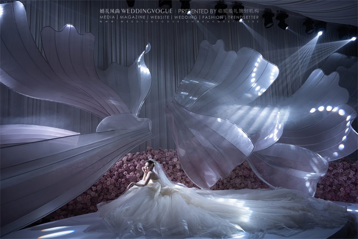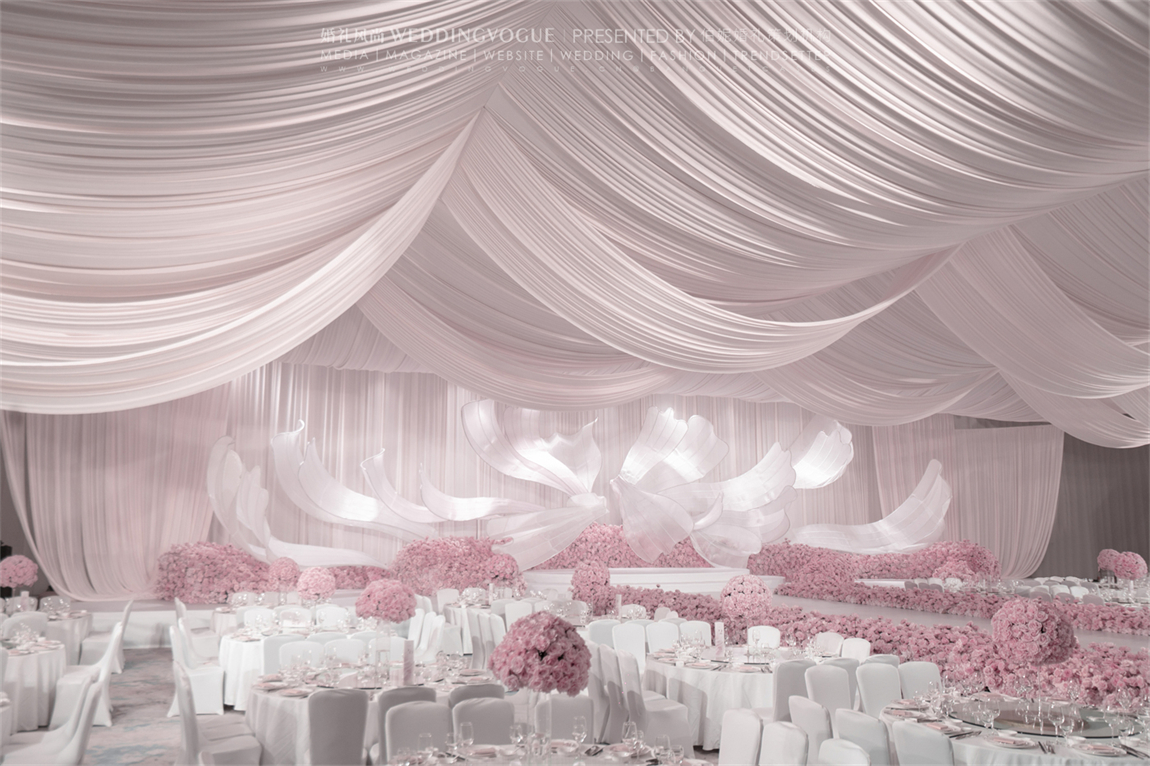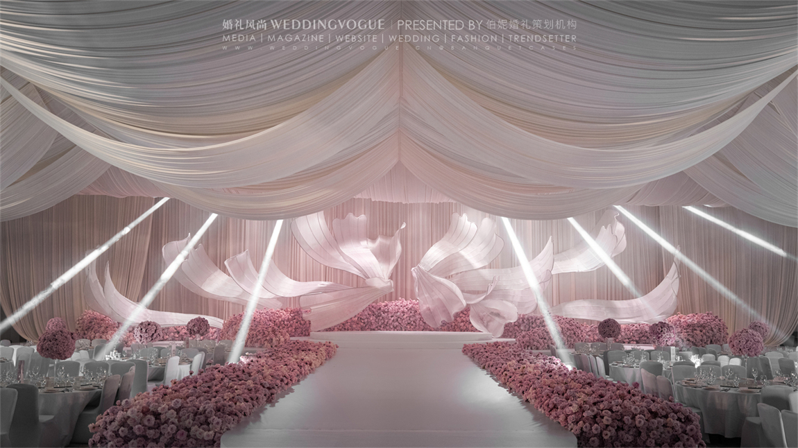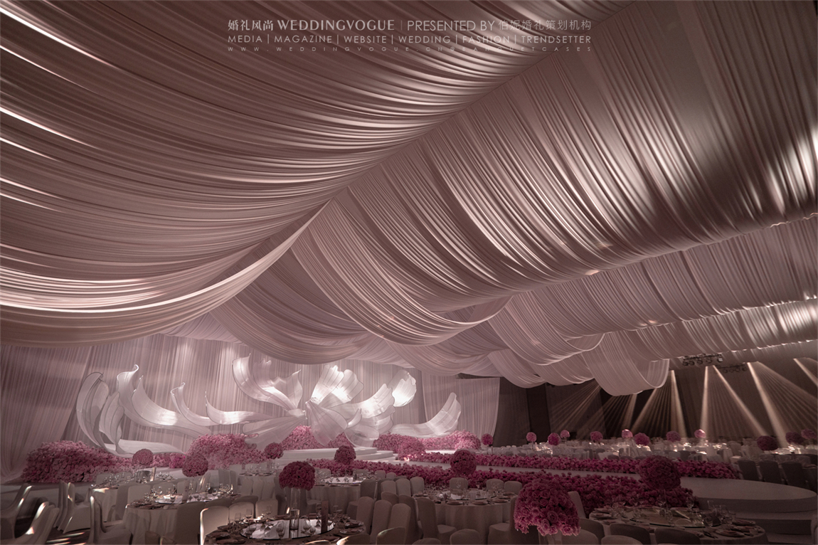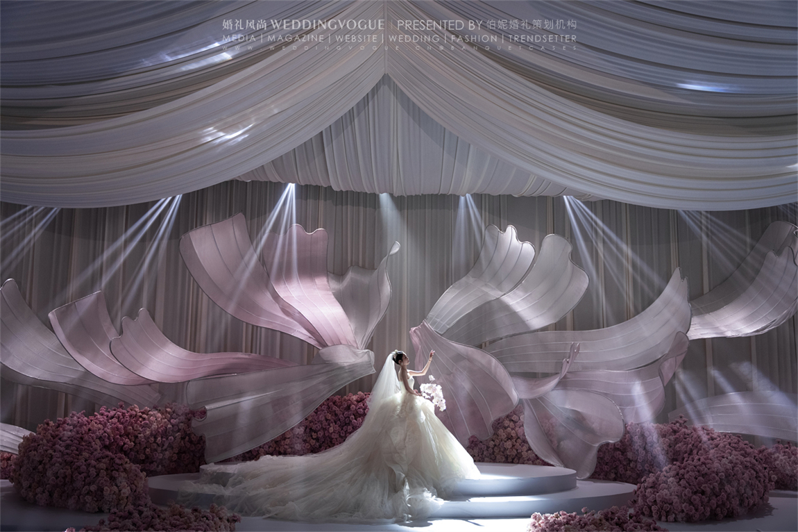 在布幔在婚礼的应用成为常规的当下,伯妮利用酒店空间的特性,将布幔温柔缱绻的质感再次延展,采用全布幔荡顶的舞台设计,让精致的布幔滋生出华丽大气的观感。