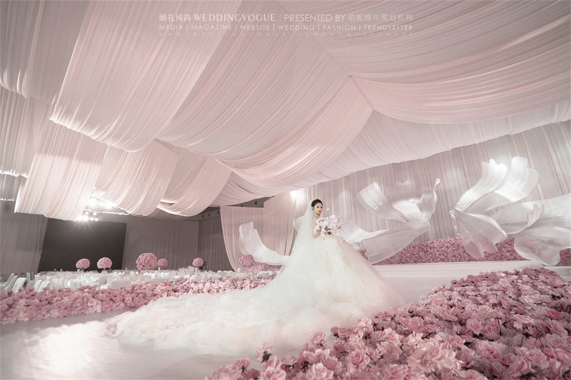 正如伯妮婚礼Bonnie bride一直秉信的理念——重新定义婚礼设计,这场以粉色布幔为设计主体的韩式婚礼,再度让人眼前一亮。
