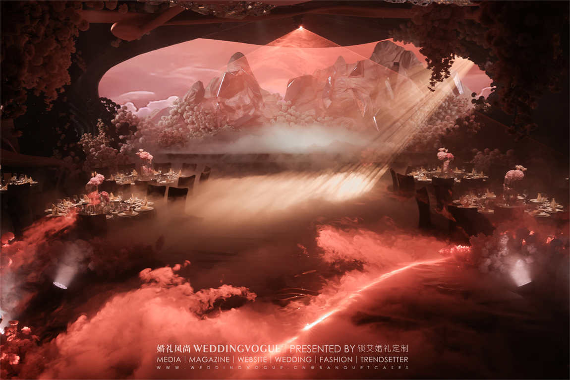 最后以【爱在日落之时,雪山之下】作主题,「落日」、「冰川」、「玫瑰」作元素呈现为细节满满的梦中婚礼。
