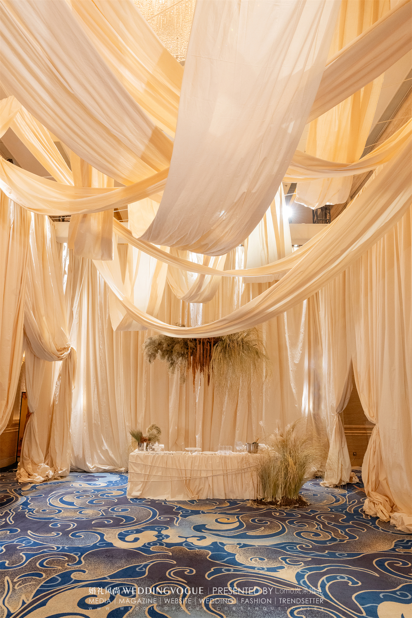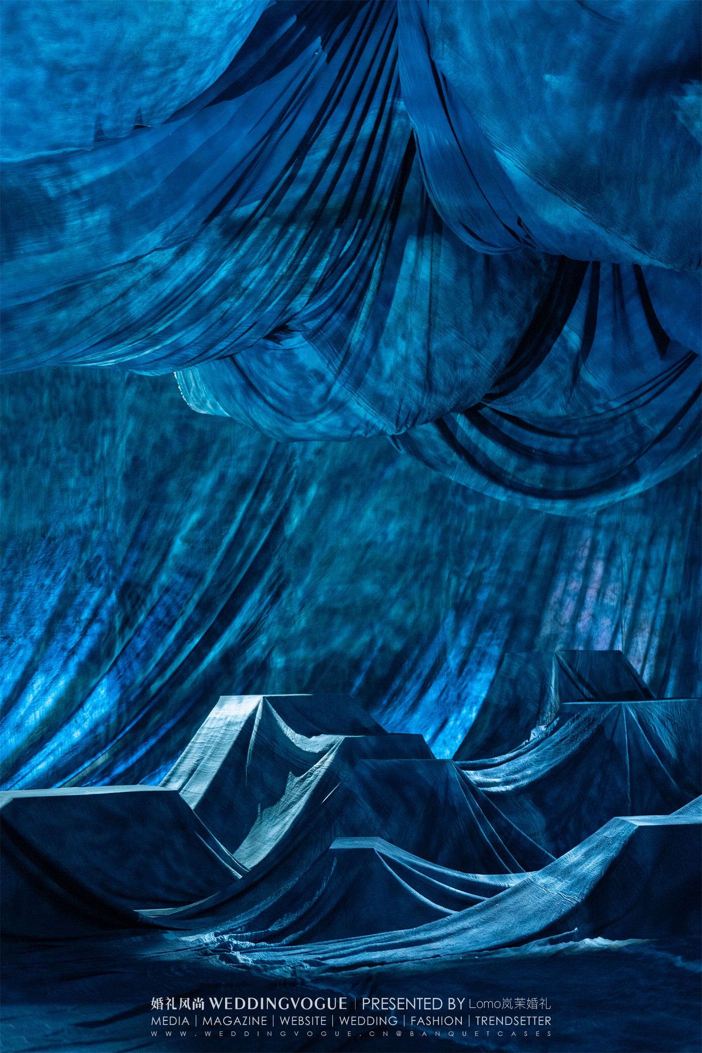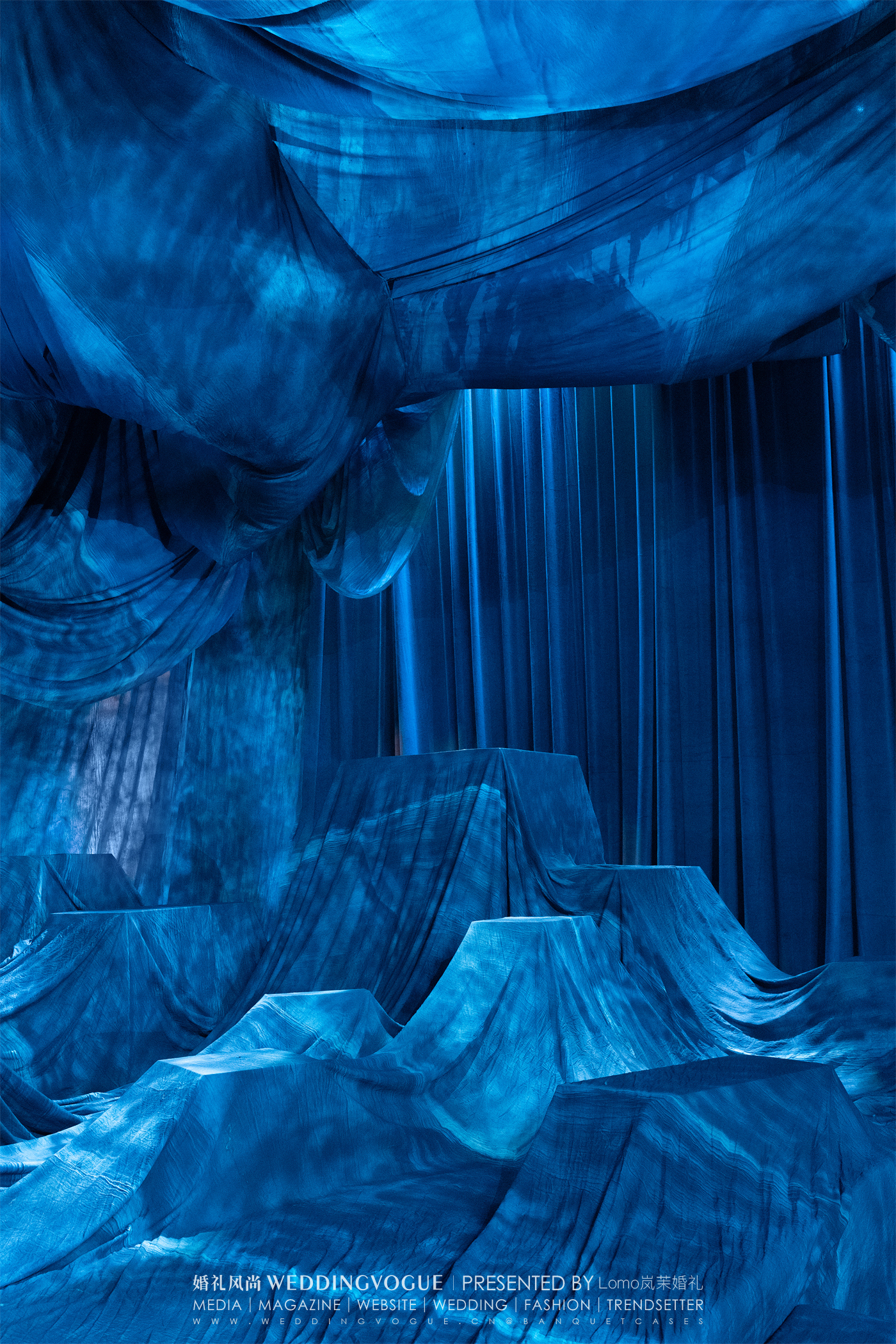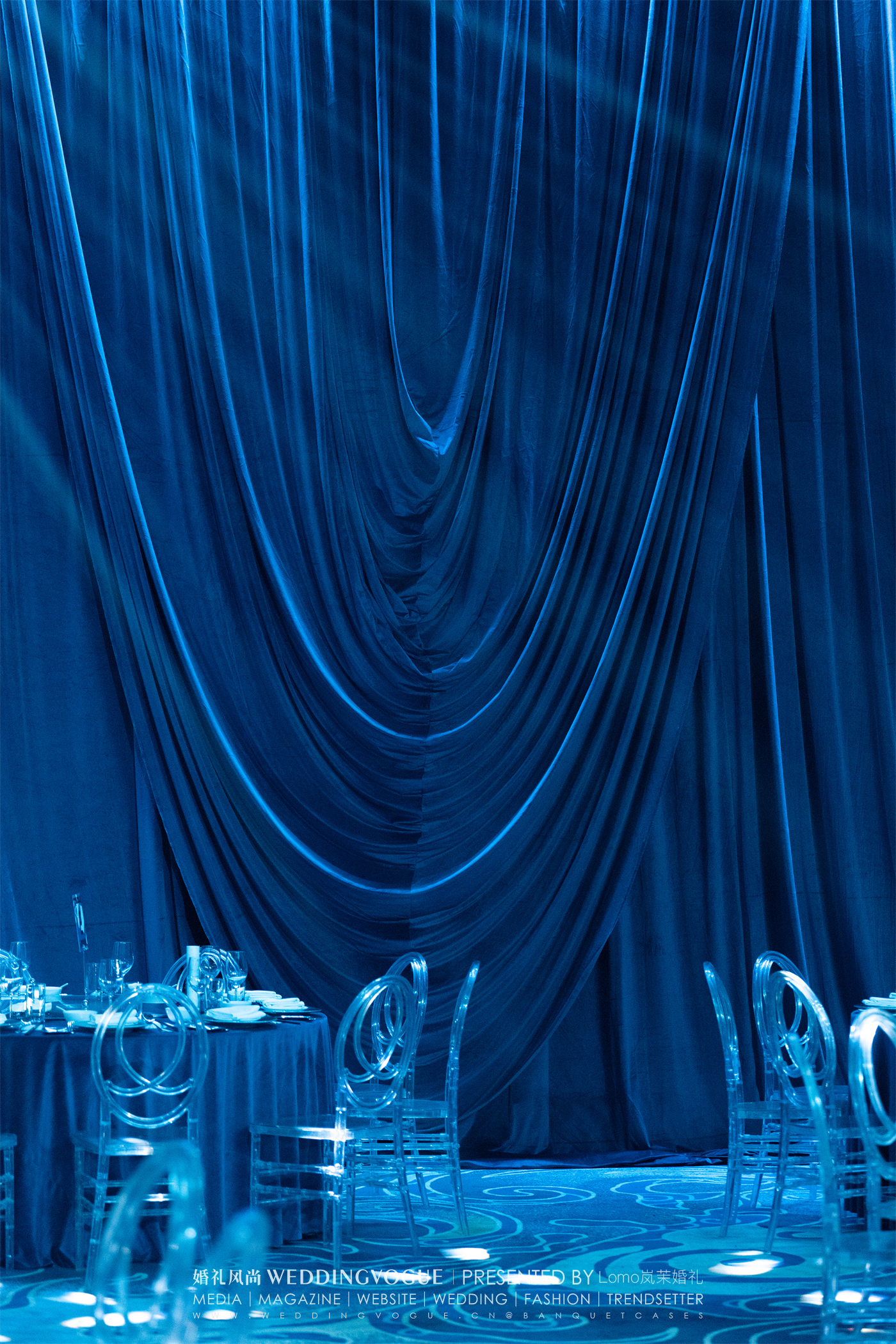 婚礼宴会厅室内以一片承天的蓝色,如烟波浩渺的深海,呈现出如与室外迥然不同的氛围。