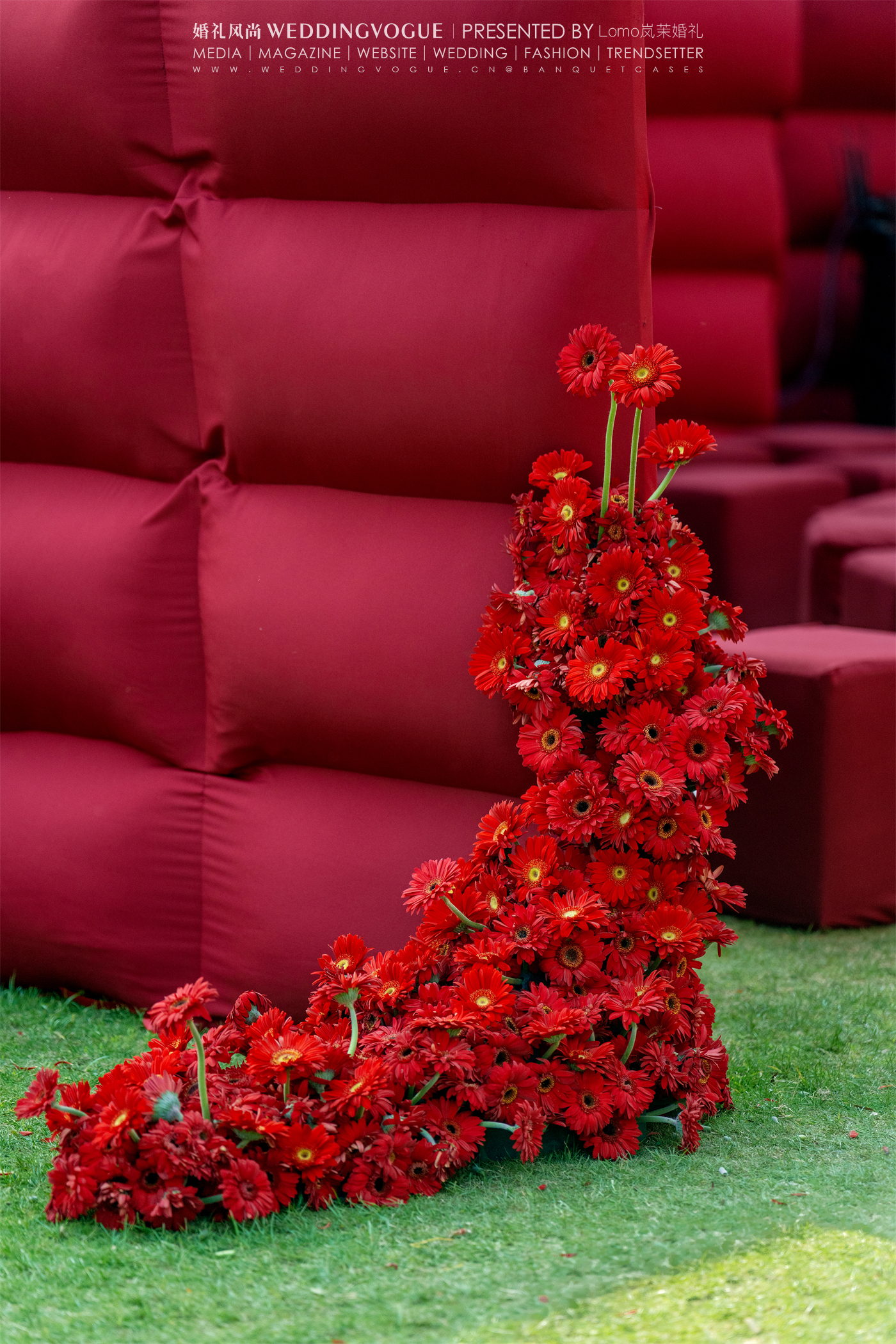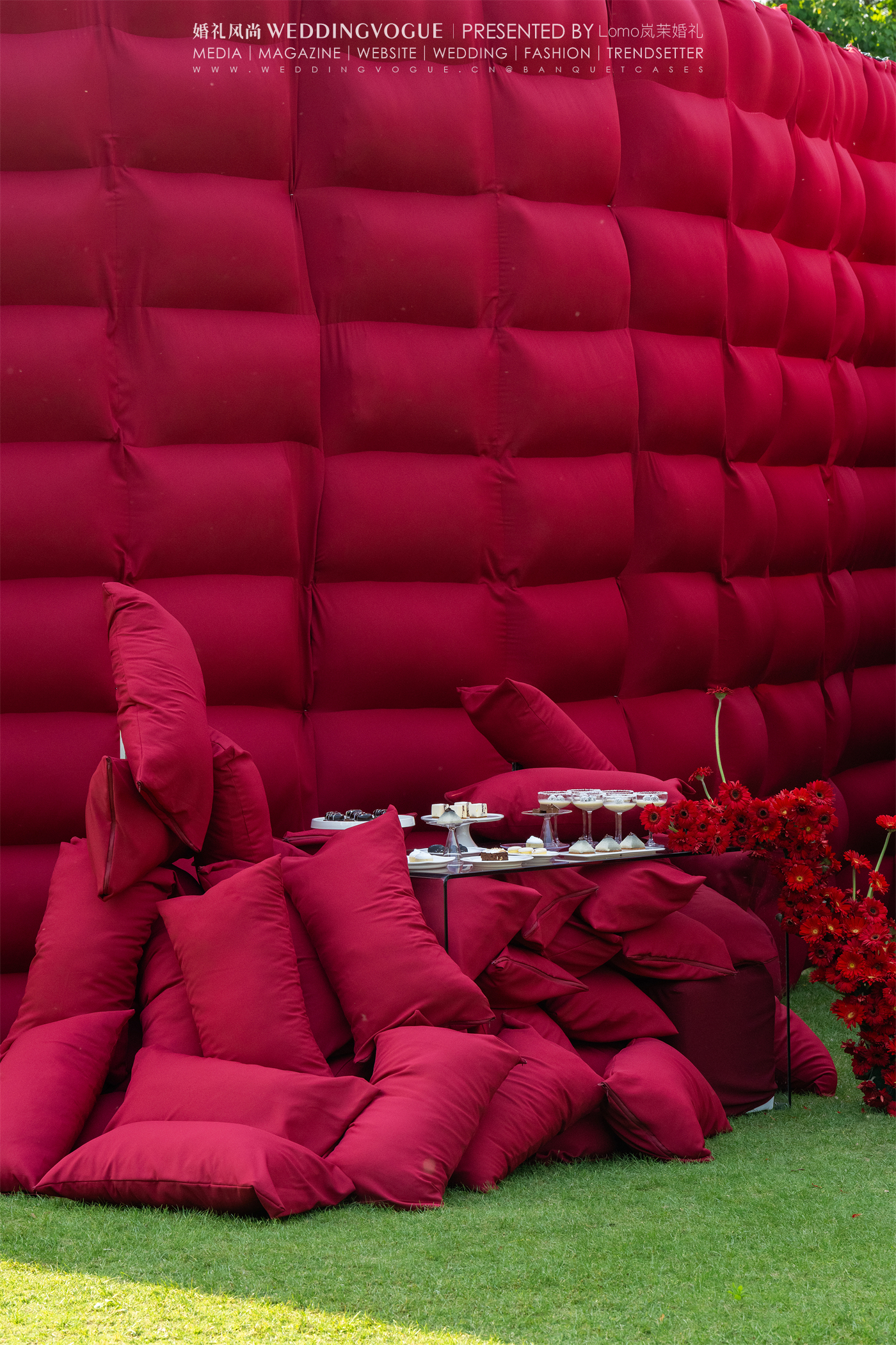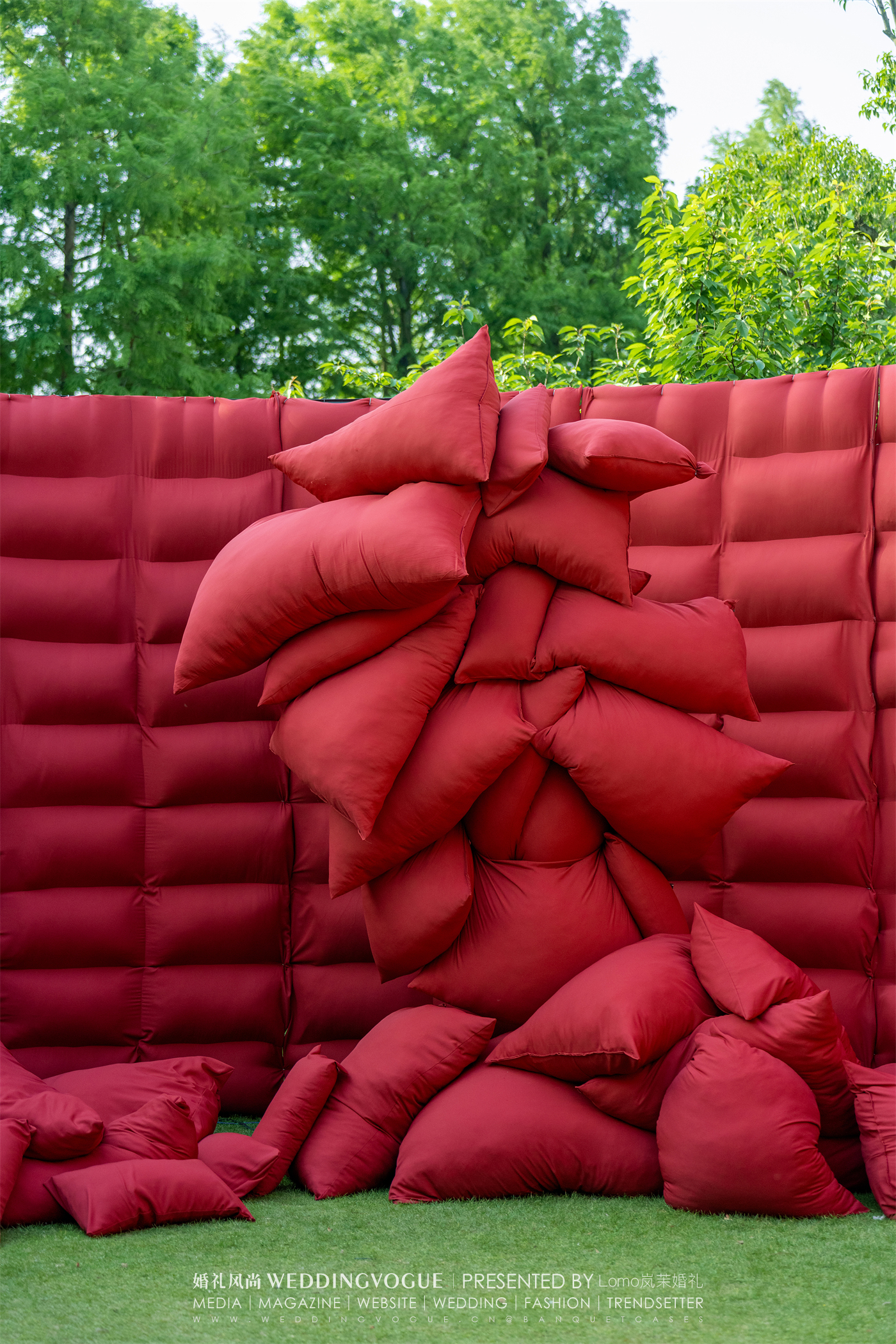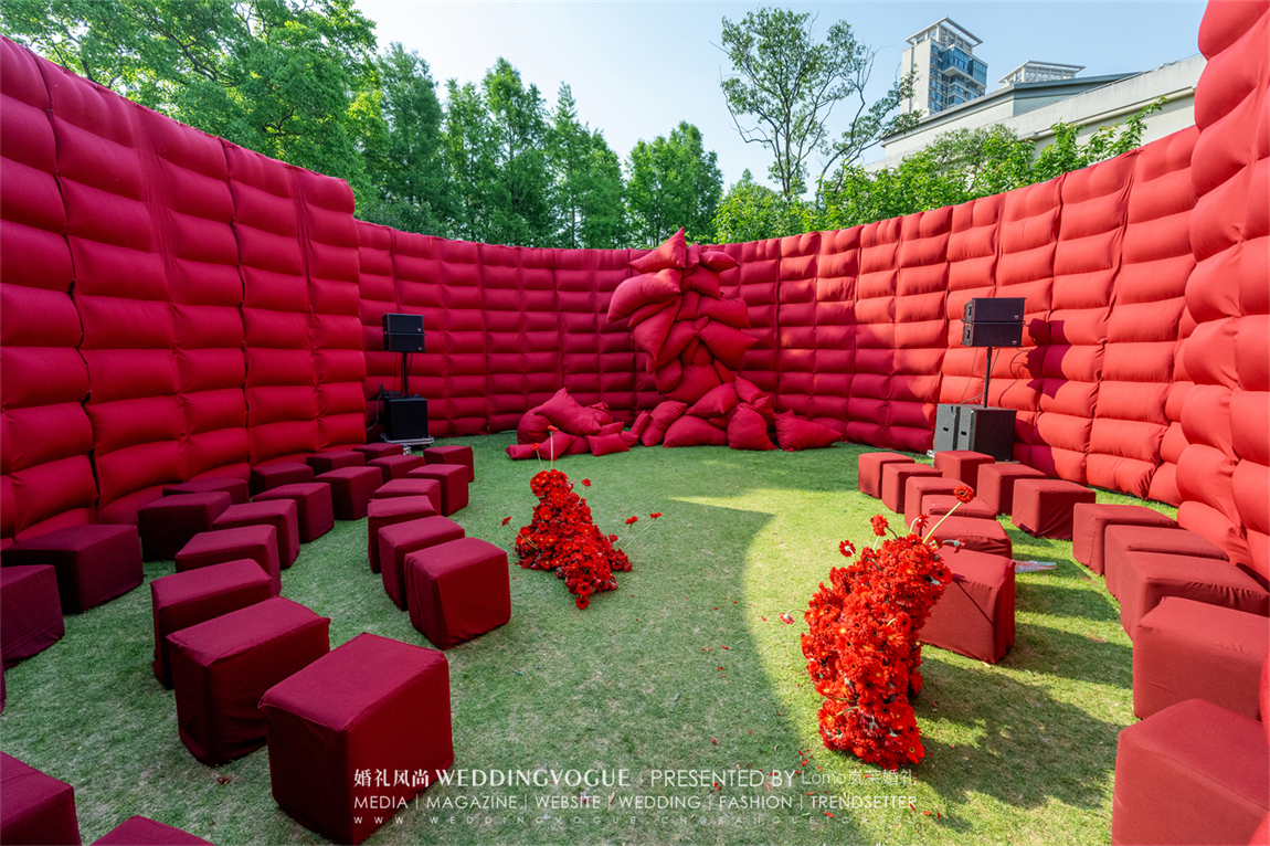 仪式户外设计的部分以热烈的配色,独特的空间布局宛如草坪上巨大的的红色迷宫。