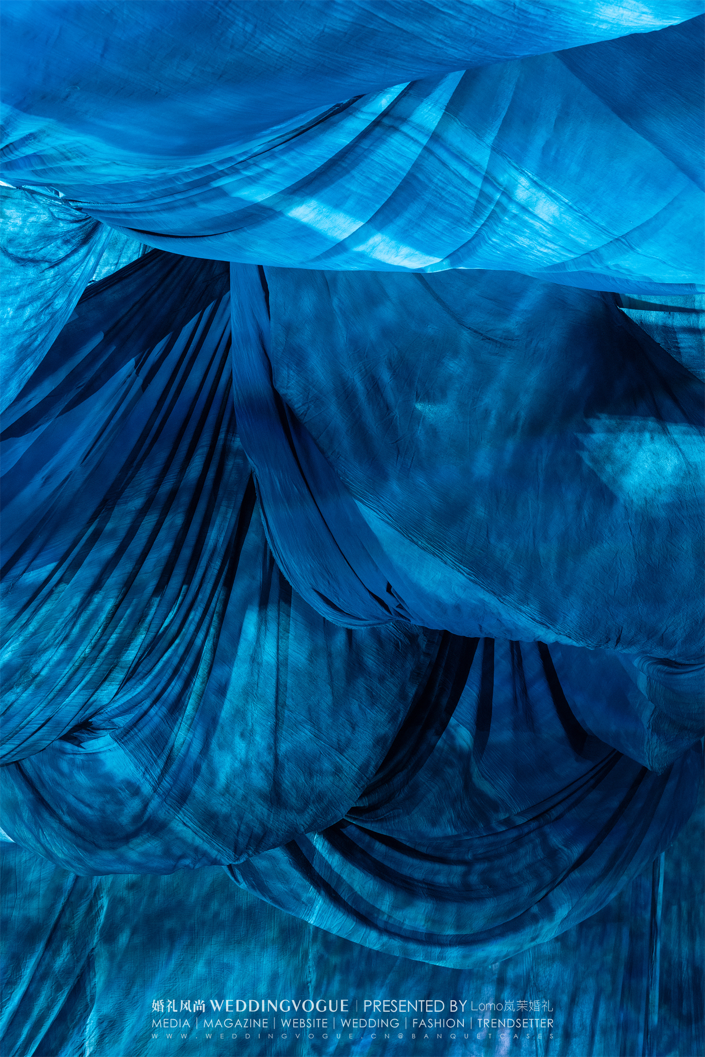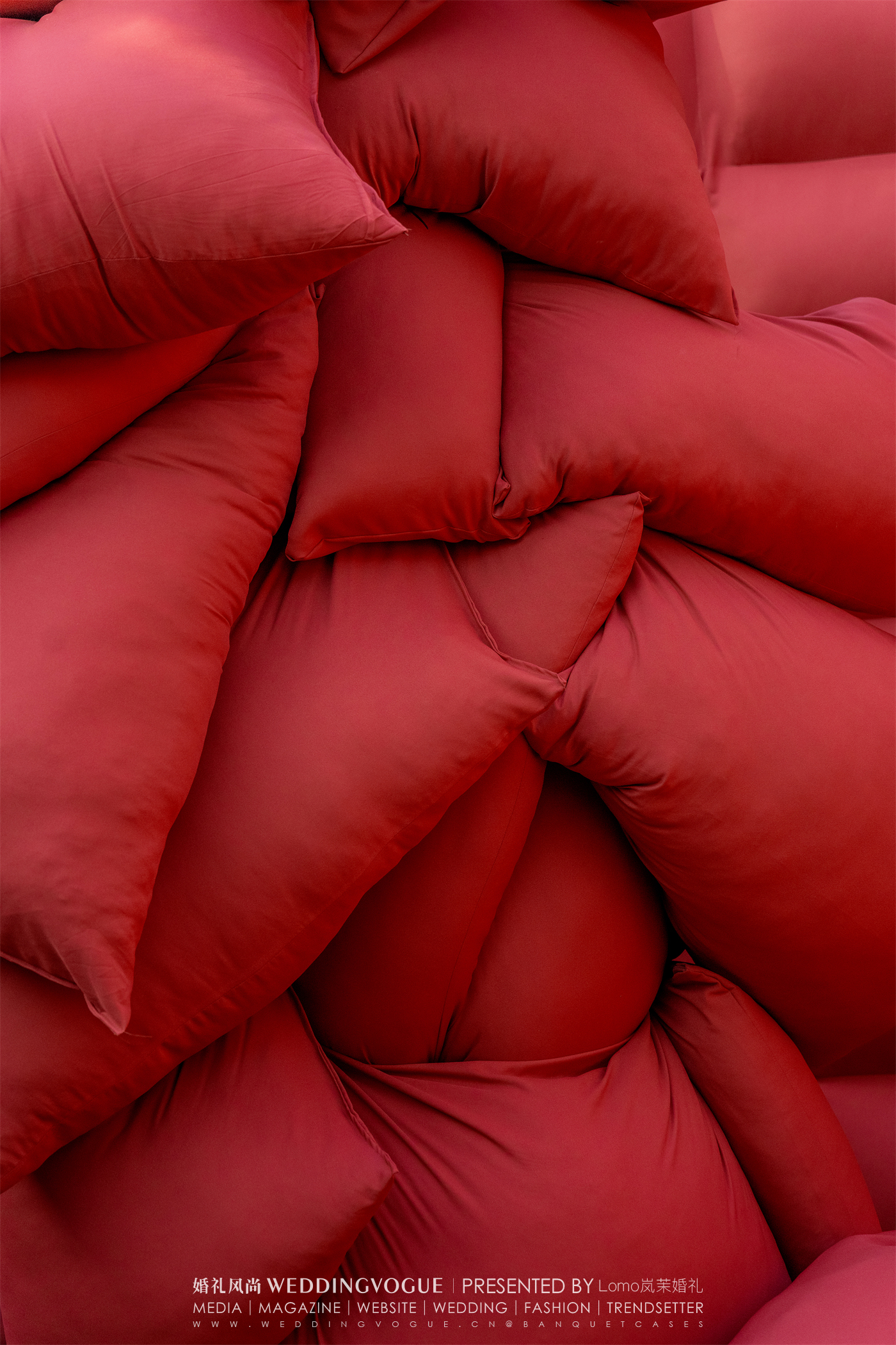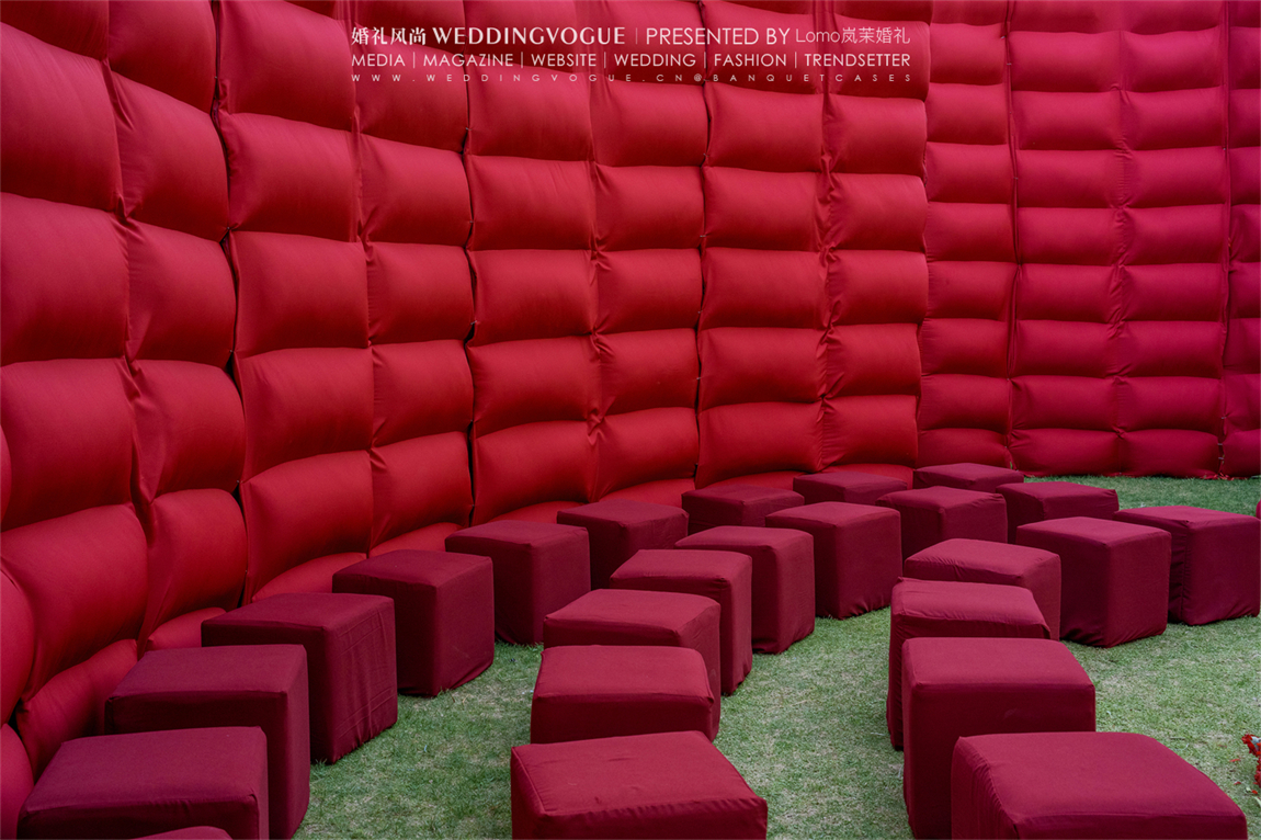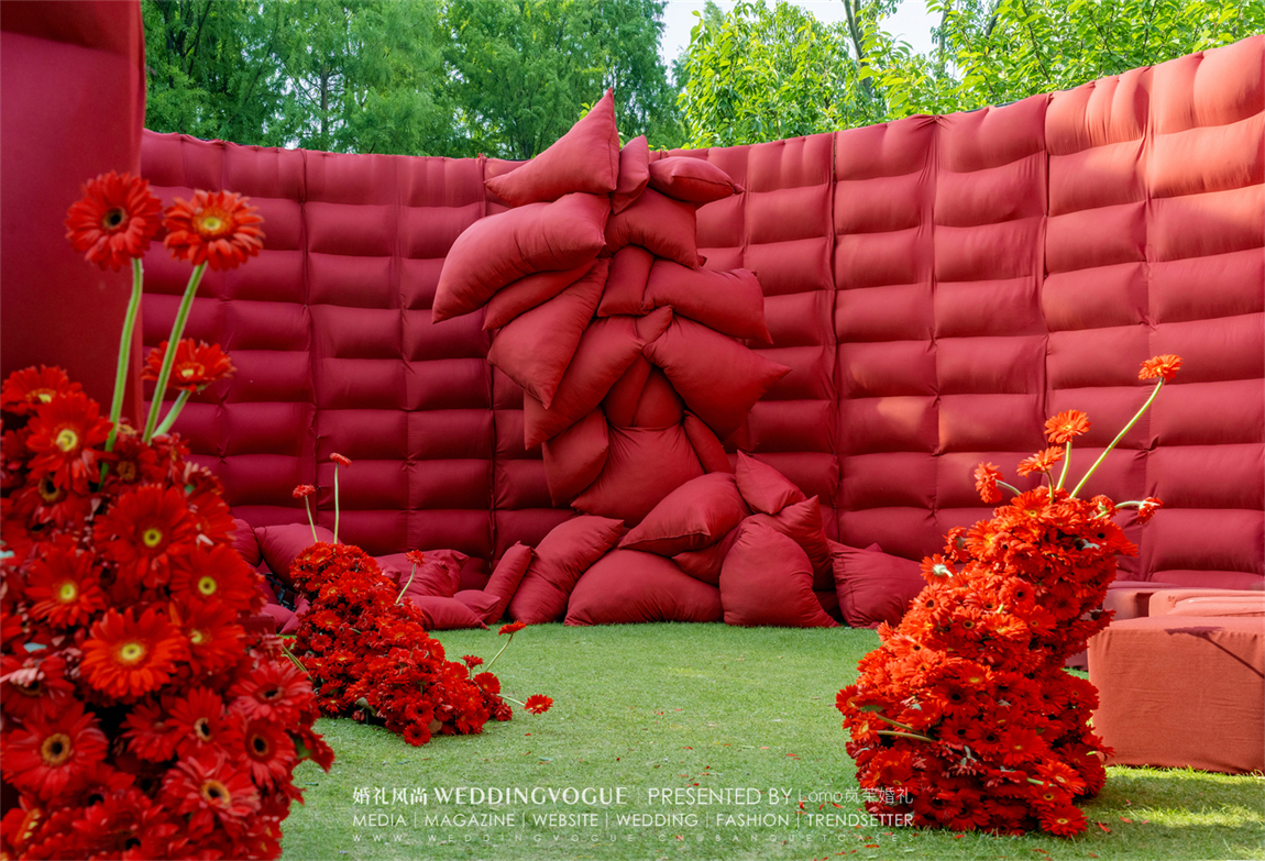 以简洁图形为基本元素,Lomo岚茉婚礼使用大面积胚布——红色,米白、蓝色,便能重组、填充出无尽的想象空镜,彰显出生命的张力。