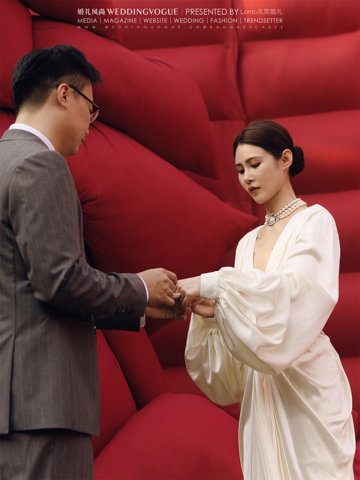 在「Lomo岚茉婚礼」这一场独特的婚礼中,以红、米白、蓝的配色,沉浸式布景构建氛围。在打造新人审美外化的同时,闪回为一段生命长河的蒙太奇。