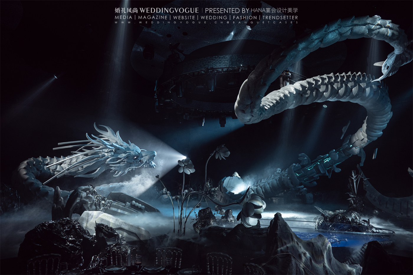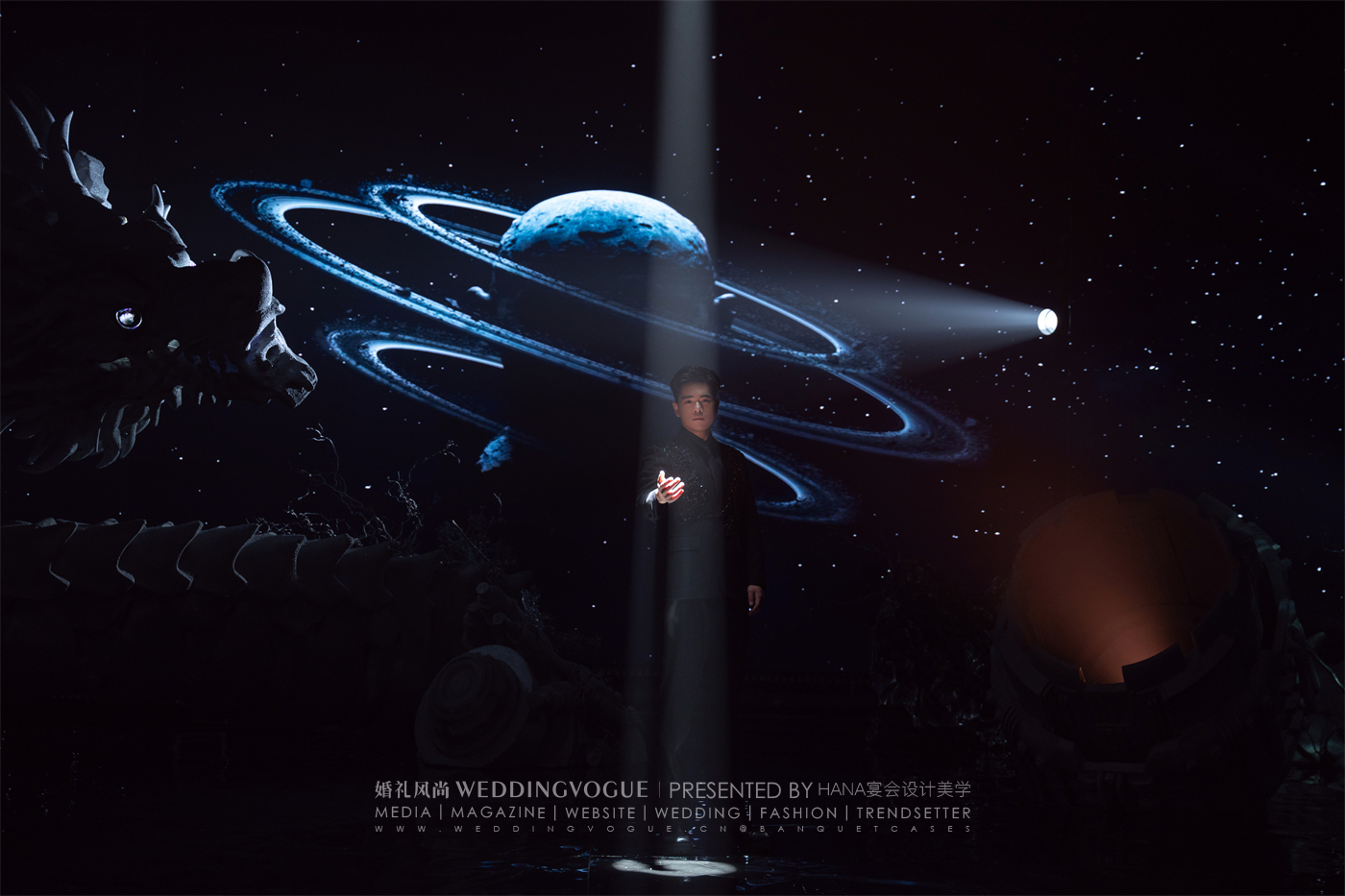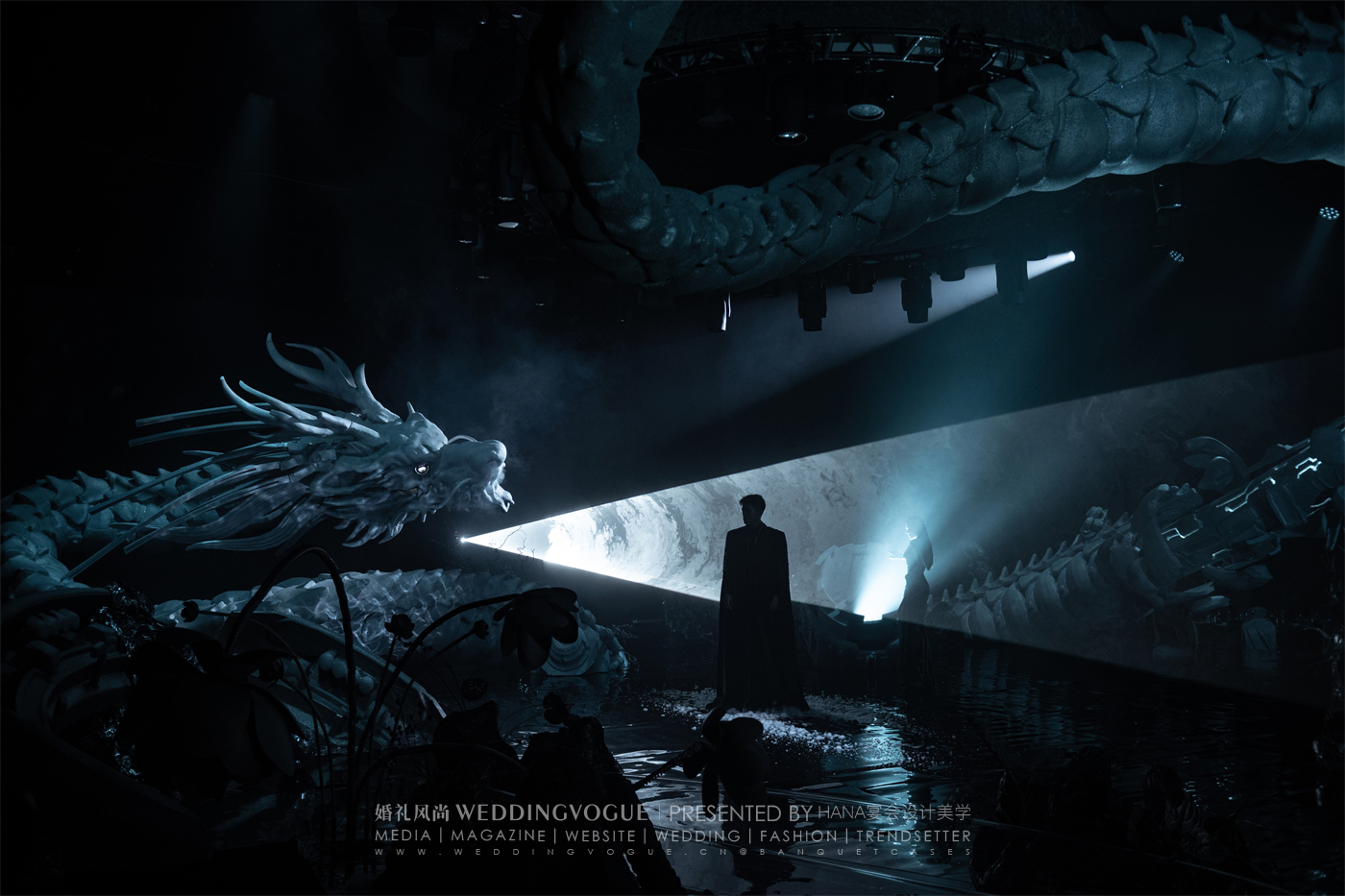 步入宴会厅内,以35米巨龙腾飞为标志,仿佛走进了一部科幻大片,每一个细节都让人赞叹不已,婚礼现场无论从哪个角度观看,都充满了无与伦比的震撼感。