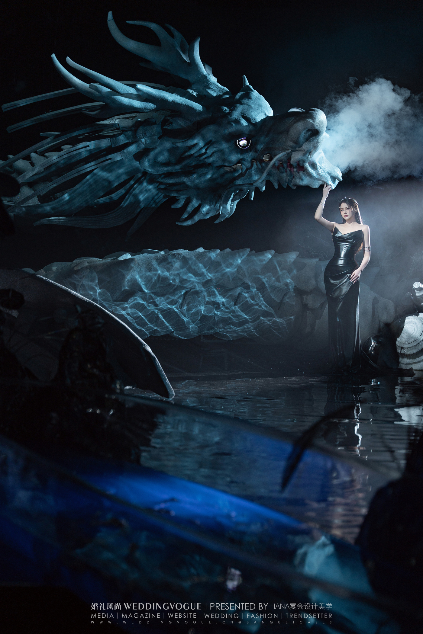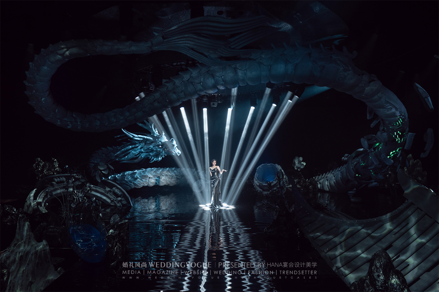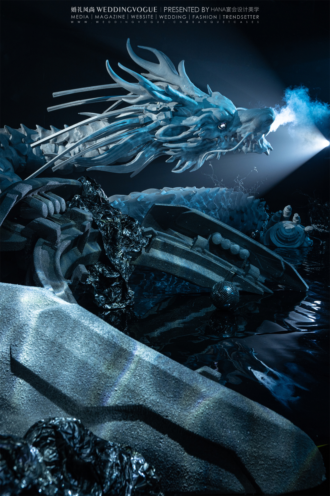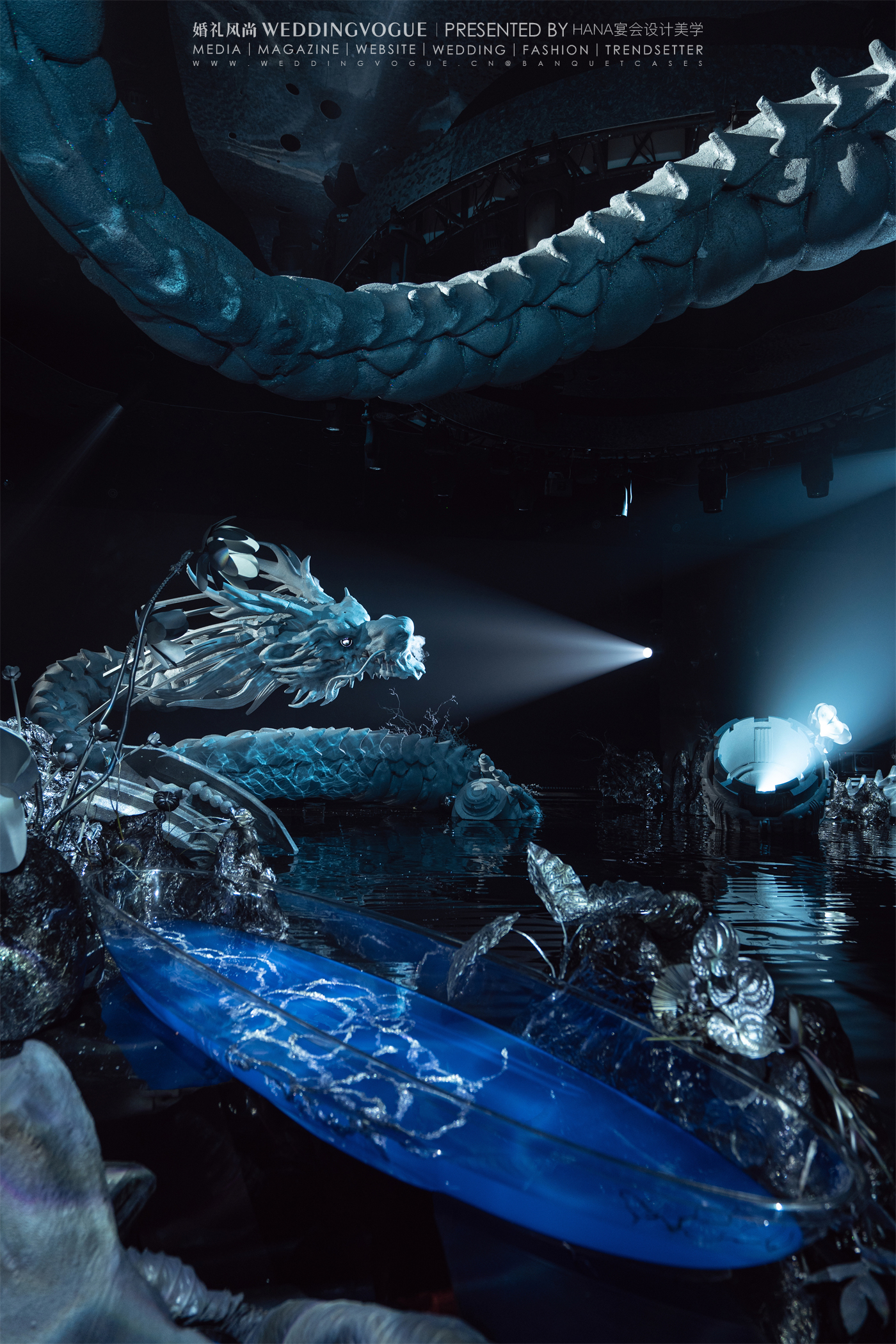 步入宴会厅内,以35米巨龙腾飞为标志,仿佛走进了一部科幻大片,每一个细节都让人赞叹不已,婚礼现场无论从哪个角度观看,都充满了无与伦比的震撼感。