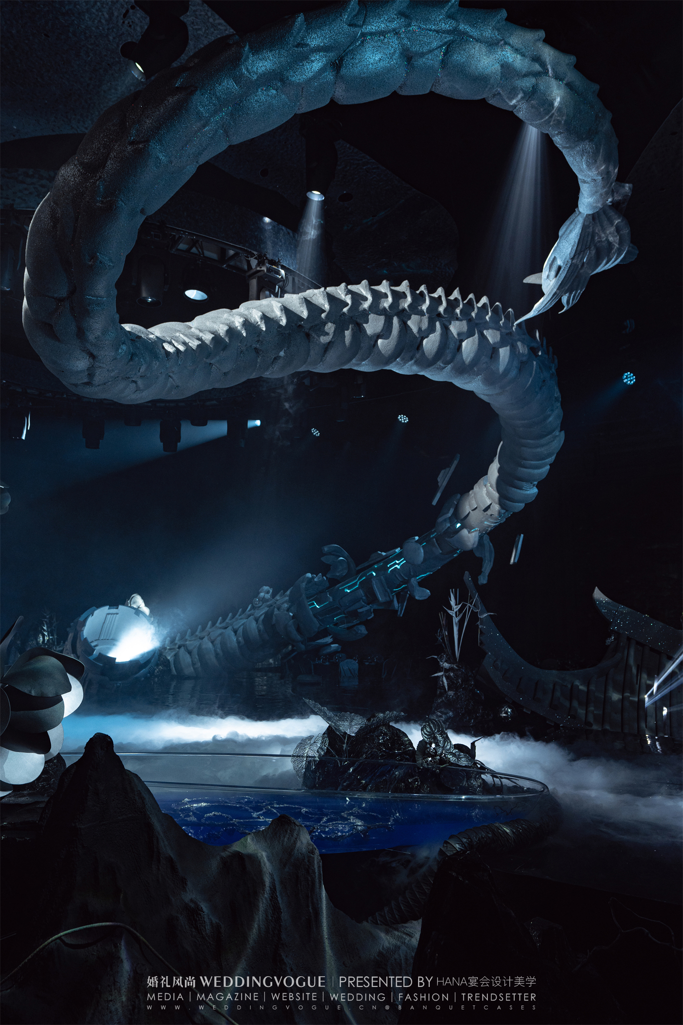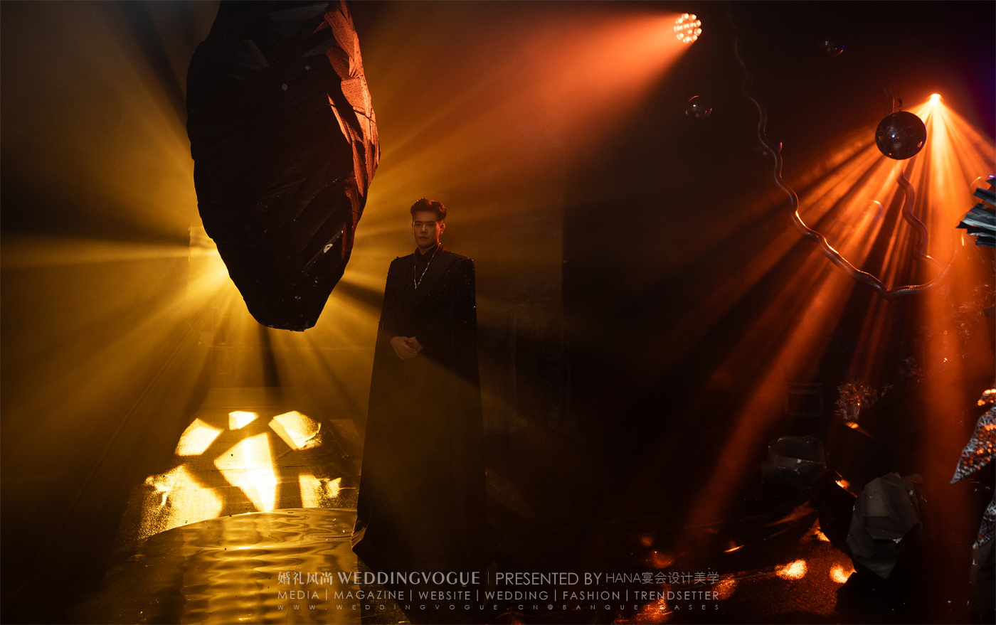 这场婚礼最开始设计了好几稿方案,从一开始的红黑色熔岩岩浆到类似“魔界”的场景打造,后来又结合了王座、废墟城堡等设计理念,