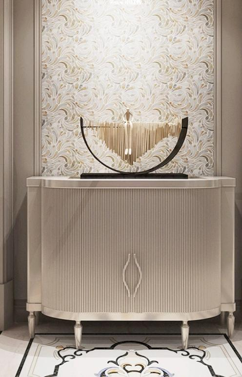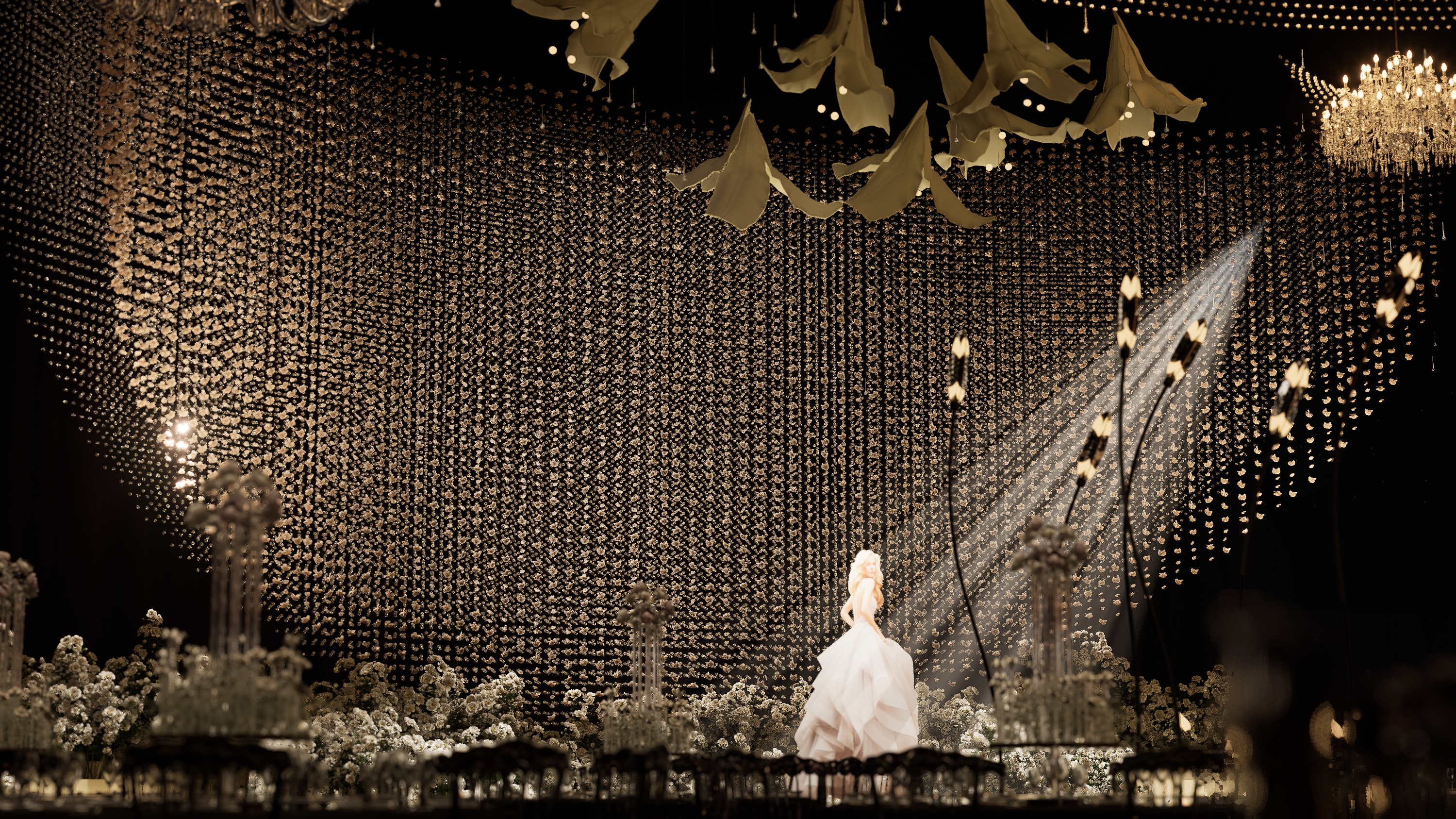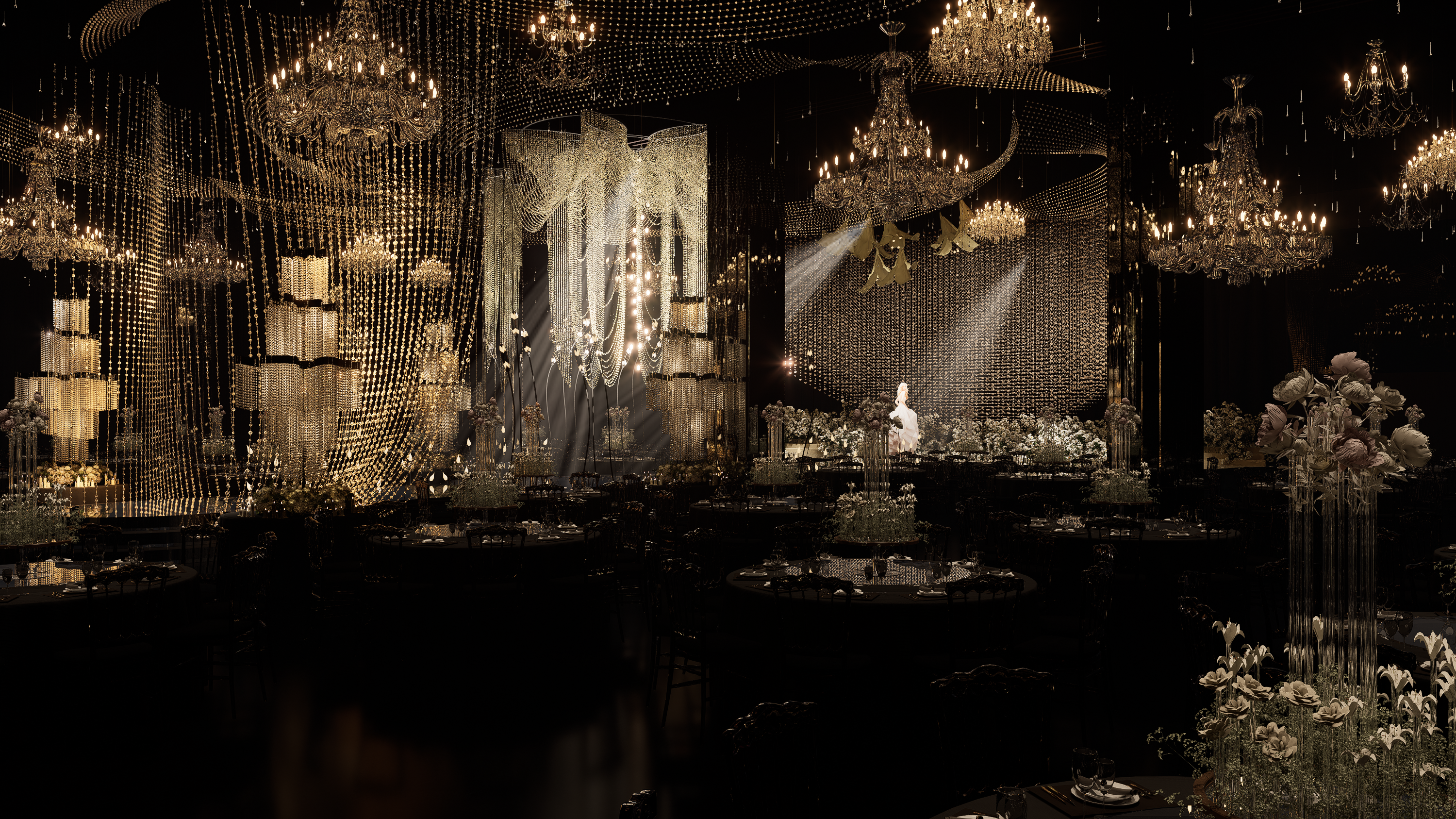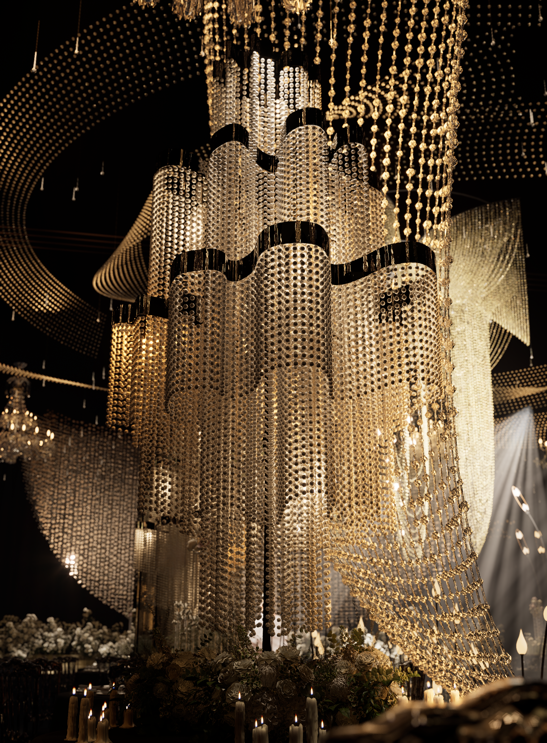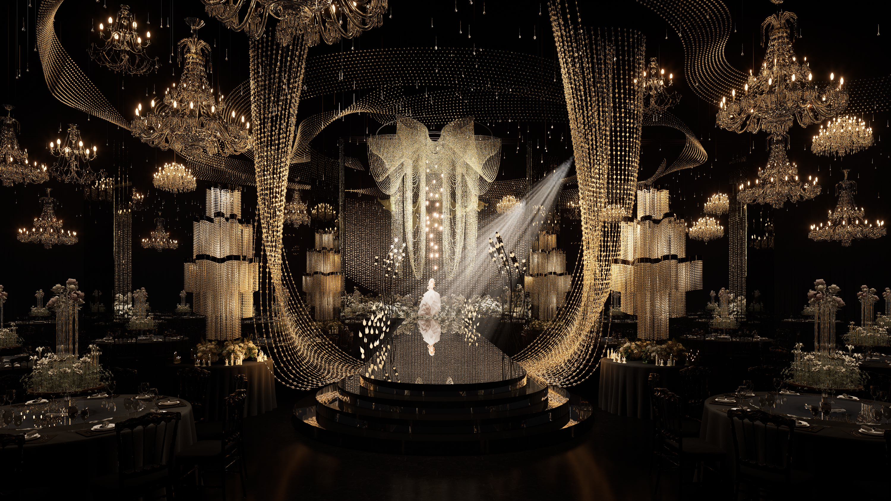 以高贵的香槟金和宁静素雅的珍珠白作为主色调,充满艺术感的水晶吊灯造型布局,将水晶如帷幔般柔美展开,感受高贵优雅之感。