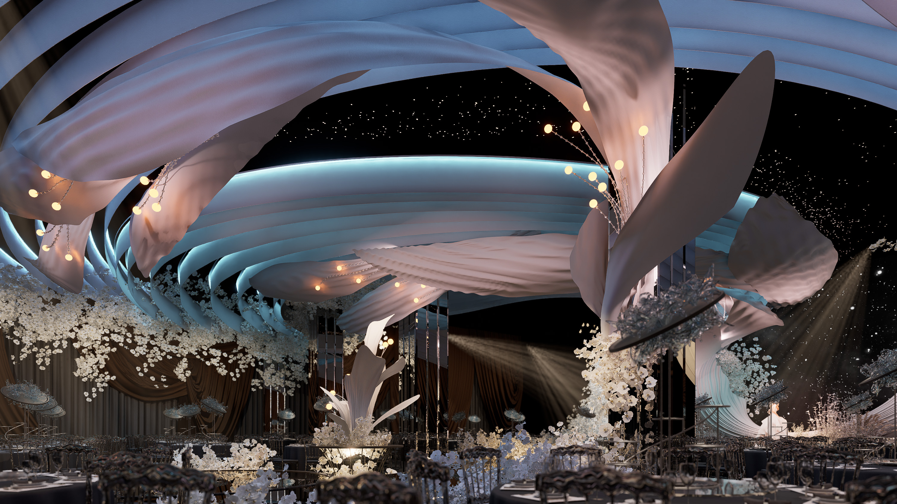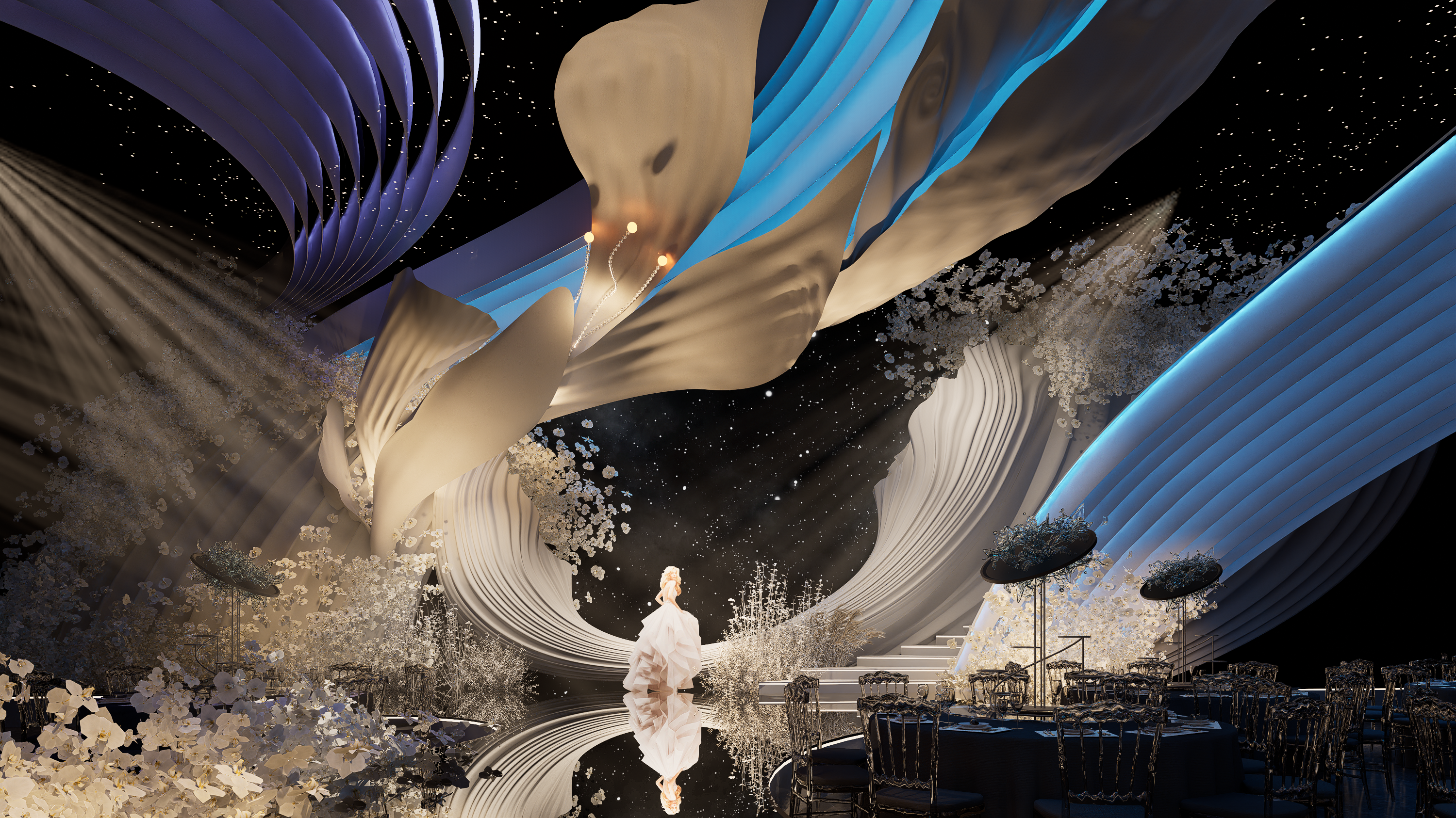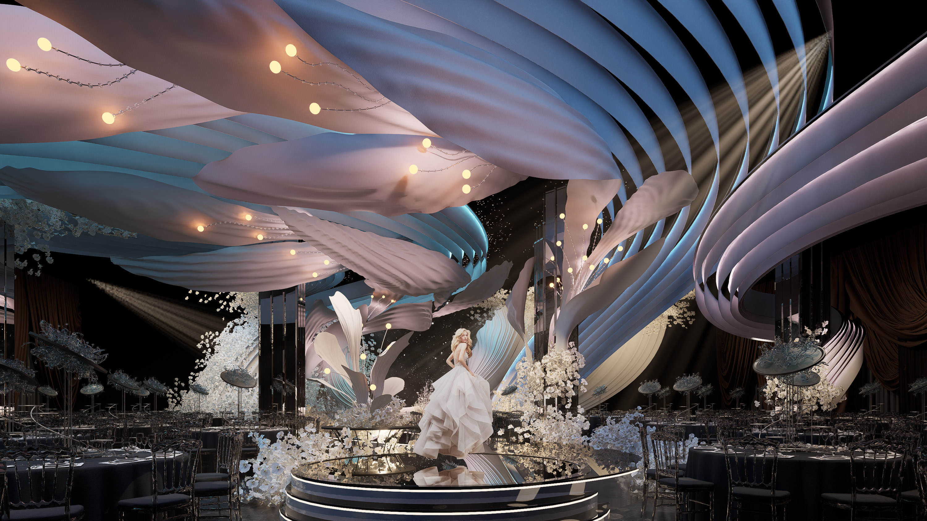 李远杭将宴会空间设计成一场现代艺术展,在通透的现代感上,以“海浪”构建出“无形之美”,无边无际,浪漫自由。